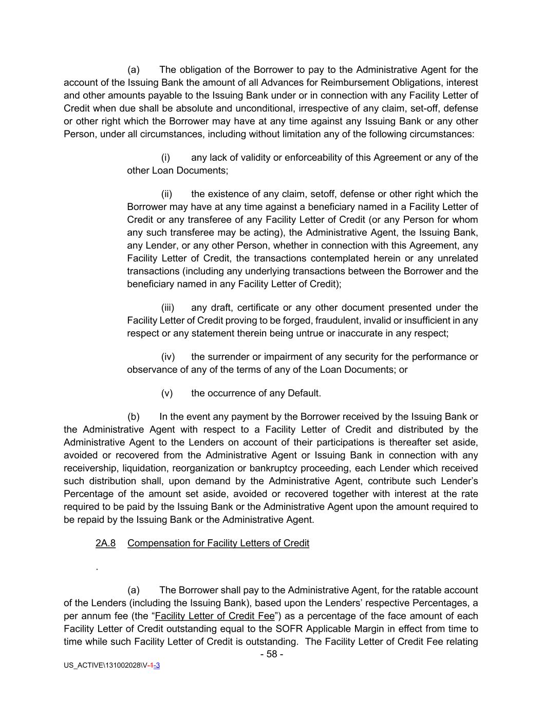 - 58 - US_ACTIVE\131002028\V-1-3 (a) The obligation of the Borrower to pay to the Administrative Agent for the account of the Issuing Bank the amount of all Advances for Reimbursement Obligations, interest and other amounts payable to the Issuing Bank under or in connection with any Facility Letter of Credit when due shall be absolute and unconditional, irrespective of any claim, set-off, defense or other right which the Borrower may have at any time against any Issuing Bank or any other Person, under all circumstances, including without limitation any of the following circumstances: (i) any lack of validity or enforceability of this Agreement or any of the other Loan Documents; (ii) the existence of any claim, setoff, defense or other right which the Borrower may have at any time against a beneficiary named in a Facility Letter of Credit or any transferee of any Facility Letter of Credit (or any Person for whom any such transferee may be acting), the Administrative Agent, the Issuing Bank, any Lender, or any other Person, whether in connection with this Agreement, any Facility Letter of Credit, the transactions contemplated herein or any unrelated transactions (including any underlying transactions between the Borrower and the beneficiary named in any Facility Letter of Credit); (iii) any draft, certificate or any other document presented under the Facility Letter of Credit proving to be forged, fraudulent, invalid or insufficient in any respect or any statement therein being untrue or inaccurate in any respect; (iv) the surrender or impairment of any security for the performance or observance of any of the terms of any of the Loan Documents; or (v) the occurrence of any Default. (b) In the event any payment by the Borrower received by the Issuing Bank or the Administrative Agent with respect to a Facility Letter of Credit and distributed by the Administrative Agent to the Lenders on account of their participations is thereafter set aside, avoided or recovered from the Administrative Agent or Issuing Bank in connection with any receivership, liquidation, reorganization or bankruptcy proceeding, each Lender which received such distribution shall, upon demand by the Administrative Agent, contribute such Lender’s Percentage of the amount set aside, avoided or recovered together with interest at the rate required to be paid by the Issuing Bank or the Administrative Agent upon the amount required to be repaid by the Issuing Bank or the Administrative Agent. 2A.8 Compensation for Facility Letters of Credit . (a) The Borrower shall pay to the Administrative Agent, for the ratable account of the Lenders (including the Issuing Bank), based upon the Lenders’ respective Percentages, a per annum fee (the “Facility Letter of Credit Fee”) as a percentage of the face amount of each Facility Letter of Credit outstanding equal to the SOFR Applicable Margin in effect from time to time while such Facility Letter of Credit is outstanding. The Facility Letter of Credit Fee relating