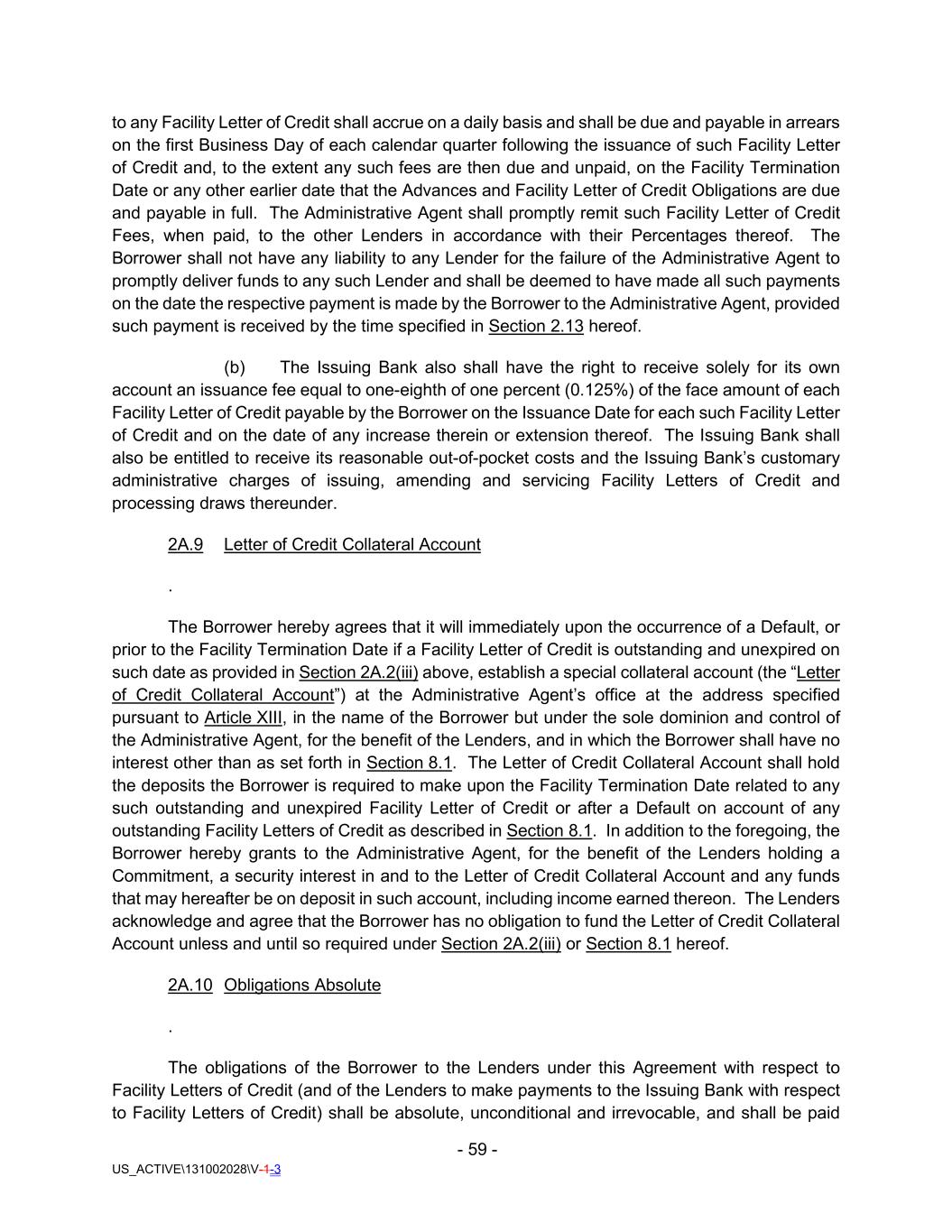 - 59 - US_ACTIVE\131002028\V-1-3 to any Facility Letter of Credit shall accrue on a daily basis and shall be due and payable in arrears on the first Business Day of each calendar quarter following the issuance of such Facility Letter of Credit and, to the extent any such fees are then due and unpaid, on the Facility Termination Date or any other earlier date that the Advances and Facility Letter of Credit Obligations are due and payable in full. The Administrative Agent shall promptly remit such Facility Letter of Credit Fees, when paid, to the other Lenders in accordance with their Percentages thereof. The Borrower shall not have any liability to any Lender for the failure of the Administrative Agent to promptly deliver funds to any such Lender and shall be deemed to have made all such payments on the date the respective payment is made by the Borrower to the Administrative Agent, provided such payment is received by the time specified in Section 2.13 hereof. (b) The Issuing Bank also shall have the right to receive solely for its own account an issuance fee equal to one-eighth of one percent (0.125%) of the face amount of each Facility Letter of Credit payable by the Borrower on the Issuance Date for each such Facility Letter of Credit and on the date of any increase therein or extension thereof. The Issuing Bank shall also be entitled to receive its reasonable out-of-pocket costs and the Issuing Bank’s customary administrative charges of issuing, amending and servicing Facility Letters of Credit and processing draws thereunder. 2A.9 Letter of Credit Collateral Account . The Borrower hereby agrees that it will immediately upon the occurrence of a Default, or prior to the Facility Termination Date if a Facility Letter of Credit is outstanding and unexpired on such date as provided in Section 2A.2(iii) above, establish a special collateral account (the “Letter of Credit Collateral Account”) at the Administrative Agent’s office at the address specified pursuant to Article XIII, in the name of the Borrower but under the sole dominion and control of the Administrative Agent, for the benefit of the Lenders, and in which the Borrower shall have no interest other than as set forth in Section 8.1. The Letter of Credit Collateral Account shall hold the deposits the Borrower is required to make upon the Facility Termination Date related to any such outstanding and unexpired Facility Letter of Credit or after a Default on account of any outstanding Facility Letters of Credit as described in Section 8.1. In addition to the foregoing, the Borrower hereby grants to the Administrative Agent, for the benefit of the Lenders holding a Commitment, a security interest in and to the Letter of Credit Collateral Account and any funds that may hereafter be on deposit in such account, including income earned thereon. The Lenders acknowledge and agree that the Borrower has no obligation to fund the Letter of Credit Collateral Account unless and until so required under Section 2A.2(iii) or Section 8.1 hereof. 2A.10 Obligations Absolute . The obligations of the Borrower to the Lenders under this Agreement with respect to Facility Letters of Credit (and of the Lenders to make payments to the Issuing Bank with respect to Facility Letters of Credit) shall be absolute, unconditional and irrevocable, and shall be paid