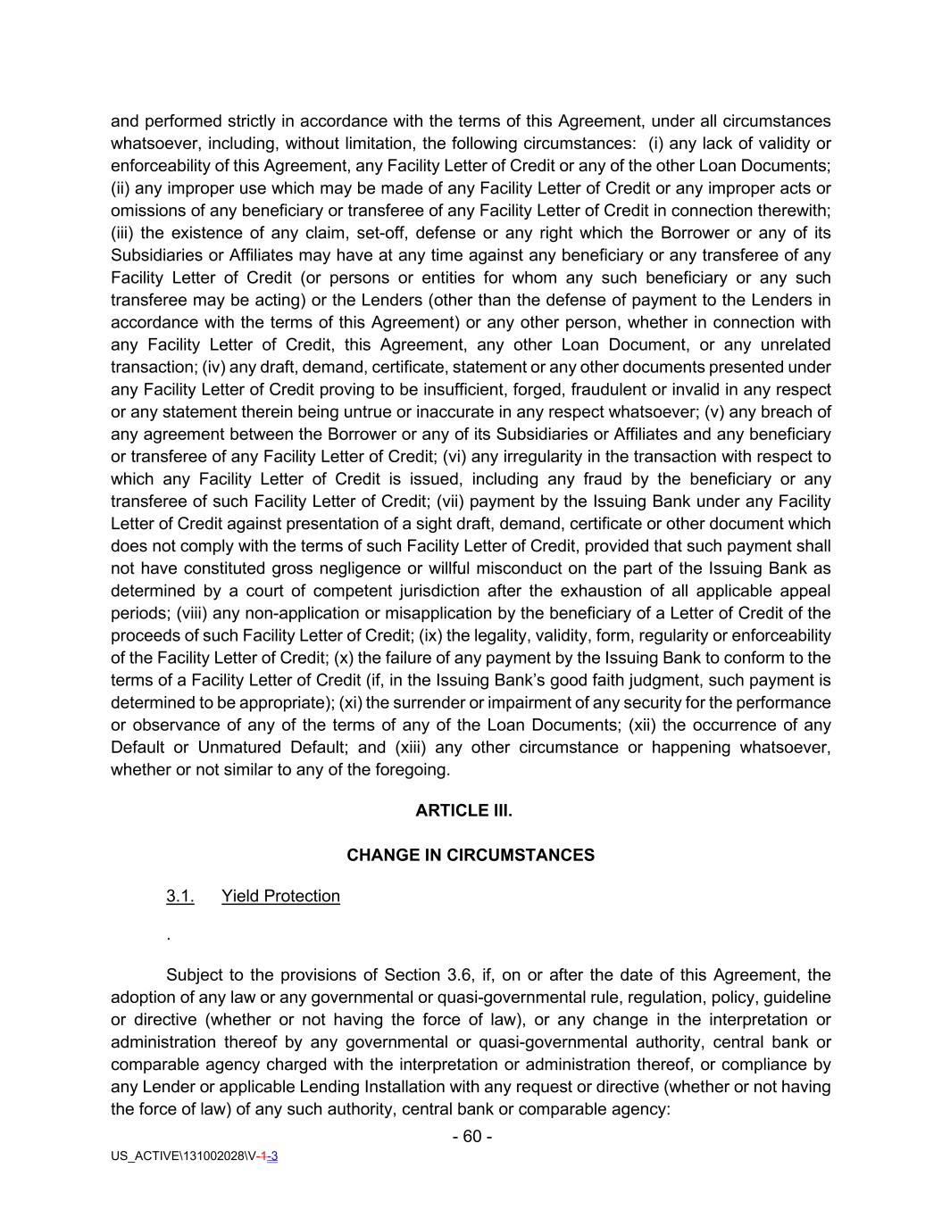 - 60 - US_ACTIVE\131002028\V-1-3 and performed strictly in accordance with the terms of this Agreement, under all circumstances whatsoever, including, without limitation, the following circumstances: (i) any lack of validity or enforceability of this Agreement, any Facility Letter of Credit or any of the other Loan Documents; (ii) any improper use which may be made of any Facility Letter of Credit or any improper acts or omissions of any beneficiary or transferee of any Facility Letter of Credit in connection therewith; (iii) the existence of any claim, set-off, defense or any right which the Borrower or any of its Subsidiaries or Affiliates may have at any time against any beneficiary or any transferee of any Facility Letter of Credit (or persons or entities for whom any such beneficiary or any such transferee may be acting) or the Lenders (other than the defense of payment to the Lenders in accordance with the terms of this Agreement) or any other person, whether in connection with any Facility Letter of Credit, this Agreement, any other Loan Document, or any unrelated transaction; (iv) any draft, demand, certificate, statement or any other documents presented under any Facility Letter of Credit proving to be insufficient, forged, fraudulent or invalid in any respect or any statement therein being untrue or inaccurate in any respect whatsoever; (v) any breach of any agreement between the Borrower or any of its Subsidiaries or Affiliates and any beneficiary or transferee of any Facility Letter of Credit; (vi) any irregularity in the transaction with respect to which any Facility Letter of Credit is issued, including any fraud by the beneficiary or any transferee of such Facility Letter of Credit; (vii) payment by the Issuing Bank under any Facility Letter of Credit against presentation of a sight draft, demand, certificate or other document which does not comply with the terms of such Facility Letter of Credit, provided that such payment shall not have constituted gross negligence or willful misconduct on the part of the Issuing Bank as determined by a court of competent jurisdiction after the exhaustion of all applicable appeal periods; (viii) any non-application or misapplication by the beneficiary of a Letter of Credit of the proceeds of such Facility Letter of Credit; (ix) the legality, validity, form, regularity or enforceability of the Facility Letter of Credit; (x) the failure of any payment by the Issuing Bank to conform to the terms of a Facility Letter of Credit (if, in the Issuing Bank’s good faith judgment, such payment is determined to be appropriate); (xi) the surrender or impairment of any security for the performance or observance of any of the terms of any of the Loan Documents; (xii) the occurrence of any Default or Unmatured Default; and (xiii) any other circumstance or happening whatsoever, whether or not similar to any of the foregoing. ARTICLE III. CHANGE IN CIRCUMSTANCES 3.1. Yield Protection . Subject to the provisions of Section 3.6, if, on or after the date of this Agreement, the adoption of any law or any governmental or quasi-governmental rule, regulation, policy, guideline or directive (whether or not having the force of law), or any change in the interpretation or administration thereof by any governmental or quasi-governmental authority, central bank or comparable agency charged with the interpretation or administration thereof, or compliance by any Lender or applicable Lending Installation with any request or directive (whether or not having the force of law) of any such authority, central bank or comparable agency: