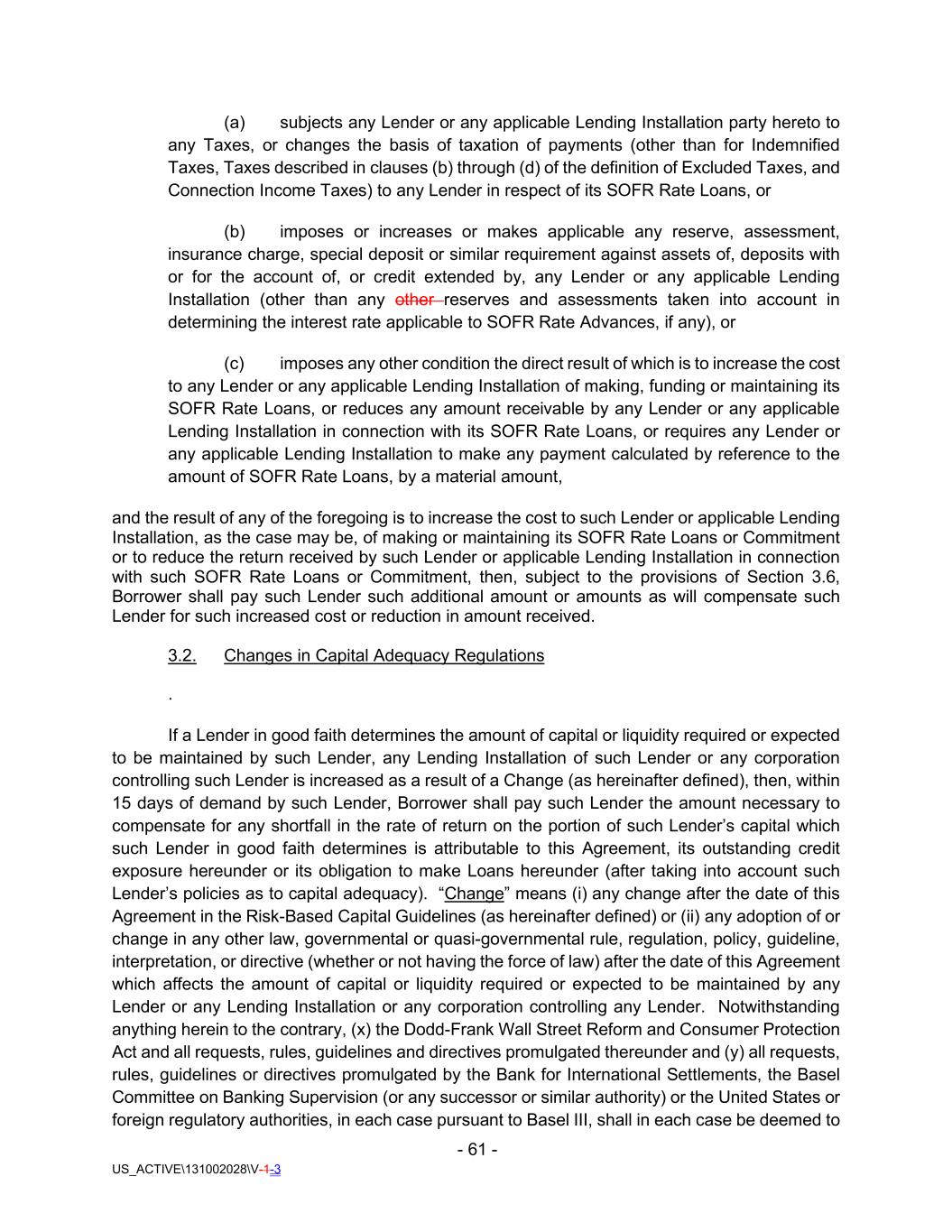 - 61 - US_ACTIVE\131002028\V-1-3 (a) subjects any Lender or any applicable Lending Installation party hereto to any Taxes, or changes the basis of taxation of payments (other than for Indemnified Taxes, Taxes described in clauses (b) through (d) of the definition of Excluded Taxes, and Connection Income Taxes) to any Lender in respect of its SOFR Rate Loans, or (b) imposes or increases or makes applicable any reserve, assessment, insurance charge, special deposit or similar requirement against assets of, deposits with or for the account of, or credit extended by, any Lender or any applicable Lending Installation (other than any other reserves and assessments taken into account in determining the interest rate applicable to SOFR Rate Advances, if any), or (c) imposes any other condition the direct result of which is to increase the cost to any Lender or any applicable Lending Installation of making, funding or maintaining its SOFR Rate Loans, or reduces any amount receivable by any Lender or any applicable Lending Installation in connection with its SOFR Rate Loans, or requires any Lender or any applicable Lending Installation to make any payment calculated by reference to the amount of SOFR Rate Loans, by a material amount, and the result of any of the foregoing is to increase the cost to such Lender or applicable Lending Installation, as the case may be, of making or maintaining its SOFR Rate Loans or Commitment or to reduce the return received by such Lender or applicable Lending Installation in connection with such SOFR Rate Loans or Commitment, then, subject to the provisions of Section 3.6, Borrower shall pay such Lender such additional amount or amounts as will compensate such Lender for such increased cost or reduction in amount received. 3.2. Changes in Capital Adequacy Regulations . If a Lender in good faith determines the amount of capital or liquidity required or expected to be maintained by such Lender, any Lending Installation of such Lender or any corporation controlling such Lender is increased as a result of a Change (as hereinafter defined), then, within 15 days of demand by such Lender, Borrower shall pay such Lender the amount necessary to compensate for any shortfall in the rate of return on the portion of such Lender’s capital which such Lender in good faith determines is attributable to this Agreement, its outstanding credit exposure hereunder or its obligation to make Loans hereunder (after taking into account such Lender’s policies as to capital adequacy). “Change” means (i) any change after the date of this Agreement in the Risk-Based Capital Guidelines (as hereinafter defined) or (ii) any adoption of or change in any other law, governmental or quasi-governmental rule, regulation, policy, guideline, interpretation, or directive (whether or not having the force of law) after the date of this Agreement which affects the amount of capital or liquidity required or expected to be maintained by any Lender or any Lending Installation or any corporation controlling any Lender. Notwithstanding anything herein to the contrary, (x) the Dodd-Frank Wall Street Reform and Consumer Protection Act and all requests, rules, guidelines and directives promulgated thereunder and (y) all requests, rules, guidelines or directives promulgated by the Bank for International Settlements, the Basel Committee on Banking Supervision (or any successor or similar authority) or the United States or foreign regulatory authorities, in each case pursuant to Basel III, shall in each case be deemed to