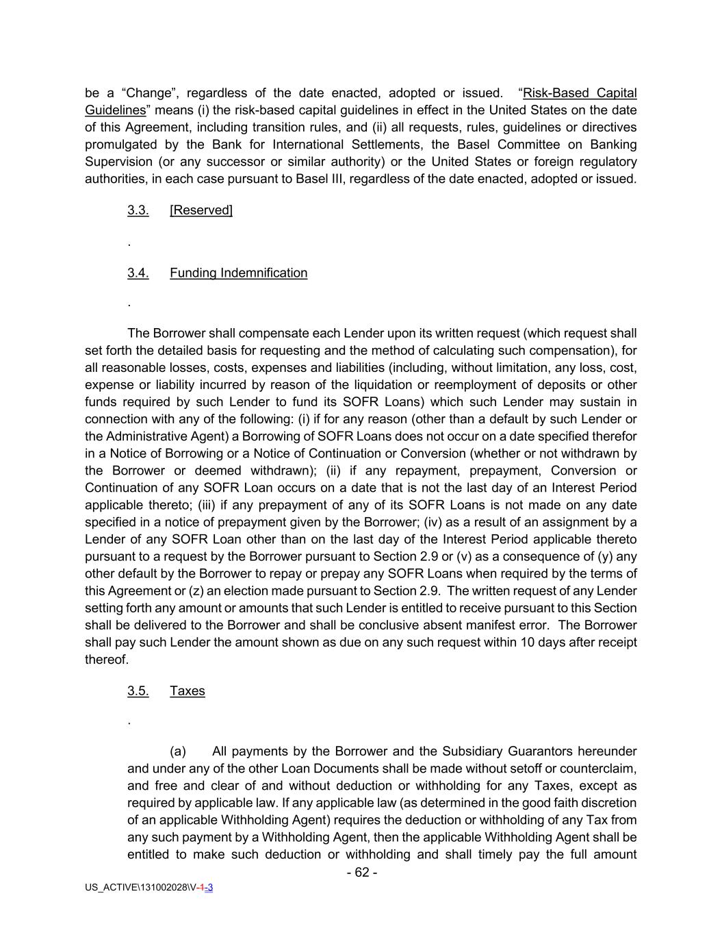 - 62 - US_ACTIVE\131002028\V-1-3 be a “Change”, regardless of the date enacted, adopted or issued. “Risk-Based Capital Guidelines” means (i) the risk-based capital guidelines in effect in the United States on the date of this Agreement, including transition rules, and (ii) all requests, rules, guidelines or directives promulgated by the Bank for International Settlements, the Basel Committee on Banking Supervision (or any successor or similar authority) or the United States or foreign regulatory authorities, in each case pursuant to Basel III, regardless of the date enacted, adopted or issued. 3.3. [Reserved] . 3.4. Funding Indemnification . The Borrower shall compensate each Lender upon its written request (which request shall set forth the detailed basis for requesting and the method of calculating such compensation), for all reasonable losses, costs, expenses and liabilities (including, without limitation, any loss, cost, expense or liability incurred by reason of the liquidation or reemployment of deposits or other funds required by such Lender to fund its SOFR Loans) which such Lender may sustain in connection with any of the following: (i) if for any reason (other than a default by such Lender or the Administrative Agent) a Borrowing of SOFR Loans does not occur on a date specified therefor in a Notice of Borrowing or a Notice of Continuation or Conversion (whether or not withdrawn by the Borrower or deemed withdrawn); (ii) if any repayment, prepayment, Conversion or Continuation of any SOFR Loan occurs on a date that is not the last day of an Interest Period applicable thereto; (iii) if any prepayment of any of its SOFR Loans is not made on any date specified in a notice of prepayment given by the Borrower; (iv) as a result of an assignment by a Lender of any SOFR Loan other than on the last day of the Interest Period applicable thereto pursuant to a request by the Borrower pursuant to Section 2.9 or (v) as a consequence of (y) any other default by the Borrower to repay or prepay any SOFR Loans when required by the terms of this Agreement or (z) an election made pursuant to Section 2.9. The written request of any Lender setting forth any amount or amounts that such Lender is entitled to receive pursuant to this Section shall be delivered to the Borrower and shall be conclusive absent manifest error. The Borrower shall pay such Lender the amount shown as due on any such request within 10 days after receipt thereof. 3.5. Taxes . (a) All payments by the Borrower and the Subsidiary Guarantors hereunder and under any of the other Loan Documents shall be made without setoff or counterclaim, and free and clear of and without deduction or withholding for any Taxes, except as required by applicable law. If any applicable law (as determined in the good faith discretion of an applicable Withholding Agent) requires the deduction or withholding of any Tax from any such payment by a Withholding Agent, then the applicable Withholding Agent shall be entitled to make such deduction or withholding and shall timely pay the full amount