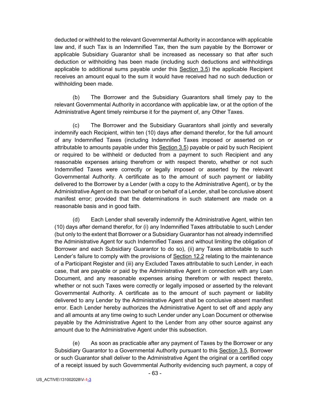 - 63 - US_ACTIVE\131002028\V-1-3 deducted or withheld to the relevant Governmental Authority in accordance with applicable law and, if such Tax is an Indemnified Tax, then the sum payable by the Borrower or applicable Subsidiary Guarantor shall be increased as necessary so that after such deduction or withholding has been made (including such deductions and withholdings applicable to additional sums payable under this Section 3.5) the applicable Recipient receives an amount equal to the sum it would have received had no such deduction or withholding been made. (b) The Borrower and the Subsidiary Guarantors shall timely pay to the relevant Governmental Authority in accordance with applicable law, or at the option of the Administrative Agent timely reimburse it for the payment of, any Other Taxes. (c) The Borrower and the Subsidiary Guarantors shall jointly and severally indemnify each Recipient, within ten (10) days after demand therefor, for the full amount of any Indemnified Taxes (including Indemnified Taxes imposed or asserted on or attributable to amounts payable under this Section 3.5) payable or paid by such Recipient or required to be withheld or deducted from a payment to such Recipient and any reasonable expenses arising therefrom or with respect thereto, whether or not such Indemnified Taxes were correctly or legally imposed or asserted by the relevant Governmental Authority. A certificate as to the amount of such payment or liability delivered to the Borrower by a Lender (with a copy to the Administrative Agent), or by the Administrative Agent on its own behalf or on behalf of a Lender, shall be conclusive absent manifest error; provided that the determinations in such statement are made on a reasonable basis and in good faith. (d) Each Lender shall severally indemnify the Administrative Agent, within ten (10) days after demand therefor, for (i) any Indemnified Taxes attributable to such Lender (but only to the extent that Borrower or a Subsidiary Guarantor has not already indemnified the Administrative Agent for such Indemnified Taxes and without limiting the obligation of Borrower and each Subsidiary Guarantor to do so), (ii) any Taxes attributable to such Lender’s failure to comply with the provisions of Section 12.2 relating to the maintenance of a Participant Register and (iii) any Excluded Taxes attributable to such Lender, in each case, that are payable or paid by the Administrative Agent in connection with any Loan Document, and any reasonable expenses arising therefrom or with respect thereto, whether or not such Taxes were correctly or legally imposed or asserted by the relevant Governmental Authority. A certificate as to the amount of such payment or liability delivered to any Lender by the Administrative Agent shall be conclusive absent manifest error. Each Lender hereby authorizes the Administrative Agent to set off and apply any and all amounts at any time owing to such Lender under any Loan Document or otherwise payable by the Administrative Agent to the Lender from any other source against any amount due to the Administrative Agent under this subsection. (e) As soon as practicable after any payment of Taxes by the Borrower or any Subsidiary Guarantor to a Governmental Authority pursuant to this Section 3.5, Borrower or such Guarantor shall deliver to the Administrative Agent the original or a certified copy of a receipt issued by such Governmental Authority evidencing such payment, a copy of