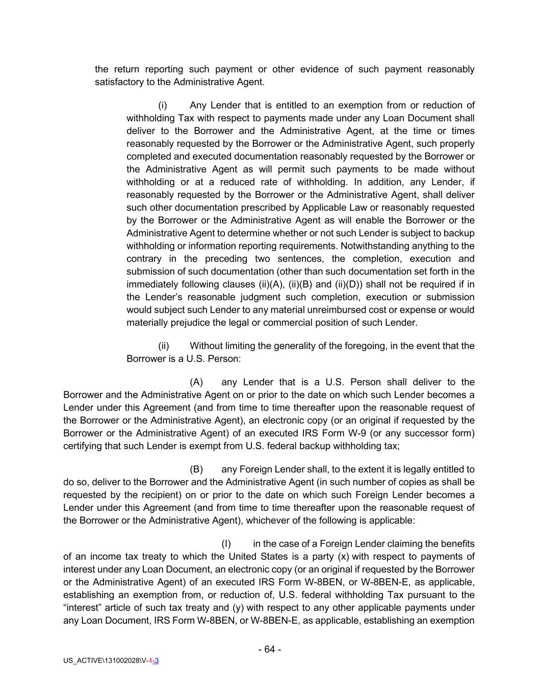- 64 - US_ACTIVE\131002028\V-1-3 the return reporting such payment or other evidence of such payment reasonably satisfactory to the Administrative Agent. (i) Any Lender that is entitled to an exemption from or reduction of withholding Tax with respect to payments made under any Loan Document shall deliver to the Borrower and the Administrative Agent, at the time or times reasonably requested by the Borrower or the Administrative Agent, such properly completed and executed documentation reasonably requested by the Borrower or the Administrative Agent as will permit such payments to be made without withholding or at a reduced rate of withholding. In addition, any Lender, if reasonably requested by the Borrower or the Administrative Agent, shall deliver such other documentation prescribed by Applicable Law or reasonably requested by the Borrower or the Administrative Agent as will enable the Borrower or the Administrative Agent to determine whether or not such Lender is subject to backup withholding or information reporting requirements. Notwithstanding anything to the contrary in the preceding two sentences, the completion, execution and submission of such documentation (other than such documentation set forth in the immediately following clauses (ii)(A), (ii)(B) and (ii)(D)) shall not be required if in the Lender’s reasonable judgment such completion, execution or submission would subject such Lender to any material unreimbursed cost or expense or would materially prejudice the legal or commercial position of such Lender. (ii) Without limiting the generality of the foregoing, in the event that the Borrower is a U.S. Person: (A) any Lender that is a U.S. Person shall deliver to the Borrower and the Administrative Agent on or prior to the date on which such Lender becomes a Lender under this Agreement (and from time to time thereafter upon the reasonable request of the Borrower or the Administrative Agent), an electronic copy (or an original if requested by the Borrower or the Administrative Agent) of an executed IRS Form W-9 (or any successor form) certifying that such Lender is exempt from U.S. federal backup withholding tax; (B) any Foreign Lender shall, to the extent it is legally entitled to do so, deliver to the Borrower and the Administrative Agent (in such number of copies as shall be requested by the recipient) on or prior to the date on which such Foreign Lender becomes a Lender under this Agreement (and from time to time thereafter upon the reasonable request of the Borrower or the Administrative Agent), whichever of the following is applicable: (I) in the case of a Foreign Lender claiming the benefits of an income tax treaty to which the United States is a party (x) with respect to payments of interest under any Loan Document, an electronic copy (or an original if requested by the Borrower or the Administrative Agent) of an executed IRS Form W-8BEN, or W-8BEN-E, as applicable, establishing an exemption from, or reduction of, U.S. federal withholding Tax pursuant to the “interest” article of such tax treaty and (y) with respect to any other applicable payments under any Loan Document, IRS Form W-8BEN, or W-8BEN-E, as applicable, establishing an exemption