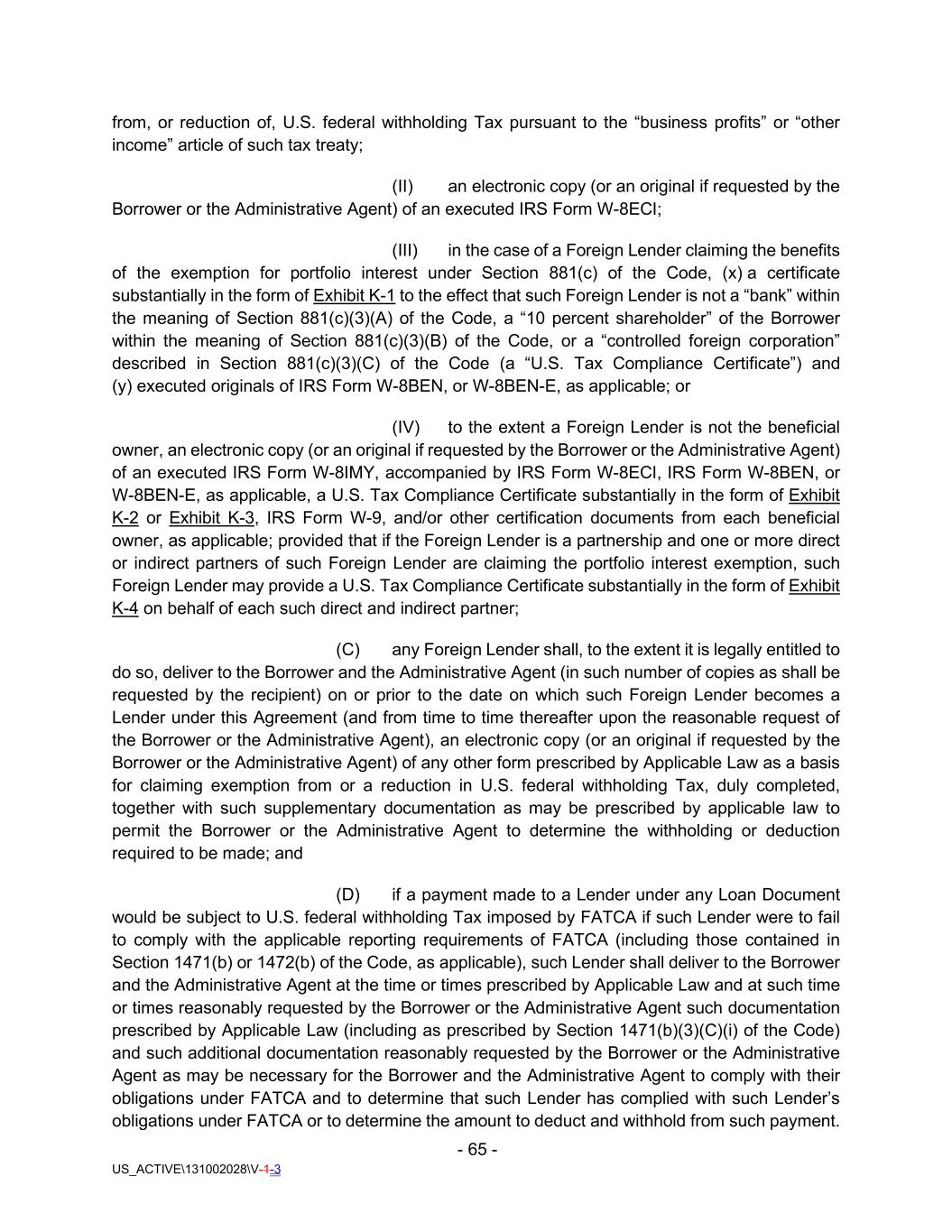 - 65 - US_ACTIVE\131002028\V-1-3 from, or reduction of, U.S. federal withholding Tax pursuant to the “business profits” or “other income” article of such tax treaty; (II) an electronic copy (or an original if requested by the Borrower or the Administrative Agent) of an executed IRS Form W-8ECI; (III) in the case of a Foreign Lender claiming the benefits of the exemption for portfolio interest under Section 881(c) of the Code, (x) a certificate substantially in the form of Exhibit K-1 to the effect that such Foreign Lender is not a “bank” within the meaning of Section 881(c)(3)(A) of the Code, a “10 percent shareholder” of the Borrower within the meaning of Section 881(c)(3)(B) of the Code, or a “controlled foreign corporation” described in Section 881(c)(3)(C) of the Code (a “U.S. Tax Compliance Certificate”) and (y) executed originals of IRS Form W-8BEN, or W-8BEN-E, as applicable; or (IV) to the extent a Foreign Lender is not the beneficial owner, an electronic copy (or an original if requested by the Borrower or the Administrative Agent) of an executed IRS Form W-8IMY, accompanied by IRS Form W-8ECI, IRS Form W-8BEN, or W-8BEN-E, as applicable, a U.S. Tax Compliance Certificate substantially in the form of Exhibit K-2 or Exhibit K-3, IRS Form W-9, and/or other certification documents from each beneficial owner, as applicable; provided that if the Foreign Lender is a partnership and one or more direct or indirect partners of such Foreign Lender are claiming the portfolio interest exemption, such Foreign Lender may provide a U.S. Tax Compliance Certificate substantially in the form of Exhibit K-4 on behalf of each such direct and indirect partner; (C) any Foreign Lender shall, to the extent it is legally entitled to do so, deliver to the Borrower and the Administrative Agent (in such number of copies as shall be requested by the recipient) on or prior to the date on which such Foreign Lender becomes a Lender under this Agreement (and from time to time thereafter upon the reasonable request of the Borrower or the Administrative Agent), an electronic copy (or an original if requested by the Borrower or the Administrative Agent) of any other form prescribed by Applicable Law as a basis for claiming exemption from or a reduction in U.S. federal withholding Tax, duly completed, together with such supplementary documentation as may be prescribed by applicable law to permit the Borrower or the Administrative Agent to determine the withholding or deduction required to be made; and (D) if a payment made to a Lender under any Loan Document would be subject to U.S. federal withholding Tax imposed by FATCA if such Lender were to fail to comply with the applicable reporting requirements of FATCA (including those contained in Section 1471(b) or 1472(b) of the Code, as applicable), such Lender shall deliver to the Borrower and the Administrative Agent at the time or times prescribed by Applicable Law and at such time or times reasonably requested by the Borrower or the Administrative Agent such documentation prescribed by Applicable Law (including as prescribed by Section 1471(b)(3)(C)(i) of the Code) and such additional documentation reasonably requested by the Borrower or the Administrative Agent as may be necessary for the Borrower and the Administrative Agent to comply with their obligations under FATCA and to determine that such Lender has complied with such Lender’s obligations under FATCA or to determine the amount to deduct and withhold from such payment.