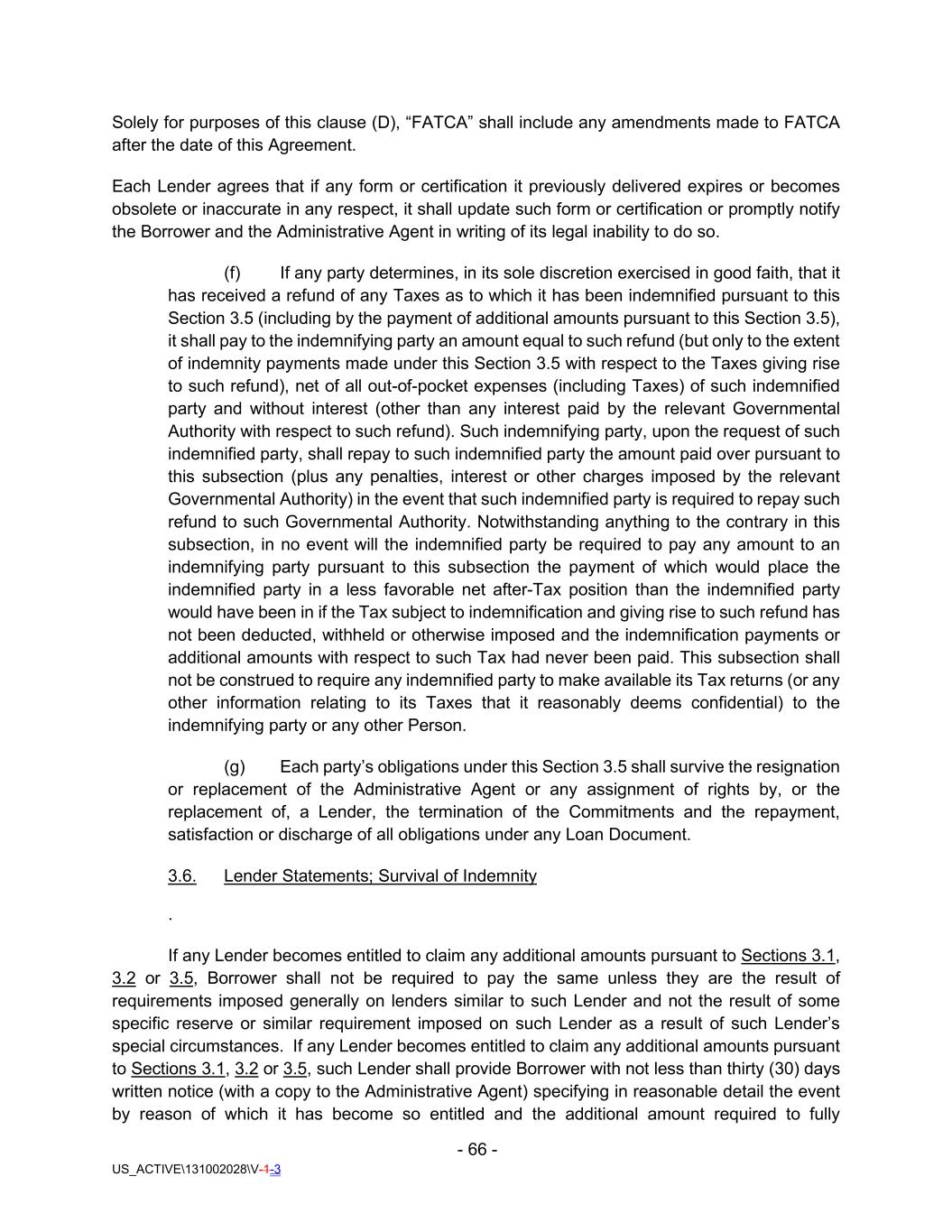 - 66 - US_ACTIVE\131002028\V-1-3 Solely for purposes of this clause (D), “FATCA” shall include any amendments made to FATCA after the date of this Agreement. Each Lender agrees that if any form or certification it previously delivered expires or becomes obsolete or inaccurate in any respect, it shall update such form or certification or promptly notify the Borrower and the Administrative Agent in writing of its legal inability to do so. (f) If any party determines, in its sole discretion exercised in good faith, that it has received a refund of any Taxes as to which it has been indemnified pursuant to this Section 3.5 (including by the payment of additional amounts pursuant to this Section 3.5), it shall pay to the indemnifying party an amount equal to such refund (but only to the extent of indemnity payments made under this Section 3.5 with respect to the Taxes giving rise to such refund), net of all out-of-pocket expenses (including Taxes) of such indemnified party and without interest (other than any interest paid by the relevant Governmental Authority with respect to such refund). Such indemnifying party, upon the request of such indemnified party, shall repay to such indemnified party the amount paid over pursuant to this subsection (plus any penalties, interest or other charges imposed by the relevant Governmental Authority) in the event that such indemnified party is required to repay such refund to such Governmental Authority. Notwithstanding anything to the contrary in this subsection, in no event will the indemnified party be required to pay any amount to an indemnifying party pursuant to this subsection the payment of which would place the indemnified party in a less favorable net after-Tax position than the indemnified party would have been in if the Tax subject to indemnification and giving rise to such refund has not been deducted, withheld or otherwise imposed and the indemnification payments or additional amounts with respect to such Tax had never been paid. This subsection shall not be construed to require any indemnified party to make available its Tax returns (or any other information relating to its Taxes that it reasonably deems confidential) to the indemnifying party or any other Person. (g) Each party’s obligations under this Section 3.5 shall survive the resignation or replacement of the Administrative Agent or any assignment of rights by, or the replacement of, a Lender, the termination of the Commitments and the repayment, satisfaction or discharge of all obligations under any Loan Document. 3.6. Lender Statements; Survival of Indemnity . If any Lender becomes entitled to claim any additional amounts pursuant to Sections 3.1, 3.2 or 3.5, Borrower shall not be required to pay the same unless they are the result of requirements imposed generally on lenders similar to such Lender and not the result of some specific reserve or similar requirement imposed on such Lender as a result of such Lender’s special circumstances. If any Lender becomes entitled to claim any additional amounts pursuant to Sections 3.1, 3.2 or 3.5, such Lender shall provide Borrower with not less than thirty (30) days written notice (with a copy to the Administrative Agent) specifying in reasonable detail the event by reason of which it has become so entitled and the additional amount required to fully
