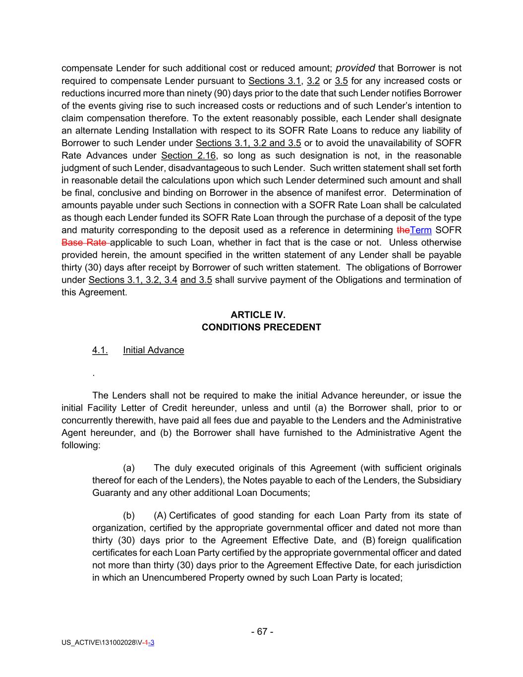 - 67 - US_ACTIVE\131002028\V-1-3 compensate Lender for such additional cost or reduced amount; provided that Borrower is not required to compensate Lender pursuant to Sections 3.1, 3.2 or 3.5 for any increased costs or reductions incurred more than ninety (90) days prior to the date that such Lender notifies Borrower of the events giving rise to such increased costs or reductions and of such Lender’s intention to claim compensation therefore. To the extent reasonably possible, each Lender shall designate an alternate Lending Installation with respect to its SOFR Rate Loans to reduce any liability of Borrower to such Lender under Sections 3.1, 3.2 and 3.5 or to avoid the unavailability of SOFR Rate Advances under Section 2.16, so long as such designation is not, in the reasonable judgment of such Lender, disadvantageous to such Lender. Such written statement shall set forth in reasonable detail the calculations upon which such Lender determined such amount and shall be final, conclusive and binding on Borrower in the absence of manifest error. Determination of amounts payable under such Sections in connection with a SOFR Rate Loan shall be calculated as though each Lender funded its SOFR Rate Loan through the purchase of a deposit of the type and maturity corresponding to the deposit used as a reference in determining theTerm SOFR Base Rate applicable to such Loan, whether in fact that is the case or not. Unless otherwise provided herein, the amount specified in the written statement of any Lender shall be payable thirty (30) days after receipt by Borrower of such written statement. The obligations of Borrower under Sections 3.1, 3.2, 3.4 and 3.5 shall survive payment of the Obligations and termination of this Agreement. ARTICLE IV. CONDITIONS PRECEDENT 4.1. Initial Advance . The Lenders shall not be required to make the initial Advance hereunder, or issue the initial Facility Letter of Credit hereunder, unless and until (a) the Borrower shall, prior to or concurrently therewith, have paid all fees due and payable to the Lenders and the Administrative Agent hereunder, and (b) the Borrower shall have furnished to the Administrative Agent the following: (a) The duly executed originals of this Agreement (with sufficient originals thereof for each of the Lenders), the Notes payable to each of the Lenders, the Subsidiary Guaranty and any other additional Loan Documents; (b) (A) Certificates of good standing for each Loan Party from its state of organization, certified by the appropriate governmental officer and dated not more than thirty (30) days prior to the Agreement Effective Date, and (B) foreign qualification certificates for each Loan Party certified by the appropriate governmental officer and dated not more than thirty (30) days prior to the Agreement Effective Date, for each jurisdiction in which an Unencumbered Property owned by such Loan Party is located;