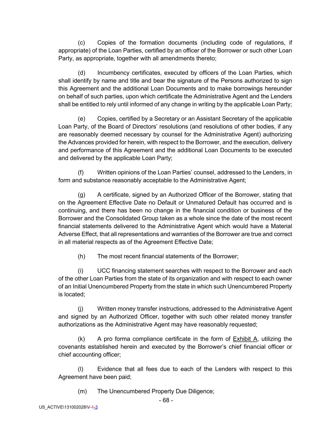 - 68 - US_ACTIVE\131002028\V-1-3 (c) Copies of the formation documents (including code of regulations, if appropriate) of the Loan Parties, certified by an officer of the Borrower or such other Loan Party, as appropriate, together with all amendments thereto; (d) Incumbency certificates, executed by officers of the Loan Parties, which shall identify by name and title and bear the signature of the Persons authorized to sign this Agreement and the additional Loan Documents and to make borrowings hereunder on behalf of such parties, upon which certificate the Administrative Agent and the Lenders shall be entitled to rely until informed of any change in writing by the applicable Loan Party; (e) Copies, certified by a Secretary or an Assistant Secretary of the applicable Loan Party, of the Board of Directors’ resolutions (and resolutions of other bodies, if any are reasonably deemed necessary by counsel for the Administrative Agent) authorizing the Advances provided for herein, with respect to the Borrower, and the execution, delivery and performance of this Agreement and the additional Loan Documents to be executed and delivered by the applicable Loan Party; (f) Written opinions of the Loan Parties’ counsel, addressed to the Lenders, in form and substance reasonably acceptable to the Administrative Agent; (g) A certificate, signed by an Authorized Officer of the Borrower, stating that on the Agreement Effective Date no Default or Unmatured Default has occurred and is continuing, and there has been no change in the financial condition or business of the Borrower and the Consolidated Group taken as a whole since the date of the most recent financial statements delivered to the Administrative Agent which would have a Material Adverse Effect, that all representations and warranties of the Borrower are true and correct in all material respects as of the Agreement Effective Date; (h) The most recent financial statements of the Borrower; (i) UCC financing statement searches with respect to the Borrower and each of the other Loan Parties from the state of its organization and with respect to each owner of an Initial Unencumbered Property from the state in which such Unencumbered Property is located; (j) Written money transfer instructions, addressed to the Administrative Agent and signed by an Authorized Officer, together with such other related money transfer authorizations as the Administrative Agent may have reasonably requested; (k) A pro forma compliance certificate in the form of Exhibit A, utilizing the covenants established herein and executed by the Borrower’s chief financial officer or chief accounting officer; (l) Evidence that all fees due to each of the Lenders with respect to this Agreement have been paid; (m) The Unencumbered Property Due Diligence;