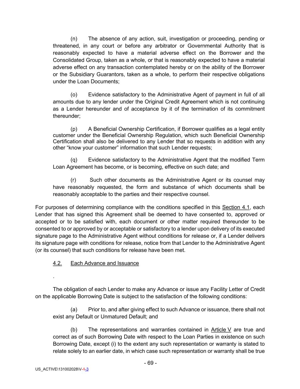 - 69 - US_ACTIVE\131002028\V-1-3 (n) The absence of any action, suit, investigation or proceeding, pending or threatened, in any court or before any arbitrator or Governmental Authority that is reasonably expected to have a material adverse effect on the Borrower and the Consolidated Group, taken as a whole, or that is reasonably expected to have a material adverse effect on any transaction contemplated hereby or on the ability of the Borrower or the Subsidiary Guarantors, taken as a whole, to perform their respective obligations under the Loan Documents; (o) Evidence satisfactory to the Administrative Agent of payment in full of all amounts due to any lender under the Original Credit Agreement which is not continuing as a Lender hereunder and of acceptance by it of the termination of its commitment thereunder; (p) A Beneficial Ownership Certification, if Borrower qualifies as a legal entity customer under the Beneficial Ownership Regulation, which such Beneficial Ownership Certification shall also be delivered to any Lender that so requests in addition with any other “know your customer” information that such Lender requests; (q) Evidence satisfactory to the Administrative Agent that the modified Term Loan Agreement has become, or is becoming, effective on such date; and (r) Such other documents as the Administrative Agent or its counsel may have reasonably requested, the form and substance of which documents shall be reasonably acceptable to the parties and their respective counsel. For purposes of determining compliance with the conditions specified in this Section 4.1, each Lender that has signed this Agreement shall be deemed to have consented to, approved or accepted or to be satisfied with, each document or other matter required thereunder to be consented to or approved by or acceptable or satisfactory to a lender upon delivery of its executed signature page to the Administrative Agent without conditions for release or, if a Lender delivers its signature page with conditions for release, notice from that Lender to the Administrative Agent (or its counsel) that such conditions for release have been met. 4.2. Each Advance and Issuance . The obligation of each Lender to make any Advance or issue any Facility Letter of Credit on the applicable Borrowing Date is subject to the satisfaction of the following conditions: (a) Prior to, and after giving effect to such Advance or issuance, there shall not exist any Default or Unmatured Default; and (b) The representations and warranties contained in Article V are true and correct as of such Borrowing Date with respect to the Loan Parties in existence on such Borrowing Date, except (i) to the extent any such representation or warranty is stated to relate solely to an earlier date, in which case such representation or warranty shall be true