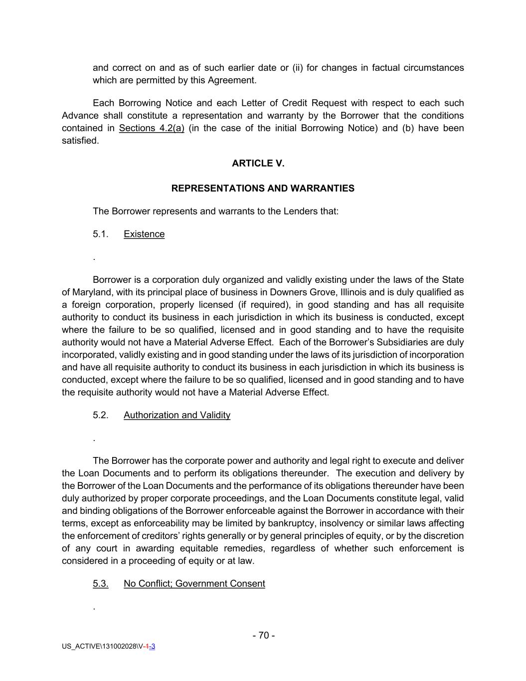 - 70 - US_ACTIVE\131002028\V-1-3 and correct on and as of such earlier date or (ii) for changes in factual circumstances which are permitted by this Agreement. Each Borrowing Notice and each Letter of Credit Request with respect to each such Advance shall constitute a representation and warranty by the Borrower that the conditions contained in Sections 4.2(a) (in the case of the initial Borrowing Notice) and (b) have been satisfied. ARTICLE V. REPRESENTATIONS AND WARRANTIES The Borrower represents and warrants to the Lenders that: 5.1. Existence . Borrower is a corporation duly organized and validly existing under the laws of the State of Maryland, with its principal place of business in Downers Grove, Illinois and is duly qualified as a foreign corporation, properly licensed (if required), in good standing and has all requisite authority to conduct its business in each jurisdiction in which its business is conducted, except where the failure to be so qualified, licensed and in good standing and to have the requisite authority would not have a Material Adverse Effect. Each of the Borrower’s Subsidiaries are duly incorporated, validly existing and in good standing under the laws of its jurisdiction of incorporation and have all requisite authority to conduct its business in each jurisdiction in which its business is conducted, except where the failure to be so qualified, licensed and in good standing and to have the requisite authority would not have a Material Adverse Effect. 5.2. Authorization and Validity . The Borrower has the corporate power and authority and legal right to execute and deliver the Loan Documents and to perform its obligations thereunder. The execution and delivery by the Borrower of the Loan Documents and the performance of its obligations thereunder have been duly authorized by proper corporate proceedings, and the Loan Documents constitute legal, valid and binding obligations of the Borrower enforceable against the Borrower in accordance with their terms, except as enforceability may be limited by bankruptcy, insolvency or similar laws affecting the enforcement of creditors’ rights generally or by general principles of equity, or by the discretion of any court in awarding equitable remedies, regardless of whether such enforcement is considered in a proceeding of equity or at law. 5.3. No Conflict; Government Consent .