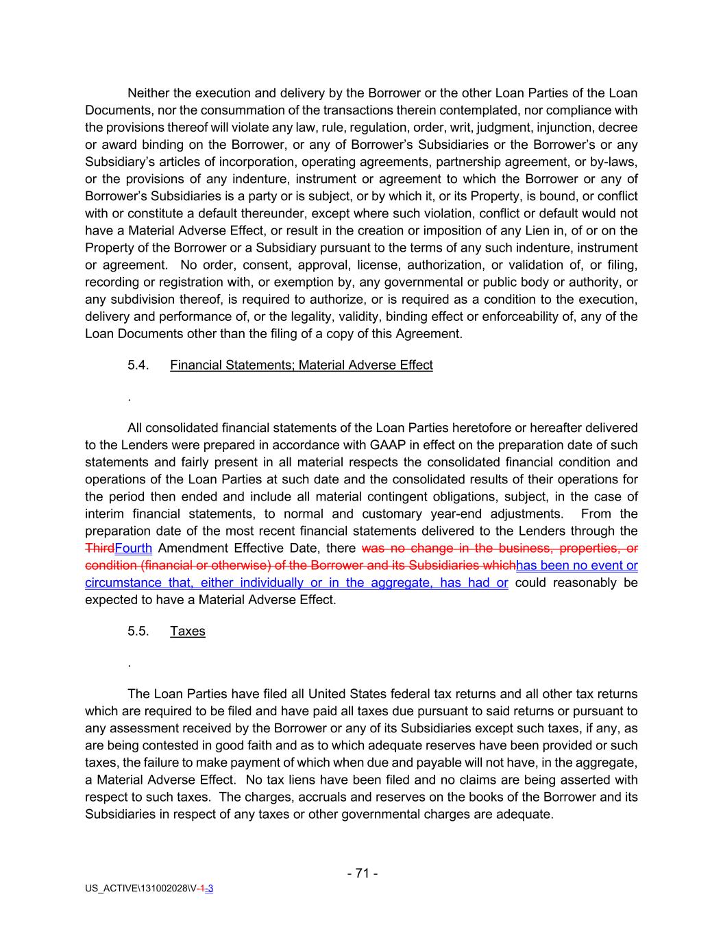 - 71 - US_ACTIVE\131002028\V-1-3 Neither the execution and delivery by the Borrower or the other Loan Parties of the Loan Documents, nor the consummation of the transactions therein contemplated, nor compliance with the provisions thereof will violate any law, rule, regulation, order, writ, judgment, injunction, decree or award binding on the Borrower, or any of Borrower’s Subsidiaries or the Borrower’s or any Subsidiary’s articles of incorporation, operating agreements, partnership agreement, or by-laws, or the provisions of any indenture, instrument or agreement to which the Borrower or any of Borrower’s Subsidiaries is a party or is subject, or by which it, or its Property, is bound, or conflict with or constitute a default thereunder, except where such violation, conflict or default would not have a Material Adverse Effect, or result in the creation or imposition of any Lien in, of or on the Property of the Borrower or a Subsidiary pursuant to the terms of any such indenture, instrument or agreement. No order, consent, approval, license, authorization, or validation of, or filing, recording or registration with, or exemption by, any governmental or public body or authority, or any subdivision thereof, is required to authorize, or is required as a condition to the execution, delivery and performance of, or the legality, validity, binding effect or enforceability of, any of the Loan Documents other than the filing of a copy of this Agreement. 5.4. Financial Statements; Material Adverse Effect . All consolidated financial statements of the Loan Parties heretofore or hereafter delivered to the Lenders were prepared in accordance with GAAP in effect on the preparation date of such statements and fairly present in all material respects the consolidated financial condition and operations of the Loan Parties at such date and the consolidated results of their operations for the period then ended and include all material contingent obligations, subject, in the case of interim financial statements, to normal and customary year-end adjustments. From the preparation date of the most recent financial statements delivered to the Lenders through the ThirdFourth Amendment Effective Date, there was no change in the business, properties, or condition (financial or otherwise) of the Borrower and its Subsidiaries whichhas been no event or circumstance that, either individually or in the aggregate, has had or could reasonably be expected to have a Material Adverse Effect. 5.5. Taxes . The Loan Parties have filed all United States federal tax returns and all other tax returns which are required to be filed and have paid all taxes due pursuant to said returns or pursuant to any assessment received by the Borrower or any of its Subsidiaries except such taxes, if any, as are being contested in good faith and as to which adequate reserves have been provided or such taxes, the failure to make payment of which when due and payable will not have, in the aggregate, a Material Adverse Effect. No tax liens have been filed and no claims are being asserted with respect to such taxes. The charges, accruals and reserves on the books of the Borrower and its Subsidiaries in respect of any taxes or other governmental charges are adequate.