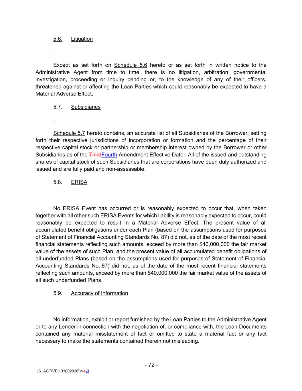 - 72 - US_ACTIVE\131002028\V-1-3 5.6. Litigation . Except as set forth on Schedule 5.6 hereto or as set forth in written notice to the Administrative Agent from time to time, there is no litigation, arbitration, governmental investigation, proceeding or inquiry pending or, to the knowledge of any of their officers, threatened against or affecting the Loan Parties which could reasonably be expected to have a Material Adverse Effect. 5.7. Subsidiaries . Schedule 5.7 hereto contains, an accurate list of all Subsidiaries of the Borrower, setting forth their respective jurisdictions of incorporation or formation and the percentage of their respective capital stock or partnership or membership interest owned by the Borrower or other Subsidiaries as of the ThirdFourth Amendment Effective Date. All of the issued and outstanding shares of capital stock of such Subsidiaries that are corporations have been duly authorized and issued and are fully paid and non-assessable. 5.8. ERISA . No ERISA Event has occurred or is reasonably expected to occur that, when taken together with all other such ERISA Events for which liability is reasonably expected to occur, could reasonably be expected to result in a Material Adverse Effect. The present value of all accumulated benefit obligations under each Plan (based on the assumptions used for purposes of Statement of Financial Accounting Standards No. 87) did not, as of the date of the most recent financial statements reflecting such amounts, exceed by more than $40,000,000 the fair market value of the assets of such Plan, and the present value of all accumulated benefit obligations of all underfunded Plans (based on the assumptions used for purposes of Statement of Financial Accounting Standards No. 87) did not, as of the date of the most recent financial statements reflecting such amounts, exceed by more than $40,000,000 the fair market value of the assets of all such underfunded Plans. 5.9. Accuracy of Information . No information, exhibit or report furnished by the Loan Parties to the Administrative Agent or to any Lender in connection with the negotiation of, or compliance with, the Loan Documents contained any material misstatement of fact or omitted to state a material fact or any fact necessary to make the statements contained therein not misleading.