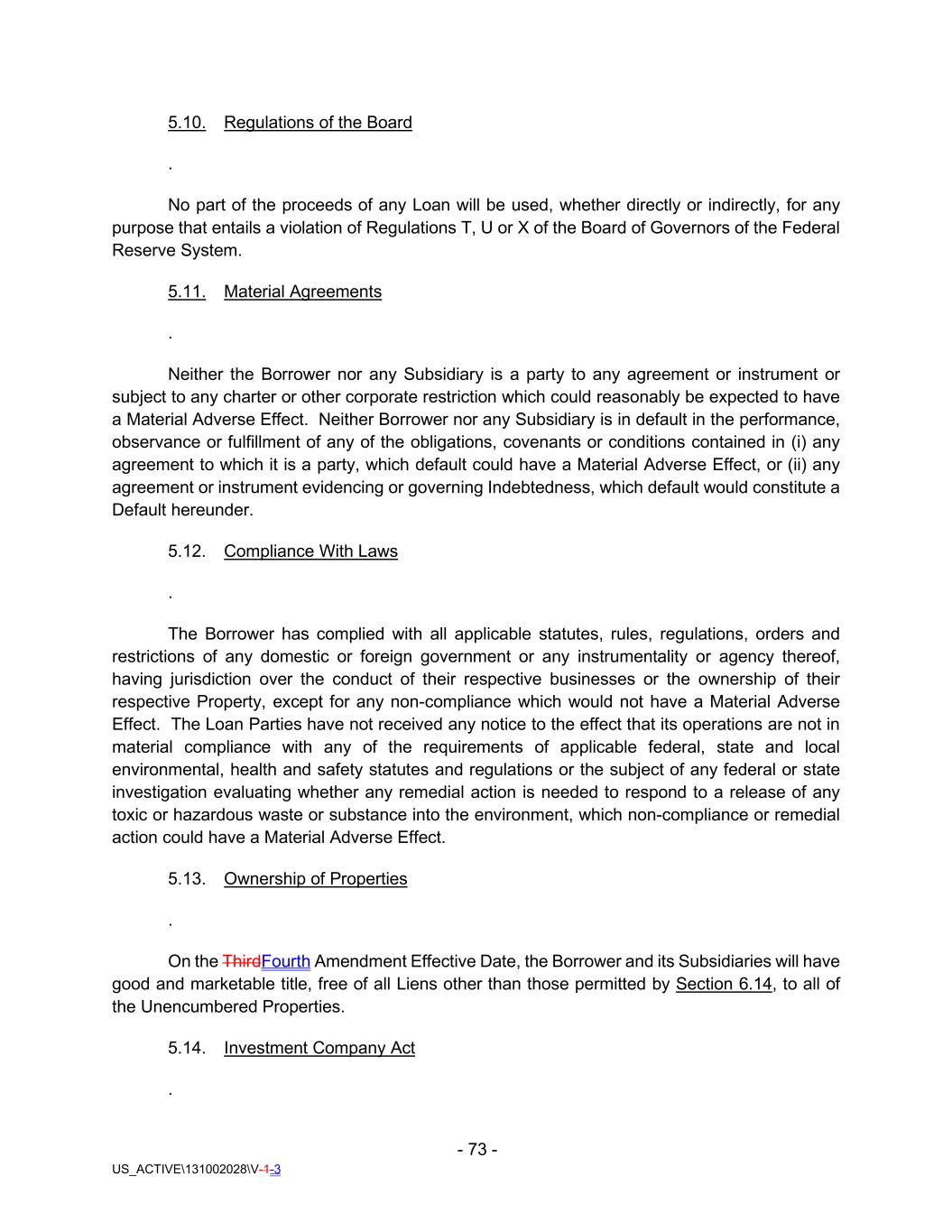 - 73 - US_ACTIVE\131002028\V-1-3 5.10. Regulations of the Board . No part of the proceeds of any Loan will be used, whether directly or indirectly, for any purpose that entails a violation of Regulations T, U or X of the Board of Governors of the Federal Reserve System. 5.11. Material Agreements . Neither the Borrower nor any Subsidiary is a party to any agreement or instrument or subject to any charter or other corporate restriction which could reasonably be expected to have a Material Adverse Effect. Neither Borrower nor any Subsidiary is in default in the performance, observance or fulfillment of any of the obligations, covenants or conditions contained in (i) any agreement to which it is a party, which default could have a Material Adverse Effect, or (ii) any agreement or instrument evidencing or governing Indebtedness, which default would constitute a Default hereunder. 5.12. Compliance With Laws . The Borrower has complied with all applicable statutes, rules, regulations, orders and restrictions of any domestic or foreign government or any instrumentality or agency thereof, having jurisdiction over the conduct of their respective businesses or the ownership of their respective Property, except for any non-compliance which would not have a Material Adverse Effect. The Loan Parties have not received any notice to the effect that its operations are not in material compliance with any of the requirements of applicable federal, state and local environmental, health and safety statutes and regulations or the subject of any federal or state investigation evaluating whether any remedial action is needed to respond to a release of any toxic or hazardous waste or substance into the environment, which non-compliance or remedial action could have a Material Adverse Effect. 5.13. Ownership of Properties . On the ThirdFourth Amendment Effective Date, the Borrower and its Subsidiaries will have good and marketable title, free of all Liens other than those permitted by Section 6.14, to all of the Unencumbered Properties. 5.14. Investment Company Act .