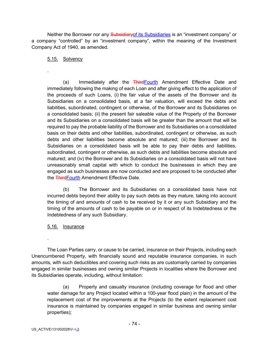 - 74 - US_ACTIVE\131002028\V-1-3 Neither the Borrower nor any Subsidiaryof its Subsidiaries is an “investment company” or a company “controlled” by an “investment company”, within the meaning of the Investment Company Act of 1940, as amended. 5.15. Solvency . (a) Immediately after the ThirdFourth Amendment Effective Date and immediately following the making of each Loan and after giving effect to the application of the proceeds of such Loans, (i) the fair value of the assets of the Borrower and its Subsidiaries on a consolidated basis, at a fair valuation, will exceed the debts and liabilities, subordinated, contingent or otherwise, of the Borrower and its Subsidiaries on a consolidated basis; (ii) the present fair saleable value of the Property of the Borrower and its Subsidiaries on a consolidated basis will be greater than the amount that will be required to pay the probable liability of the Borrower and its Subsidiaries on a consolidated basis on their debts and other liabilities, subordinated, contingent or otherwise, as such debts and other liabilities become absolute and matured; (iii) the Borrower and its Subsidiaries on a consolidated basis will be able to pay their debts and liabilities, subordinated, contingent or otherwise, as such debts and liabilities become absolute and matured; and (iv) the Borrower and its Subsidiaries on a consolidated basis will not have unreasonably small capital with which to conduct the businesses in which they are engaged as such businesses are now conducted and are proposed to be conducted after the ThirdFourth Amendment Effective Date. (b) The Borrower and its Subsidiaries on a consolidated basis have not incurred debts beyond their ability to pay such debts as they mature, taking into account the timing of and amounts of cash to be received by it or any such Subsidiary and the timing of the amounts of cash to be payable on or in respect of its Indebtedness or the Indebtedness of any such Subsidiary. 5.16. Insurance . The Loan Parties carry, or cause to be carried, insurance on their Projects, including each Unencumbered Property, with financially sound and reputable insurance companies, in such amounts, with such deductibles and covering such risks as are customarily carried by companies engaged in similar businesses and owning similar Projects in localities where the Borrower and its Subsidiaries operate, including, without limitation: (a) Property and casualty insurance (including coverage for flood and other water damage for any Project located within a 100-year flood plain) in the amount of the replacement cost of the improvements at the Projects (to the extent replacement cost insurance is maintained by companies engaged in similar business and owning similar properties);