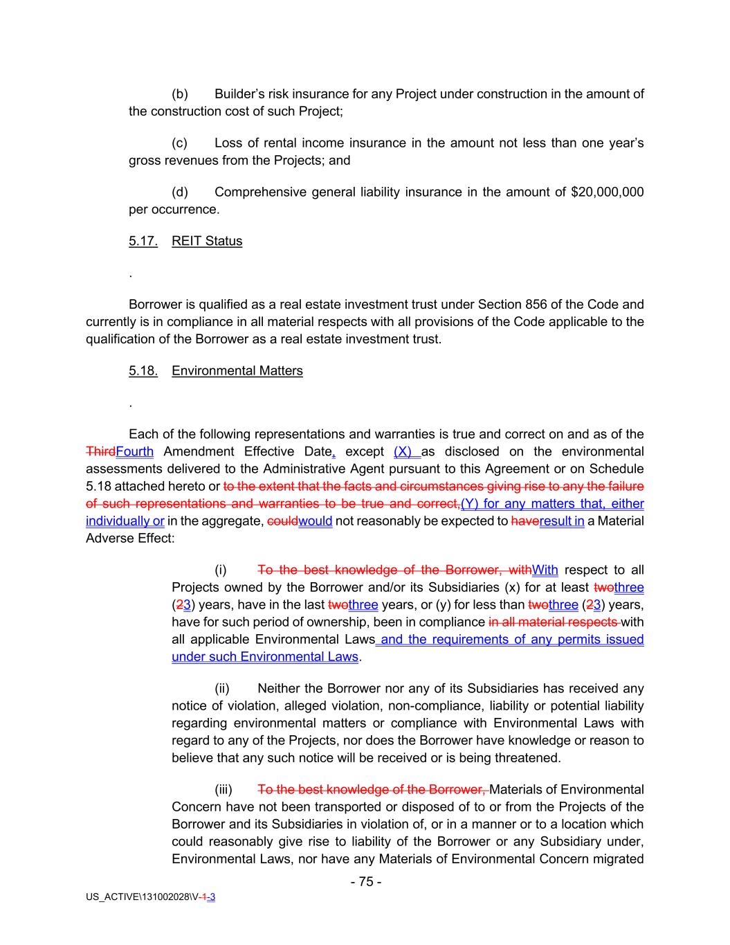 - 75 - US_ACTIVE\131002028\V-1-3 (b) Builder’s risk insurance for any Project under construction in the amount of the construction cost of such Project; (c) Loss of rental income insurance in the amount not less than one year’s gross revenues from the Projects; and (d) Comprehensive general liability insurance in the amount of $20,000,000 per occurrence. 5.17. REIT Status . Borrower is qualified as a real estate investment trust under Section 856 of the Code and currently is in compliance in all material respects with all provisions of the Code applicable to the qualification of the Borrower as a real estate investment trust. 5.18. Environmental Matters . Each of the following representations and warranties is true and correct on and as of the ThirdFourth Amendment Effective Date, except (X) as disclosed on the environmental assessments delivered to the Administrative Agent pursuant to this Agreement or on Schedule 5.18 attached hereto or to the extent that the facts and circumstances giving rise to any the failure of such representations and warranties to be true and correct,(Y) for any matters that, either individually or in the aggregate, couldwould not reasonably be expected to haveresult in a Material Adverse Effect: (i) To the best knowledge of the Borrower, withWith respect to all Projects owned by the Borrower and/or its Subsidiaries (x) for at least twothree (23) years, have in the last twothree years, or (y) for less than twothree (23) years, have for such period of ownership, been in compliance in all material respects with all applicable Environmental Laws and the requirements of any permits issued under such Environmental Laws. (ii) Neither the Borrower nor any of its Subsidiaries has received any notice of violation, alleged violation, non-compliance, liability or potential liability regarding environmental matters or compliance with Environmental Laws with regard to any of the Projects, nor does the Borrower have knowledge or reason to believe that any such notice will be received or is being threatened. (iii) To the best knowledge of the Borrower, Materials of Environmental Concern have not been transported or disposed of to or from the Projects of the Borrower and its Subsidiaries in violation of, or in a manner or to a location which could reasonably give rise to liability of the Borrower or any Subsidiary under, Environmental Laws, nor have any Materials of Environmental Concern migrated