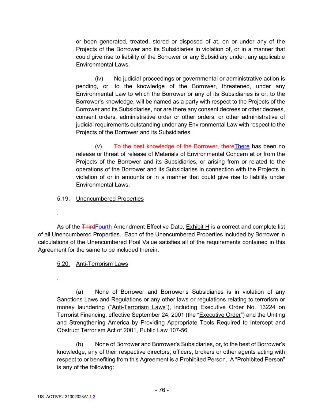 - 76 - US_ACTIVE\131002028\V-1-3 or been generated, treated, stored or disposed of at, on or under any of the Projects of the Borrower and its Subsidiaries in violation of, or in a manner that could give rise to liability of the Borrower or any Subsidiary under, any applicable Environmental Laws. (iv) No judicial proceedings or governmental or administrative action is pending, or, to the knowledge of the Borrower, threatened, under any Environmental Law to which the Borrower or any of its Subsidiaries is or, to the Borrower’s knowledge, will be named as a party with respect to the Projects of the Borrower and its Subsidiaries, nor are there any consent decrees or other decrees, consent orders, administrative order or other orders, or other administrative of judicial requirements outstanding under any Environmental Law with respect to the Projects of the Borrower and its Subsidiaries. (v) To the best knowledge of the Borrower, thereThere has been no release or threat of release of Materials of Environmental Concern at or from the Projects of the Borrower and its Subsidiaries, or arising from or related to the operations of the Borrower and its Subsidiaries in connection with the Projects in violation of or in amounts or in a manner that could give rise to liability under Environmental Laws. 5.19. Unencumbered Properties . As of the ThirdFourth Amendment Effective Date, Exhibit H is a correct and complete list of all Unencumbered Properties. Each of the Unencumbered Properties included by Borrower in calculations of the Unencumbered Pool Value satisfies all of the requirements contained in this Agreement for the same to be included therein. 5.20. Anti-Terrorism Laws . (a) None of Borrower and Borrower’s Subsidiaries is in violation of any Sanctions Laws and Regulations or any other laws or regulations relating to terrorism or money laundering (“Anti-Terrorism Laws”), including Executive Order No. 13224 on Terrorist Financing, effective September 24, 2001 (the “Executive Order”) and the Uniting and Strengthening America by Providing Appropriate Tools Required to Intercept and Obstruct Terrorism Act of 2001, Public Law 107-56. (b) None of Borrower and Borrower’s Subsidiaries, or, to the best of Borrower’s knowledge, any of their respective directors, officers, brokers or other agents acting with respect to or benefiting from this Agreement is a Prohibited Person. A “Prohibited Person” is any of the following: