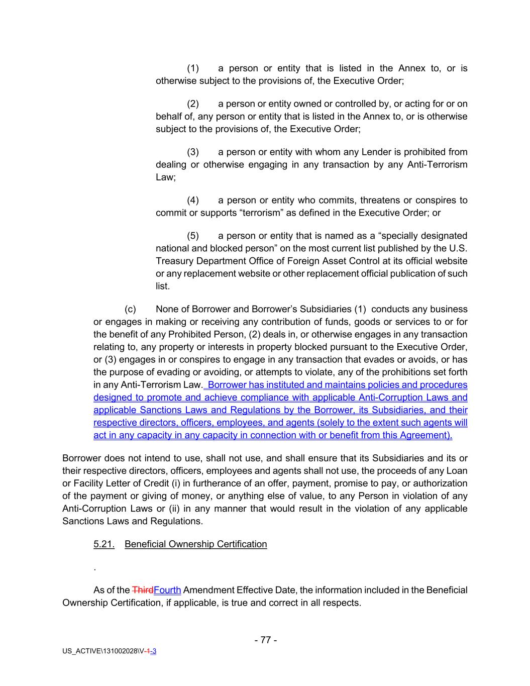 - 77 - US_ACTIVE\131002028\V-1-3 (1) a person or entity that is listed in the Annex to, or is otherwise subject to the provisions of, the Executive Order; (2) a person or entity owned or controlled by, or acting for or on behalf of, any person or entity that is listed in the Annex to, or is otherwise subject to the provisions of, the Executive Order; (3) a person or entity with whom any Lender is prohibited from dealing or otherwise engaging in any transaction by any Anti-Terrorism Law; (4) a person or entity who commits, threatens or conspires to commit or supports “terrorism” as defined in the Executive Order; or (5) a person or entity that is named as a “specially designated national and blocked person” on the most current list published by the U.S. Treasury Department Office of Foreign Asset Control at its official website or any replacement website or other replacement official publication of such list. (c) None of Borrower and Borrower’s Subsidiaries (1) conducts any business or engages in making or receiving any contribution of funds, goods or services to or for the benefit of any Prohibited Person, (2) deals in, or otherwise engages in any transaction relating to, any property or interests in property blocked pursuant to the Executive Order, or (3) engages in or conspires to engage in any transaction that evades or avoids, or has the purpose of evading or avoiding, or attempts to violate, any of the prohibitions set forth in any Anti-Terrorism Law. Borrower has instituted and maintains policies and procedures designed to promote and achieve compliance with applicable Anti-Corruption Laws and applicable Sanctions Laws and Regulations by the Borrower, its Subsidiaries, and their respective directors, officers, employees, and agents (solely to the extent such agents will act in any capacity in any capacity in connection with or benefit from this Agreement). Borrower does not intend to use, shall not use, and shall ensure that its Subsidiaries and its or their respective directors, officers, employees and agents shall not use, the proceeds of any Loan or Facility Letter of Credit (i) in furtherance of an offer, payment, promise to pay, or authorization of the payment or giving of money, or anything else of value, to any Person in violation of any Anti-Corruption Laws or (ii) in any manner that would result in the violation of any applicable Sanctions Laws and Regulations. 5.21. Beneficial Ownership Certification . As of the ThirdFourth Amendment Effective Date, the information included in the Beneficial Ownership Certification, if applicable, is true and correct in all respects.