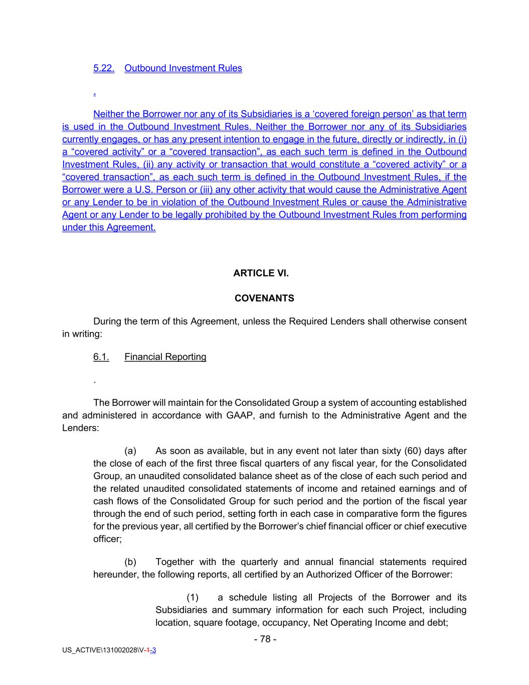 - 78 - US_ACTIVE\131002028\V-1-3 5.22. Outbound Investment Rules . Neither the Borrower nor any of its Subsidiaries is a ‘covered foreign person’ as that term is used in the Outbound Investment Rules. Neither the Borrower nor any of its Subsidiaries currently engages, or has any present intention to engage in the future, directly or indirectly, in (i) a “covered activity” or a “covered transaction”, as each such term is defined in the Outbound Investment Rules, (ii) any activity or transaction that would constitute a “covered activity” or a “covered transaction”, as each such term is defined in the Outbound Investment Rules, if the Borrower were a U.S. Person or (iii) any other activity that would cause the Administrative Agent or any Lender to be in violation of the Outbound Investment Rules or cause the Administrative Agent or any Lender to be legally prohibited by the Outbound Investment Rules from performing under this Agreement. ARTICLE VI. COVENANTS During the term of this Agreement, unless the Required Lenders shall otherwise consent in writing: 6.1. Financial Reporting . The Borrower will maintain for the Consolidated Group a system of accounting established and administered in accordance with GAAP, and furnish to the Administrative Agent and the Lenders: (a) As soon as available, but in any event not later than sixty (60) days after the close of each of the first three fiscal quarters of any fiscal year, for the Consolidated Group, an unaudited consolidated balance sheet as of the close of each such period and the related unaudited consolidated statements of income and retained earnings and of cash flows of the Consolidated Group for such period and the portion of the fiscal year through the end of such period, setting forth in each case in comparative form the figures for the previous year, all certified by the Borrower’s chief financial officer or chief executive officer; (b) Together with the quarterly and annual financial statements required hereunder, the following reports, all certified by an Authorized Officer of the Borrower: (1) a schedule listing all Projects of the Borrower and its Subsidiaries and summary information for each such Project, including location, square footage, occupancy, Net Operating Income and debt;
