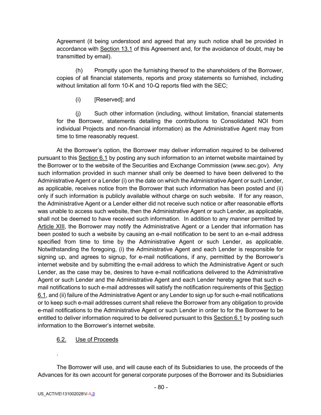 - 80 - US_ACTIVE\131002028\V-1-3 Agreement (it being understood and agreed that any such notice shall be provided in accordance with Section 13.1 of this Agreement and, for the avoidance of doubt, may be transmitted by email). (h) Promptly upon the furnishing thereof to the shareholders of the Borrower, copies of all financial statements, reports and proxy statements so furnished, including without limitation all form 10-K and 10-Q reports filed with the SEC; (i) [Reserved]; and (j) Such other information (including, without limitation, financial statements for the Borrower, statements detailing the contributions to Consolidated NOI from individual Projects and non-financial information) as the Administrative Agent may from time to time reasonably request. At the Borrower’s option, the Borrower may deliver information required to be delivered pursuant to this Section 6.1 by posting any such information to an internet website maintained by the Borrower or to the website of the Securities and Exchange Commission (www.sec.gov). Any such information provided in such manner shall only be deemed to have been delivered to the Administrative Agent or a Lender (i) on the date on which the Administrative Agent or such Lender, as applicable, receives notice from the Borrower that such information has been posted and (ii) only if such information is publicly available without charge on such website. If for any reason, the Administrative Agent or a Lender either did not receive such notice or after reasonable efforts was unable to access such website, then the Administrative Agent or such Lender, as applicable, shall not be deemed to have received such information. In addition to any manner permitted by Article XIII, the Borrower may notify the Administrative Agent or a Lender that information has been posted to such a website by causing an e-mail notification to be sent to an e-mail address specified from time to time by the Administrative Agent or such Lender, as applicable. Notwithstanding the foregoing, (i) the Administrative Agent and each Lender is responsible for signing up, and agrees to signup, for e-mail notifications, if any, permitted by the Borrower’s internet website and by submitting the e-mail address to which the Administrative Agent or such Lender, as the case may be, desires to have e-mail notifications delivered to the Administrative Agent or such Lender and the Administrative Agent and each Lender hereby agree that such e- mail notifications to such e-mail addresses will satisfy the notification requirements of this Section 6.1, and (ii) failure of the Administrative Agent or any Lender to sign up for such e-mail notifications or to keep such e-mail addresses current shall relieve the Borrower from any obligation to provide e-mail notifications to the Administrative Agent or such Lender in order to for the Borrower to be entitled to deliver information required to be delivered pursuant to this Section 6.1 by posting such information to the Borrower’s internet website. 6.2. Use of Proceeds . The Borrower will use, and will cause each of its Subsidiaries to use, the proceeds of the Advances for its own account for general corporate purposes of the Borrower and its Subsidiaries