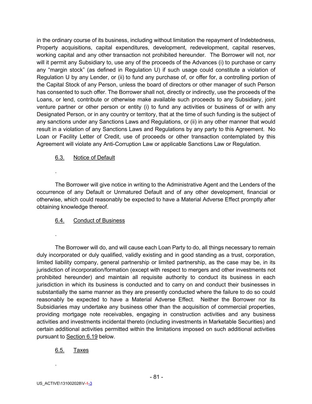 - 81 - US_ACTIVE\131002028\V-1-3 in the ordinary course of its business, including without limitation the repayment of Indebtedness, Property acquisitions, capital expenditures, development, redevelopment, capital reserves, working capital and any other transaction not prohibited hereunder. The Borrower will not, nor will it permit any Subsidiary to, use any of the proceeds of the Advances (i) to purchase or carry any “margin stock” (as defined in Regulation U) if such usage could constitute a violation of Regulation U by any Lender, or (ii) to fund any purchase of, or offer for, a controlling portion of the Capital Stock of any Person, unless the board of directors or other manager of such Person has consented to such offer. The Borrower shall not, directly or indirectly, use the proceeds of the Loans, or lend, contribute or otherwise make available such proceeds to any Subsidiary, joint venture partner or other person or entity (i) to fund any activities or business of or with any Designated Person, or in any country or territory, that at the time of such funding is the subject of any sanctions under any Sanctions Laws and Regulations, or (ii) in any other manner that would result in a violation of any Sanctions Laws and Regulations by any party to this Agreement. No Loan or Facility Letter of Credit, use of proceeds or other transaction contemplated by this Agreement will violate any Anti-Corruption Law or applicable Sanctions Law or Regulation. 6.3. Notice of Default . The Borrower will give notice in writing to the Administrative Agent and the Lenders of the occurrence of any Default or Unmatured Default and of any other development, financial or otherwise, which could reasonably be expected to have a Material Adverse Effect promptly after obtaining knowledge thereof. 6.4. Conduct of Business . The Borrower will do, and will cause each Loan Party to do, all things necessary to remain duly incorporated or duly qualified, validly existing and in good standing as a trust, corporation, limited liability company, general partnership or limited partnership, as the case may be, in its jurisdiction of incorporation/formation (except with respect to mergers and other investments not prohibited hereunder) and maintain all requisite authority to conduct its business in each jurisdiction in which its business is conducted and to carry on and conduct their businesses in substantially the same manner as they are presently conducted where the failure to do so could reasonably be expected to have a Material Adverse Effect. Neither the Borrower nor its Subsidiaries may undertake any business other than the acquisition of commercial properties, providing mortgage note receivables, engaging in construction activities and any business activities and investments incidental thereto (including investments in Marketable Securities) and certain additional activities permitted within the limitations imposed on such additional activities pursuant to Section 6.19 below. 6.5. Taxes .