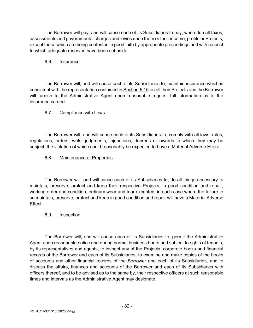- 82 - US_ACTIVE\131002028\V-1-3 The Borrower will pay, and will cause each of its Subsidiaries to pay, when due all taxes, assessments and governmental charges and levies upon them or their income, profits or Projects, except those which are being contested in good faith by appropriate proceedings and with respect to which adequate reserves have been set aside. 6.6. Insurance . The Borrower will, and will cause each of its Subsidiaries to, maintain insurance which is consistent with the representation contained in Section 5.16 on all their Projects and the Borrower will furnish to the Administrative Agent upon reasonable request full information as to the insurance carried. 6.7. Compliance with Laws . The Borrower will, and will cause each of its Subsidiaries to, comply with all laws, rules, regulations, orders, writs, judgments, injunctions, decrees or awards to which they may be subject, the violation of which could reasonably be expected to have a Material Adverse Effect. 6.8. Maintenance of Properties . The Borrower will, and will cause each of its Subsidiaries to, do all things necessary to maintain, preserve, protect and keep their respective Projects, in good condition and repair, working order and condition, ordinary wear and tear excepted, in each case where the failure to so maintain, preserve, protect and keep in good condition and repair will have a Material Adverse Effect. 6.9. Inspection . The Borrower will, and will cause each of its Subsidiaries to, permit the Administrative Agent upon reasonable notice and during normal business hours and subject to rights of tenants, by its representatives and agents, to inspect any of the Projects, corporate books and financial records of the Borrower and each of its Subsidiaries, to examine and make copies of the books of accounts and other financial records of the Borrower and each of its Subsidiaries, and to discuss the affairs, finances and accounts of the Borrower and each of its Subsidiaries with officers thereof, and to be advised as to the same by, their respective officers at such reasonable times and intervals as the Administrative Agent may designate.
