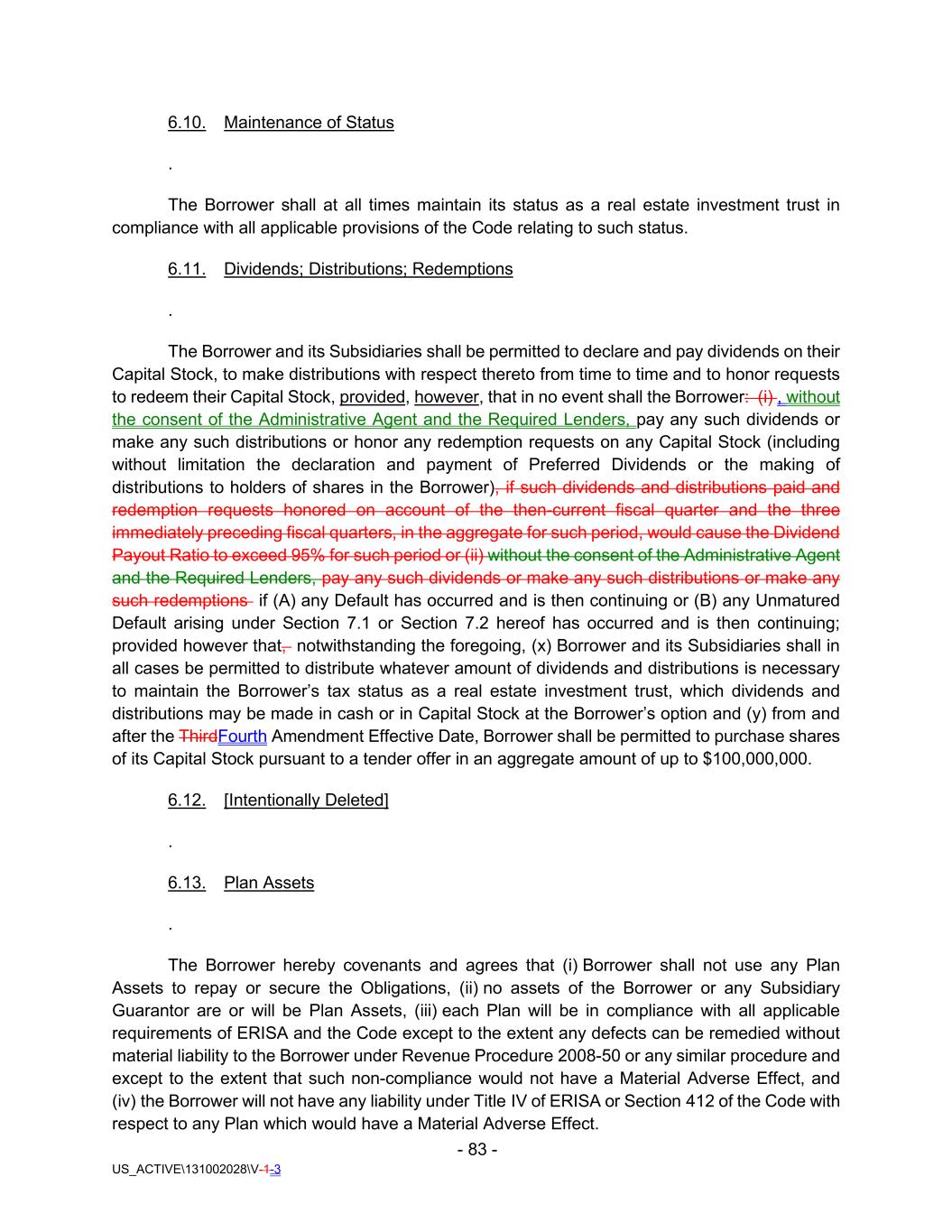 - 83 - US_ACTIVE\131002028\V-1-3 6.10. Maintenance of Status . The Borrower shall at all times maintain its status as a real estate investment trust in compliance with all applicable provisions of the Code relating to such status. 6.11. Dividends; Distributions; Redemptions . The Borrower and its Subsidiaries shall be permitted to declare and pay dividends on their Capital Stock, to make distributions with respect thereto from time to time and to honor requests to redeem their Capital Stock, provided, however, that in no event shall the Borrower: (i) , without the consent of the Administrative Agent and the Required Lenders, pay any such dividends or make any such distributions or honor any redemption requests on any Capital Stock (including without limitation the declaration and payment of Preferred Dividends or the making of distributions to holders of shares in the Borrower), if such dividends and distributions paid and redemption requests honored on account of the then-current fiscal quarter and the three immediately preceding fiscal quarters, in the aggregate for such period, would cause the Dividend Payout Ratio to exceed 95% for such period or (ii) without the consent of the Administrative Agent and the Required Lenders, pay any such dividends or make any such distributions or make any such redemptions if (A) any Default has occurred and is then continuing or (B) any Unmatured Default arising under Section 7.1 or Section 7.2 hereof has occurred and is then continuing; provided however that, notwithstanding the foregoing, (x) Borrower and its Subsidiaries shall in all cases be permitted to distribute whatever amount of dividends and distributions is necessary to maintain the Borrower’s tax status as a real estate investment trust, which dividends and distributions may be made in cash or in Capital Stock at the Borrower’s option and (y) from and after the ThirdFourth Amendment Effective Date, Borrower shall be permitted to purchase shares of its Capital Stock pursuant to a tender offer in an aggregate amount of up to $100,000,000. 6.12. [Intentionally Deleted] . 6.13. Plan Assets . The Borrower hereby covenants and agrees that (i) Borrower shall not use any Plan Assets to repay or secure the Obligations, (ii) no assets of the Borrower or any Subsidiary Guarantor are or will be Plan Assets, (iii) each Plan will be in compliance with all applicable requirements of ERISA and the Code except to the extent any defects can be remedied without material liability to the Borrower under Revenue Procedure 2008-50 or any similar procedure and except to the extent that such non-compliance would not have a Material Adverse Effect, and (iv) the Borrower will not have any liability under Title IV of ERISA or Section 412 of the Code with respect to any Plan which would have a Material Adverse Effect.