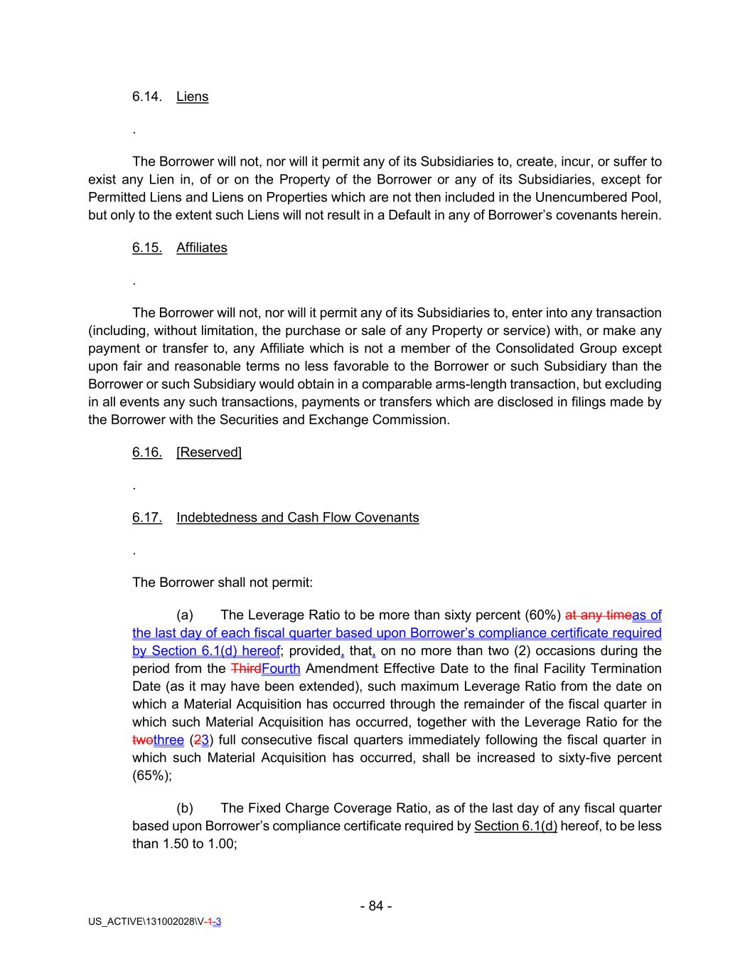 - 84 - US_ACTIVE\131002028\V-1-3 6.14. Liens . The Borrower will not, nor will it permit any of its Subsidiaries to, create, incur, or suffer to exist any Lien in, of or on the Property of the Borrower or any of its Subsidiaries, except for Permitted Liens and Liens on Properties which are not then included in the Unencumbered Pool, but only to the extent such Liens will not result in a Default in any of Borrower’s covenants herein. 6.15. Affiliates . The Borrower will not, nor will it permit any of its Subsidiaries to, enter into any transaction (including, without limitation, the purchase or sale of any Property or service) with, or make any payment or transfer to, any Affiliate which is not a member of the Consolidated Group except upon fair and reasonable terms no less favorable to the Borrower or such Subsidiary than the Borrower or such Subsidiary would obtain in a comparable arms-length transaction, but excluding in all events any such transactions, payments or transfers which are disclosed in filings made by the Borrower with the Securities and Exchange Commission. 6.16. [Reserved] . 6.17. Indebtedness and Cash Flow Covenants . The Borrower shall not permit: (a) The Leverage Ratio to be more than sixty percent (60%) at any timeas of the last day of each fiscal quarter based upon Borrower’s compliance certificate required by Section 6.1(d) hereof; provided, that, on no more than two (2) occasions during the period from the ThirdFourth Amendment Effective Date to the final Facility Termination Date (as it may have been extended), such maximum Leverage Ratio from the date on which a Material Acquisition has occurred through the remainder of the fiscal quarter in which such Material Acquisition has occurred, together with the Leverage Ratio for the twothree (23) full consecutive fiscal quarters immediately following the fiscal quarter in which such Material Acquisition has occurred, shall be increased to sixty-five percent (65%); (b) The Fixed Charge Coverage Ratio, as of the last day of any fiscal quarter based upon Borrower’s compliance certificate required by Section 6.1(d) hereof, to be less than 1.50 to 1.00;