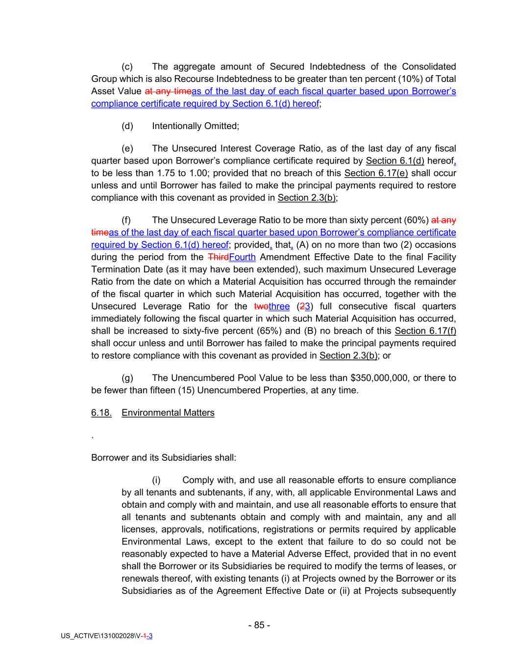 - 85 - US_ACTIVE\131002028\V-1-3 (c) The aggregate amount of Secured Indebtedness of the Consolidated Group which is also Recourse Indebtedness to be greater than ten percent (10%) of Total Asset Value at any timeas of the last day of each fiscal quarter based upon Borrower’s compliance certificate required by Section 6.1(d) hereof; (d) Intentionally Omitted; (e) The Unsecured Interest Coverage Ratio, as of the last day of any fiscal quarter based upon Borrower’s compliance certificate required by Section 6.1(d) hereof, to be less than 1.75 to 1.00; provided that no breach of this Section 6.17(e) shall occur unless and until Borrower has failed to make the principal payments required to restore compliance with this covenant as provided in Section 2.3(b); (f) The Unsecured Leverage Ratio to be more than sixty percent (60%) at any timeas of the last day of each fiscal quarter based upon Borrower’s compliance certificate required by Section 6.1(d) hereof; provided, that, (A) on no more than two (2) occasions during the period from the ThirdFourth Amendment Effective Date to the final Facility Termination Date (as it may have been extended), such maximum Unsecured Leverage Ratio from the date on which a Material Acquisition has occurred through the remainder of the fiscal quarter in which such Material Acquisition has occurred, together with the Unsecured Leverage Ratio for the twothree (23) full consecutive fiscal quarters immediately following the fiscal quarter in which such Material Acquisition has occurred, shall be increased to sixty-five percent (65%) and (B) no breach of this Section 6.17(f) shall occur unless and until Borrower has failed to make the principal payments required to restore compliance with this covenant as provided in Section 2.3(b); or (g) The Unencumbered Pool Value to be less than $350,000,000, or there to be fewer than fifteen (15) Unencumbered Properties, at any time. 6.18. Environmental Matters . Borrower and its Subsidiaries shall: (i) Comply with, and use all reasonable efforts to ensure compliance by all tenants and subtenants, if any, with, all applicable Environmental Laws and obtain and comply with and maintain, and use all reasonable efforts to ensure that all tenants and subtenants obtain and comply with and maintain, any and all licenses, approvals, notifications, registrations or permits required by applicable Environmental Laws, except to the extent that failure to do so could not be reasonably expected to have a Material Adverse Effect, provided that in no event shall the Borrower or its Subsidiaries be required to modify the terms of leases, or renewals thereof, with existing tenants (i) at Projects owned by the Borrower or its Subsidiaries as of the Agreement Effective Date or (ii) at Projects subsequently