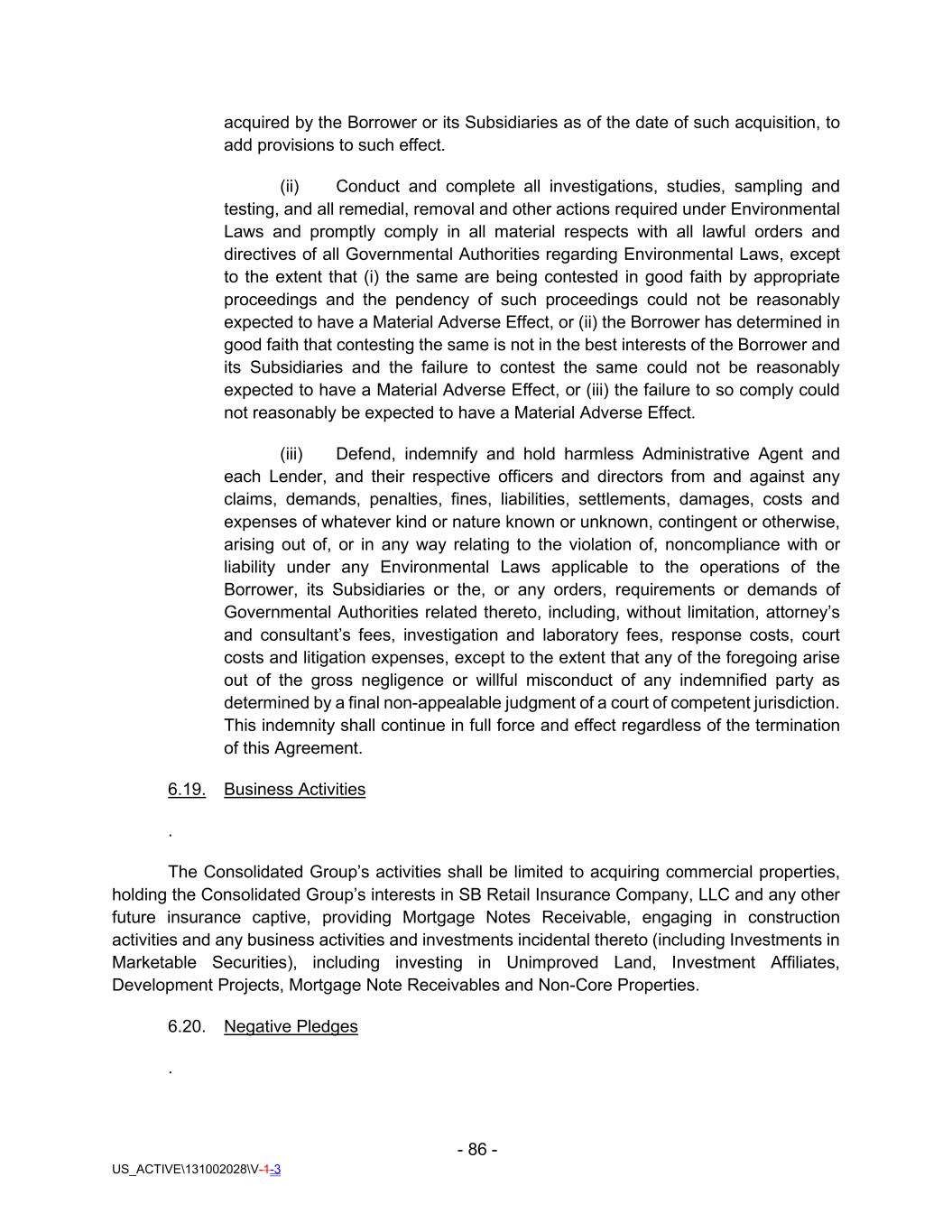 - 86 - US_ACTIVE\131002028\V-1-3 acquired by the Borrower or its Subsidiaries as of the date of such acquisition, to add provisions to such effect. (ii) Conduct and complete all investigations, studies, sampling and testing, and all remedial, removal and other actions required under Environmental Laws and promptly comply in all material respects with all lawful orders and directives of all Governmental Authorities regarding Environmental Laws, except to the extent that (i) the same are being contested in good faith by appropriate proceedings and the pendency of such proceedings could not be reasonably expected to have a Material Adverse Effect, or (ii) the Borrower has determined in good faith that contesting the same is not in the best interests of the Borrower and its Subsidiaries and the failure to contest the same could not be reasonably expected to have a Material Adverse Effect, or (iii) the failure to so comply could not reasonably be expected to have a Material Adverse Effect. (iii) Defend, indemnify and hold harmless Administrative Agent and each Lender, and their respective officers and directors from and against any claims, demands, penalties, fines, liabilities, settlements, damages, costs and expenses of whatever kind or nature known or unknown, contingent or otherwise, arising out of, or in any way relating to the violation of, noncompliance with or liability under any Environmental Laws applicable to the operations of the Borrower, its Subsidiaries or the, or any orders, requirements or demands of Governmental Authorities related thereto, including, without limitation, attorney’s and consultant’s fees, investigation and laboratory fees, response costs, court costs and litigation expenses, except to the extent that any of the foregoing arise out of the gross negligence or willful misconduct of any indemnified party as determined by a final non-appealable judgment of a court of competent jurisdiction. This indemnity shall continue in full force and effect regardless of the termination of this Agreement. 6.19. Business Activities . The Consolidated Group’s activities shall be limited to acquiring commercial properties, holding the Consolidated Group’s interests in SB Retail Insurance Company, LLC and any other future insurance captive, providing Mortgage Notes Receivable, engaging in construction activities and any business activities and investments incidental thereto (including Investments in Marketable Securities), including investing in Unimproved Land, Investment Affiliates, Development Projects, Mortgage Note Receivables and Non-Core Properties. 6.20. Negative Pledges .