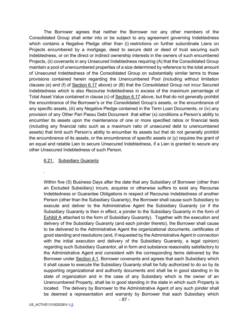 - 87 - US_ACTIVE\131002028\V-1-3 The Borrower agrees that neither the Borrower nor any other members of the Consolidated Group shall enter into or be subject to any agreement governing Indebtedness which contains a Negative Pledge other than (i) restrictions on further subordinate Liens on Projects encumbered by a mortgage, deed to secure debt or deed of trust securing such Indebtedness, or on the direct or indirect ownership interests in the owners of such encumbered Projects, (ii) covenants in any Unsecured Indebtedness requiring (A) that the Consolidated Group maintain a pool of unencumbered properties of a size determined by reference to the total amount of Unsecured Indebtedness of the Consolidated Group on substantially similar terms to those provisions contained herein regarding the Unencumbered Pool (including without limitation clauses (e) and (f) of Section 6.17 above) or (B) that the Consolidated Group not incur Secured Indebtedness which is also Recourse Indebtedness in excess of the maximum percentage of Total Asset Value contained in clause (c) of Section 6.17 above, but that do not generally prohibit the encumbrance of the Borrower’s or the Consolidated Group’s assets, or the encumbrance of any specific assets, (iii) any Negative Pledge contained in the Term Loan Documents, or (iv) any provision of any Other Pari Passu Debt Document that either (x) conditions a Person’s ability to encumber its assets upon the maintenance of one or more specified ratios or financial tests (including any financial ratio such as a maximum ratio of unsecured debt to unencumbered assets) that limit such Person’s ability to encumber its assets but that do not generally prohibit the encumbrance of its assets, or the encumbrance of specific assets or (y) requires the grant of an equal and ratable Lien to secure Unsecured Indebtedness, if a Lien is granted to secure any other Unsecured Indebtedness of such Person. 6.21. Subsidiary Guaranty . Within five (5) Business Days after the date that any Subsidiary of Borrower (other than an Excluded Subsidiary) incurs, acquires or otherwise suffers to exist any Recourse Indebtedness or Guarantee Obligations in respect of Recourse Indebtedness of another Person (other than the Subsidiary Guaranty), the Borrower shall cause such Subsidiary to execute and deliver to the Administrative Agent the Subsidiary Guaranty (or if the Subsidiary Guaranty is then in effect, a joinder to the Subsidiary Guaranty in the form of Exhibit A attached to the form of Subsidiary Guaranty). Together with the execution and delivery of the Subsidiary Guaranty (and each joinder thereto), the Borrower shall cause to be delivered to the Administrative Agent the organizational documents, certificates of good standing and resolutions (and, if requested by the Administrative Agent in connection with the initial execution and delivery of the Subsidiary Guaranty, a legal opinion) regarding such Subsidiary Guarantor, all in form and substance reasonably satisfactory to the Administrative Agent and consistent with the corresponding items delivered by the Borrower under Section 4.1. Borrower covenants and agrees that each Subsidiary which it shall cause to execute the Subsidiary Guaranty shall be fully authorized to do so by its supporting organizational and authority documents and shall be in good standing in its state of organization and in the case of any Subsidiary which is the owner of an Unencumbered Property, shall be in good standing in the state in which such Property is located. The delivery by Borrower to the Administrative Agent of any such joinder shall be deemed a representation and warranty by Borrower that each Subsidiary which