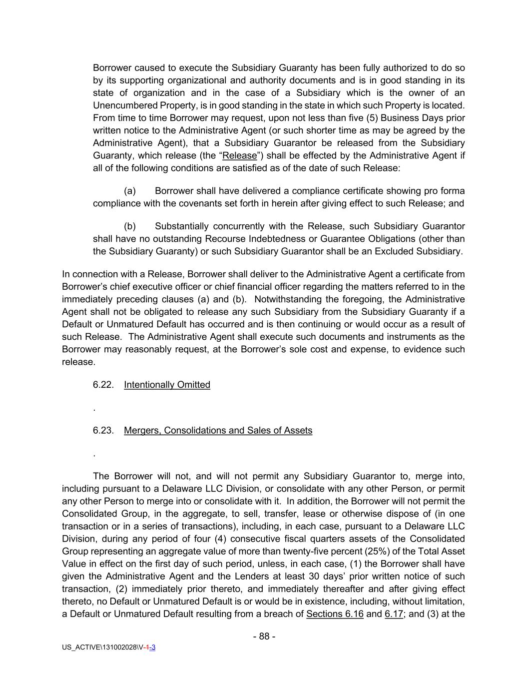 - 88 - US_ACTIVE\131002028\V-1-3 Borrower caused to execute the Subsidiary Guaranty has been fully authorized to do so by its supporting organizational and authority documents and is in good standing in its state of organization and in the case of a Subsidiary which is the owner of an Unencumbered Property, is in good standing in the state in which such Property is located. From time to time Borrower may request, upon not less than five (5) Business Days prior written notice to the Administrative Agent (or such shorter time as may be agreed by the Administrative Agent), that a Subsidiary Guarantor be released from the Subsidiary Guaranty, which release (the “Release”) shall be effected by the Administrative Agent if all of the following conditions are satisfied as of the date of such Release: (a) Borrower shall have delivered a compliance certificate showing pro forma compliance with the covenants set forth in herein after giving effect to such Release; and (b) Substantially concurrently with the Release, such Subsidiary Guarantor shall have no outstanding Recourse Indebtedness or Guarantee Obligations (other than the Subsidiary Guaranty) or such Subsidiary Guarantor shall be an Excluded Subsidiary. In connection with a Release, Borrower shall deliver to the Administrative Agent a certificate from Borrower’s chief executive officer or chief financial officer regarding the matters referred to in the immediately preceding clauses (a) and (b). Notwithstanding the foregoing, the Administrative Agent shall not be obligated to release any such Subsidiary from the Subsidiary Guaranty if a Default or Unmatured Default has occurred and is then continuing or would occur as a result of such Release. The Administrative Agent shall execute such documents and instruments as the Borrower may reasonably request, at the Borrower’s sole cost and expense, to evidence such release. 6.22. Intentionally Omitted . 6.23. Mergers, Consolidations and Sales of Assets . The Borrower will not, and will not permit any Subsidiary Guarantor to, merge into, including pursuant to a Delaware LLC Division, or consolidate with any other Person, or permit any other Person to merge into or consolidate with it. In addition, the Borrower will not permit the Consolidated Group, in the aggregate, to sell, transfer, lease or otherwise dispose of (in one transaction or in a series of transactions), including, in each case, pursuant to a Delaware LLC Division, during any period of four (4) consecutive fiscal quarters assets of the Consolidated Group representing an aggregate value of more than twenty-five percent (25%) of the Total Asset Value in effect on the first day of such period, unless, in each case, (1) the Borrower shall have given the Administrative Agent and the Lenders at least 30 days’ prior written notice of such transaction, (2) immediately prior thereto, and immediately thereafter and after giving effect thereto, no Default or Unmatured Default is or would be in existence, including, without limitation, a Default or Unmatured Default resulting from a breach of Sections 6.16 and 6.17; and (3) at the