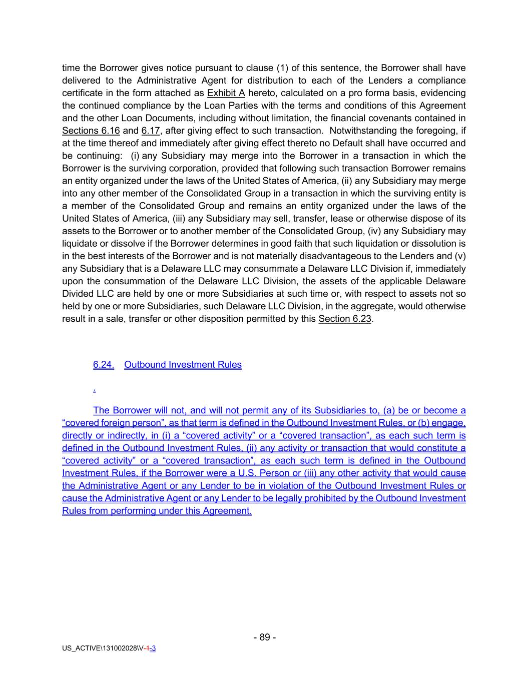 - 89 - US_ACTIVE\131002028\V-1-3 time the Borrower gives notice pursuant to clause (1) of this sentence, the Borrower shall have delivered to the Administrative Agent for distribution to each of the Lenders a compliance certificate in the form attached as Exhibit A hereto, calculated on a pro forma basis, evidencing the continued compliance by the Loan Parties with the terms and conditions of this Agreement and the other Loan Documents, including without limitation, the financial covenants contained in Sections 6.16 and 6.17, after giving effect to such transaction. Notwithstanding the foregoing, if at the time thereof and immediately after giving effect thereto no Default shall have occurred and be continuing: (i) any Subsidiary may merge into the Borrower in a transaction in which the Borrower is the surviving corporation, provided that following such transaction Borrower remains an entity organized under the laws of the United States of America, (ii) any Subsidiary may merge into any other member of the Consolidated Group in a transaction in which the surviving entity is a member of the Consolidated Group and remains an entity organized under the laws of the United States of America, (iii) any Subsidiary may sell, transfer, lease or otherwise dispose of its assets to the Borrower or to another member of the Consolidated Group, (iv) any Subsidiary may liquidate or dissolve if the Borrower determines in good faith that such liquidation or dissolution is in the best interests of the Borrower and is not materially disadvantageous to the Lenders and (v) any Subsidiary that is a Delaware LLC may consummate a Delaware LLC Division if, immediately upon the consummation of the Delaware LLC Division, the assets of the applicable Delaware Divided LLC are held by one or more Subsidiaries at such time or, with respect to assets not so held by one or more Subsidiaries, such Delaware LLC Division, in the aggregate, would otherwise result in a sale, transfer or other disposition permitted by this Section 6.23. 6.24. Outbound Investment Rules . The Borrower will not, and will not permit any of its Subsidiaries to, (a) be or become a “covered foreign person”, as that term is defined in the Outbound Investment Rules, or (b) engage, directly or indirectly, in (i) a “covered activity” or a “covered transaction”, as each such term is defined in the Outbound Investment Rules, (ii) any activity or transaction that would constitute a “covered activity” or a “covered transaction”, as each such term is defined in the Outbound Investment Rules, if the Borrower were a U.S. Person or (iii) any other activity that would cause the Administrative Agent or any Lender to be in violation of the Outbound Investment Rules or cause the Administrative Agent or any Lender to be legally prohibited by the Outbound Investment Rules from performing under this Agreement.