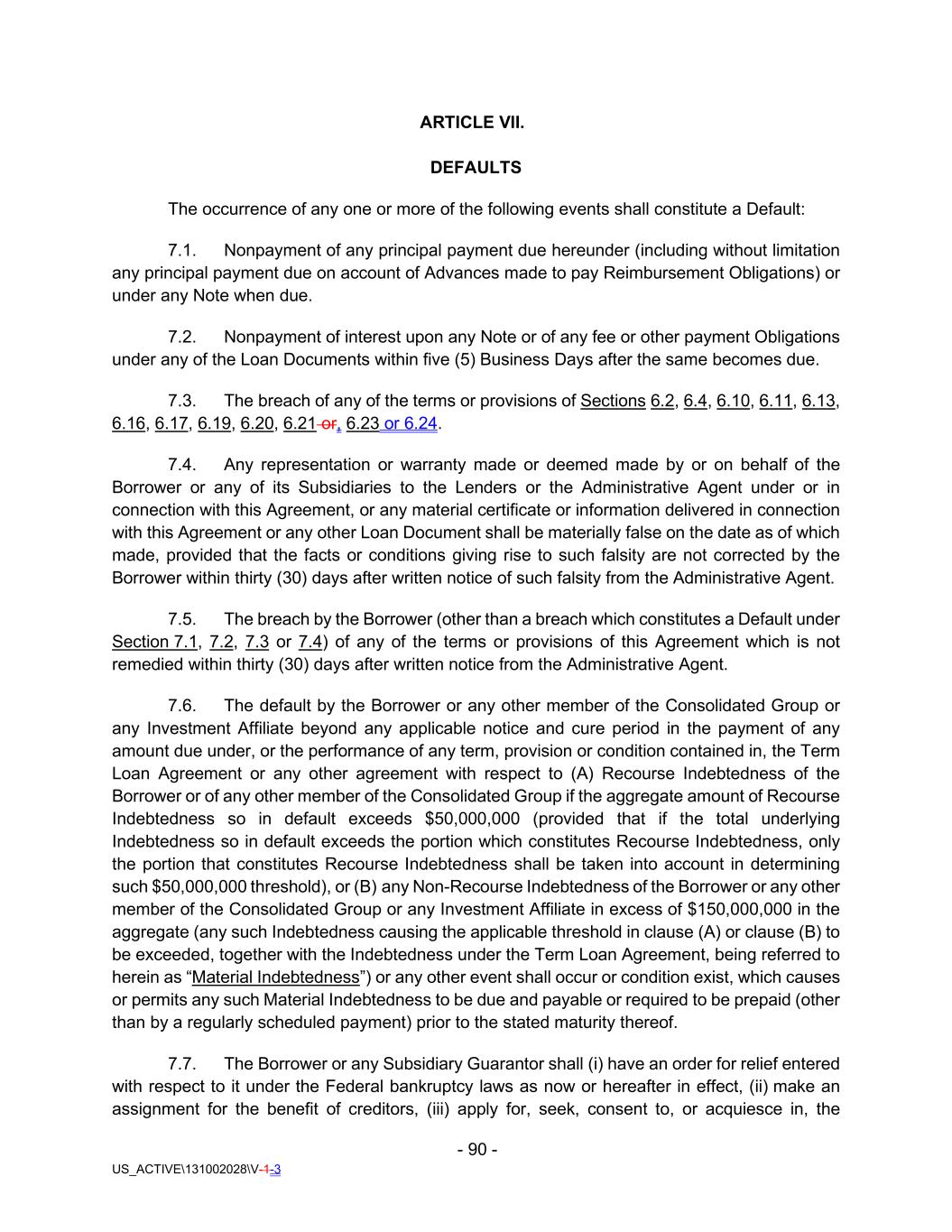- 90 - US_ACTIVE\131002028\V-1-3 ARTICLE VII. DEFAULTS The occurrence of any one or more of the following events shall constitute a Default: 7.1. Nonpayment of any principal payment due hereunder (including without limitation any principal payment due on account of Advances made to pay Reimbursement Obligations) or under any Note when due. 7.2. Nonpayment of interest upon any Note or of any fee or other payment Obligations under any of the Loan Documents within five (5) Business Days after the same becomes due. 7.3. The breach of any of the terms or provisions of Sections 6.2, 6.4, 6.10, 6.11, 6.13, 6.16, 6.17, 6.19, 6.20, 6.21 or, 6.23 or 6.24. 7.4. Any representation or warranty made or deemed made by or on behalf of the Borrower or any of its Subsidiaries to the Lenders or the Administrative Agent under or in connection with this Agreement, or any material certificate or information delivered in connection with this Agreement or any other Loan Document shall be materially false on the date as of which made, provided that the facts or conditions giving rise to such falsity are not corrected by the Borrower within thirty (30) days after written notice of such falsity from the Administrative Agent. 7.5. The breach by the Borrower (other than a breach which constitutes a Default under Section 7.1, 7.2, 7.3 or 7.4) of any of the terms or provisions of this Agreement which is not remedied within thirty (30) days after written notice from the Administrative Agent. 7.6. The default by the Borrower or any other member of the Consolidated Group or any Investment Affiliate beyond any applicable notice and cure period in the payment of any amount due under, or the performance of any term, provision or condition contained in, the Term Loan Agreement or any other agreement with respect to (A) Recourse Indebtedness of the Borrower or of any other member of the Consolidated Group if the aggregate amount of Recourse Indebtedness so in default exceeds $50,000,000 (provided that if the total underlying Indebtedness so in default exceeds the portion which constitutes Recourse Indebtedness, only the portion that constitutes Recourse Indebtedness shall be taken into account in determining such $50,000,000 threshold), or (B) any Non-Recourse Indebtedness of the Borrower or any other member of the Consolidated Group or any Investment Affiliate in excess of $150,000,000 in the aggregate (any such Indebtedness causing the applicable threshold in clause (A) or clause (B) to be exceeded, together with the Indebtedness under the Term Loan Agreement, being referred to herein as “Material Indebtedness”) or any other event shall occur or condition exist, which causes or permits any such Material Indebtedness to be due and payable or required to be prepaid (other than by a regularly scheduled payment) prior to the stated maturity thereof. 7.7. The Borrower or any Subsidiary Guarantor shall (i) have an order for relief entered with respect to it under the Federal bankruptcy laws as now or hereafter in effect, (ii) make an assignment for the benefit of creditors, (iii) apply for, seek, consent to, or acquiesce in, the