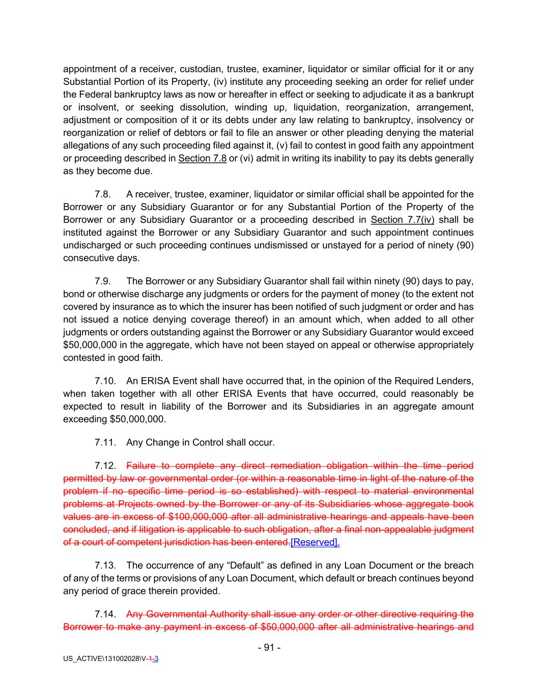- 91 - US_ACTIVE\131002028\V-1-3 appointment of a receiver, custodian, trustee, examiner, liquidator or similar official for it or any Substantial Portion of its Property, (iv) institute any proceeding seeking an order for relief under the Federal bankruptcy laws as now or hereafter in effect or seeking to adjudicate it as a bankrupt or insolvent, or seeking dissolution, winding up, liquidation, reorganization, arrangement, adjustment or composition of it or its debts under any law relating to bankruptcy, insolvency or reorganization or relief of debtors or fail to file an answer or other pleading denying the material allegations of any such proceeding filed against it, (v) fail to contest in good faith any appointment or proceeding described in Section 7.8 or (vi) admit in writing its inability to pay its debts generally as they become due. 7.8. A receiver, trustee, examiner, liquidator or similar official shall be appointed for the Borrower or any Subsidiary Guarantor or for any Substantial Portion of the Property of the Borrower or any Subsidiary Guarantor or a proceeding described in Section 7.7(iv) shall be instituted against the Borrower or any Subsidiary Guarantor and such appointment continues undischarged or such proceeding continues undismissed or unstayed for a period of ninety (90) consecutive days. 7.9. The Borrower or any Subsidiary Guarantor shall fail within ninety (90) days to pay, bond or otherwise discharge any judgments or orders for the payment of money (to the extent not covered by insurance as to which the insurer has been notified of such judgment or order and has not issued a notice denying coverage thereof) in an amount which, when added to all other judgments or orders outstanding against the Borrower or any Subsidiary Guarantor would exceed $50,000,000 in the aggregate, which have not been stayed on appeal or otherwise appropriately contested in good faith. 7.10. An ERISA Event shall have occurred that, in the opinion of the Required Lenders, when taken together with all other ERISA Events that have occurred, could reasonably be expected to result in liability of the Borrower and its Subsidiaries in an aggregate amount exceeding $50,000,000. 7.11. Any Change in Control shall occur. 7.12. Failure to complete any direct remediation obligation within the time period permitted by law or governmental order (or within a reasonable time in light of the nature of the problem if no specific time period is so established) with respect to material environmental problems at Projects owned by the Borrower or any of its Subsidiaries whose aggregate book values are in excess of $100,000,000 after all administrative hearings and appeals have been concluded, and if litigation is applicable to such obligation, after a final non-appealable judgment of a court of competent jurisdiction has been entered.[Reserved]. 7.13. The occurrence of any “Default” as defined in any Loan Document or the breach of any of the terms or provisions of any Loan Document, which default or breach continues beyond any period of grace therein provided. 7.14. Any Governmental Authority shall issue any order or other directive requiring the Borrower to make any payment in excess of $50,000,000 after all administrative hearings and