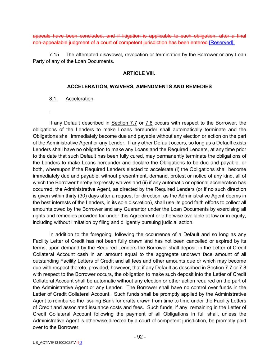 - 92 - US_ACTIVE\131002028\V-1-3 appeals have been concluded, and if litigation is applicable to such obligation, after a final non-appealable judgment of a court of competent jurisdiction has been entered.[Reserved]. 7.15 The attempted disavowal, revocation or termination by the Borrower or any Loan Party of any of the Loan Documents. ARTICLE VIII. ACCELERATION, WAIVERS, AMENDMENTS AND REMEDIES 8.1. Acceleration . If any Default described in Section 7.7 or 7.8 occurs with respect to the Borrower, the obligations of the Lenders to make Loans hereunder shall automatically terminate and the Obligations shall immediately become due and payable without any election or action on the part of the Administrative Agent or any Lender. If any other Default occurs, so long as a Default exists Lenders shall have no obligation to make any Loans and the Required Lenders, at any time prior to the date that such Default has been fully cured, may permanently terminate the obligations of the Lenders to make Loans hereunder and declare the Obligations to be due and payable, or both, whereupon if the Required Lenders elected to accelerate (i) the Obligations shall become immediately due and payable, without presentment, demand, protest or notice of any kind, all of which the Borrower hereby expressly waives and (ii) if any automatic or optional acceleration has occurred, the Administrative Agent, as directed by the Required Lenders (or if no such direction is given within thirty (30) days after a request for direction, as the Administrative Agent deems in the best interests of the Lenders, in its sole discretion), shall use its good faith efforts to collect all amounts owed by the Borrower and any Guarantor under the Loan Documents by exercising all rights and remedies provided for under this Agreement or otherwise available at law or in equity, including without limitation by filing and diligently pursuing judicial action. In addition to the foregoing, following the occurrence of a Default and so long as any Facility Letter of Credit has not been fully drawn and has not been cancelled or expired by its terms, upon demand by the Required Lenders the Borrower shall deposit in the Letter of Credit Collateral Account cash in an amount equal to the aggregate undrawn face amount of all outstanding Facility Letters of Credit and all fees and other amounts due or which may become due with respect thereto, provided, however, that if any Default as described in Section 7.7 or 7.8 with respect to the Borrower occurs, the obligation to make such deposit into the Letter of Credit Collateral Account shall be automatic without any election or other action required on the part of the Administrative Agent or any Lender. The Borrower shall have no control over funds in the Letter of Credit Collateral Account. Such funds shall be promptly applied by the Administrative Agent to reimburse the Issuing Bank for drafts drawn from time to time under the Facility Letters of Credit and associated issuance costs and fees. Such funds, if any, remaining in the Letter of Credit Collateral Account following the payment of all Obligations in full shall, unless the Administrative Agent is otherwise directed by a court of competent jurisdiction, be promptly paid over to the Borrower.