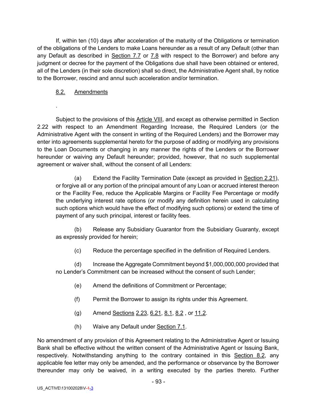 - 93 - US_ACTIVE\131002028\V-1-3 If, within ten (10) days after acceleration of the maturity of the Obligations or termination of the obligations of the Lenders to make Loans hereunder as a result of any Default (other than any Default as described in Section 7.7 or 7.8 with respect to the Borrower) and before any judgment or decree for the payment of the Obligations due shall have been obtained or entered, all of the Lenders (in their sole discretion) shall so direct, the Administrative Agent shall, by notice to the Borrower, rescind and annul such acceleration and/or termination. 8.2. Amendments . Subject to the provisions of this Article VIII, and except as otherwise permitted in Section 2.22 with respect to an Amendment Regarding Increase, the Required Lenders (or the Administrative Agent with the consent in writing of the Required Lenders) and the Borrower may enter into agreements supplemental hereto for the purpose of adding or modifying any provisions to the Loan Documents or changing in any manner the rights of the Lenders or the Borrower hereunder or waiving any Default hereunder; provided, however, that no such supplemental agreement or waiver shall, without the consent of all Lenders: (a) Extend the Facility Termination Date (except as provided in Section 2.21), or forgive all or any portion of the principal amount of any Loan or accrued interest thereon or the Facility Fee, reduce the Applicable Margins or Facility Fee Percentage or modify the underlying interest rate options (or modify any definition herein used in calculating such options which would have the effect of modifying such options) or extend the time of payment of any such principal, interest or facility fees. (b) Release any Subsidiary Guarantor from the Subsidiary Guaranty, except as expressly provided for herein; (c) Reduce the percentage specified in the definition of Required Lenders. (d) Increase the Aggregate Commitment beyond $1,000,000,000 provided that no Lender’s Commitment can be increased without the consent of such Lender; (e) Amend the definitions of Commitment or Percentage; (f) Permit the Borrower to assign its rights under this Agreement. (g) Amend Sections 2.23, 6.21, 8.1, 8.2 , or 11.2. (h) Waive any Default under Section 7.1. No amendment of any provision of this Agreement relating to the Administrative Agent or Issuing Bank shall be effective without the written consent of the Administrative Agent or Issuing Bank, respectively. Notwithstanding anything to the contrary contained in this Section 8.2, any applicable fee letter may only be amended, and the performance or observance by the Borrower thereunder may only be waived, in a writing executed by the parties thereto. Further