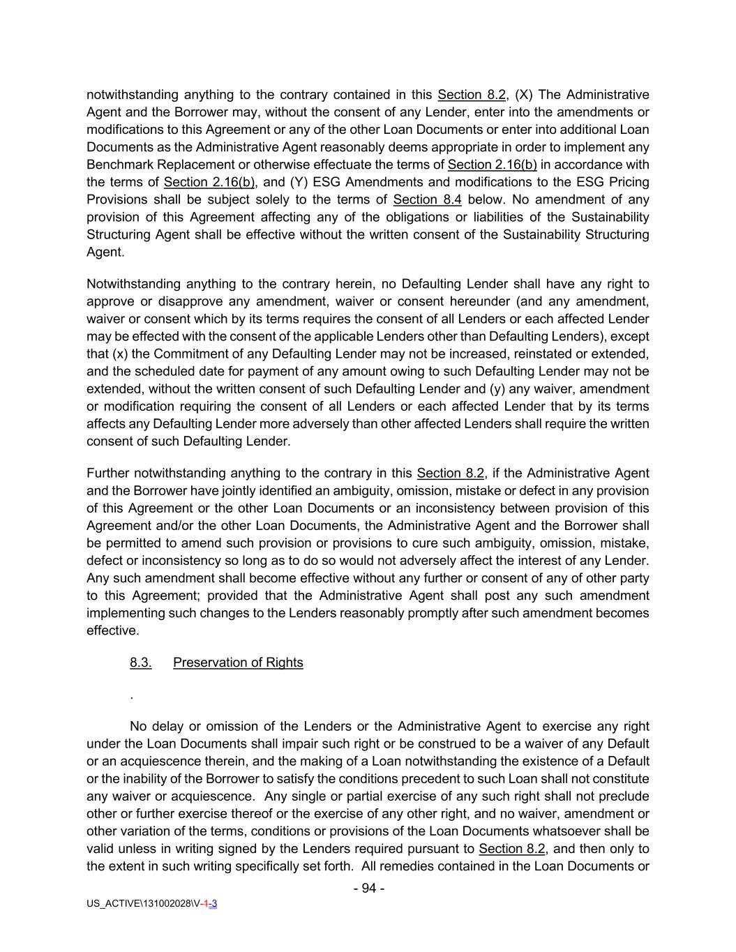 - 94 - US_ACTIVE\131002028\V-1-3 notwithstanding anything to the contrary contained in this Section 8.2, (X) The Administrative Agent and the Borrower may, without the consent of any Lender, enter into the amendments or modifications to this Agreement or any of the other Loan Documents or enter into additional Loan Documents as the Administrative Agent reasonably deems appropriate in order to implement any Benchmark Replacement or otherwise effectuate the terms of Section 2.16(b) in accordance with the terms of Section 2.16(b), and (Y) ESG Amendments and modifications to the ESG Pricing Provisions shall be subject solely to the terms of Section 8.4 below. No amendment of any provision of this Agreement affecting any of the obligations or liabilities of the Sustainability Structuring Agent shall be effective without the written consent of the Sustainability Structuring Agent. Notwithstanding anything to the contrary herein, no Defaulting Lender shall have any right to approve or disapprove any amendment, waiver or consent hereunder (and any amendment, waiver or consent which by its terms requires the consent of all Lenders or each affected Lender may be effected with the consent of the applicable Lenders other than Defaulting Lenders), except that (x) the Commitment of any Defaulting Lender may not be increased, reinstated or extended, and the scheduled date for payment of any amount owing to such Defaulting Lender may not be extended, without the written consent of such Defaulting Lender and (y) any waiver, amendment or modification requiring the consent of all Lenders or each affected Lender that by its terms affects any Defaulting Lender more adversely than other affected Lenders shall require the written consent of such Defaulting Lender. Further notwithstanding anything to the contrary in this Section 8.2, if the Administrative Agent and the Borrower have jointly identified an ambiguity, omission, mistake or defect in any provision of this Agreement or the other Loan Documents or an inconsistency between provision of this Agreement and/or the other Loan Documents, the Administrative Agent and the Borrower shall be permitted to amend such provision or provisions to cure such ambiguity, omission, mistake, defect or inconsistency so long as to do so would not adversely affect the interest of any Lender. Any such amendment shall become effective without any further or consent of any of other party to this Agreement; provided that the Administrative Agent shall post any such amendment implementing such changes to the Lenders reasonably promptly after such amendment becomes effective. 8.3. Preservation of Rights . No delay or omission of the Lenders or the Administrative Agent to exercise any right under the Loan Documents shall impair such right or be construed to be a waiver of any Default or an acquiescence therein, and the making of a Loan notwithstanding the existence of a Default or the inability of the Borrower to satisfy the conditions precedent to such Loan shall not constitute any waiver or acquiescence. Any single or partial exercise of any such right shall not preclude other or further exercise thereof or the exercise of any other right, and no waiver, amendment or other variation of the terms, conditions or provisions of the Loan Documents whatsoever shall be valid unless in writing signed by the Lenders required pursuant to Section 8.2, and then only to the extent in such writing specifically set forth. All remedies contained in the Loan Documents or