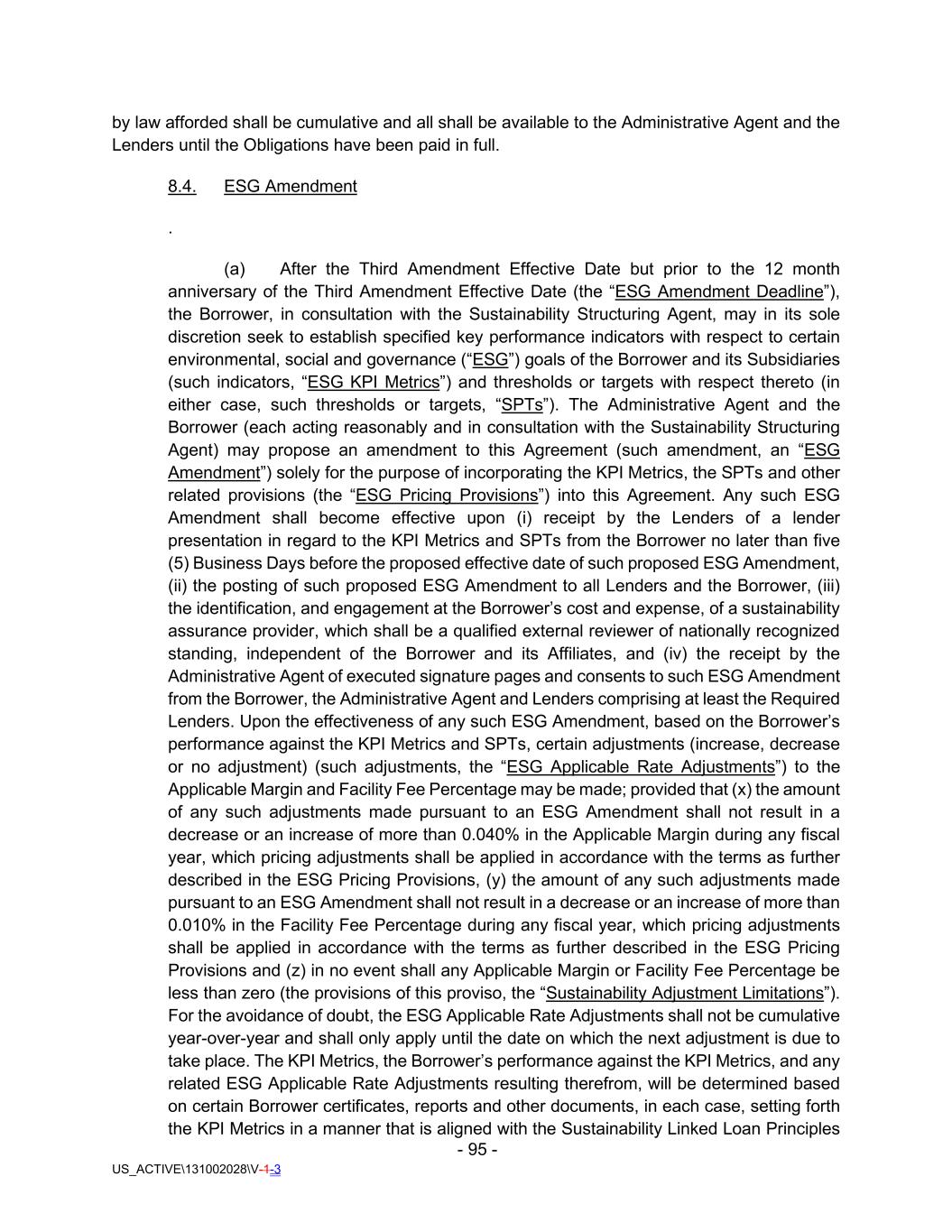 - 95 - US_ACTIVE\131002028\V-1-3 by law afforded shall be cumulative and all shall be available to the Administrative Agent and the Lenders until the Obligations have been paid in full. 8.4. ESG Amendment . (a) After the Third Amendment Effective Date but prior to the 12 month anniversary of the Third Amendment Effective Date (the “ESG Amendment Deadline”), the Borrower, in consultation with the Sustainability Structuring Agent, may in its sole discretion seek to establish specified key performance indicators with respect to certain environmental, social and governance (“ESG”) goals of the Borrower and its Subsidiaries (such indicators, “ESG KPI Metrics”) and thresholds or targets with respect thereto (in either case, such thresholds or targets, “SPTs”). The Administrative Agent and the Borrower (each acting reasonably and in consultation with the Sustainability Structuring Agent) may propose an amendment to this Agreement (such amendment, an “ESG Amendment”) solely for the purpose of incorporating the KPI Metrics, the SPTs and other related provisions (the “ESG Pricing Provisions”) into this Agreement. Any such ESG Amendment shall become effective upon (i) receipt by the Lenders of a lender presentation in regard to the KPI Metrics and SPTs from the Borrower no later than five (5) Business Days before the proposed effective date of such proposed ESG Amendment, (ii) the posting of such proposed ESG Amendment to all Lenders and the Borrower, (iii) the identification, and engagement at the Borrower’s cost and expense, of a sustainability assurance provider, which shall be a qualified external reviewer of nationally recognized standing, independent of the Borrower and its Affiliates, and (iv) the receipt by the Administrative Agent of executed signature pages and consents to such ESG Amendment from the Borrower, the Administrative Agent and Lenders comprising at least the Required Lenders. Upon the effectiveness of any such ESG Amendment, based on the Borrower’s performance against the KPI Metrics and SPTs, certain adjustments (increase, decrease or no adjustment) (such adjustments, the “ESG Applicable Rate Adjustments”) to the Applicable Margin and Facility Fee Percentage may be made; provided that (x) the amount of any such adjustments made pursuant to an ESG Amendment shall not result in a decrease or an increase of more than 0.040% in the Applicable Margin during any fiscal year, which pricing adjustments shall be applied in accordance with the terms as further described in the ESG Pricing Provisions, (y) the amount of any such adjustments made pursuant to an ESG Amendment shall not result in a decrease or an increase of more than 0.010% in the Facility Fee Percentage during any fiscal year, which pricing adjustments shall be applied in accordance with the terms as further described in the ESG Pricing Provisions and (z) in no event shall any Applicable Margin or Facility Fee Percentage be less than zero (the provisions of this proviso, the “Sustainability Adjustment Limitations”). For the avoidance of doubt, the ESG Applicable Rate Adjustments shall not be cumulative year-over-year and shall only apply until the date on which the next adjustment is due to take place. The KPI Metrics, the Borrower’s performance against the KPI Metrics, and any related ESG Applicable Rate Adjustments resulting therefrom, will be determined based on certain Borrower certificates, reports and other documents, in each case, setting forth the KPI Metrics in a manner that is aligned with the Sustainability Linked Loan Principles