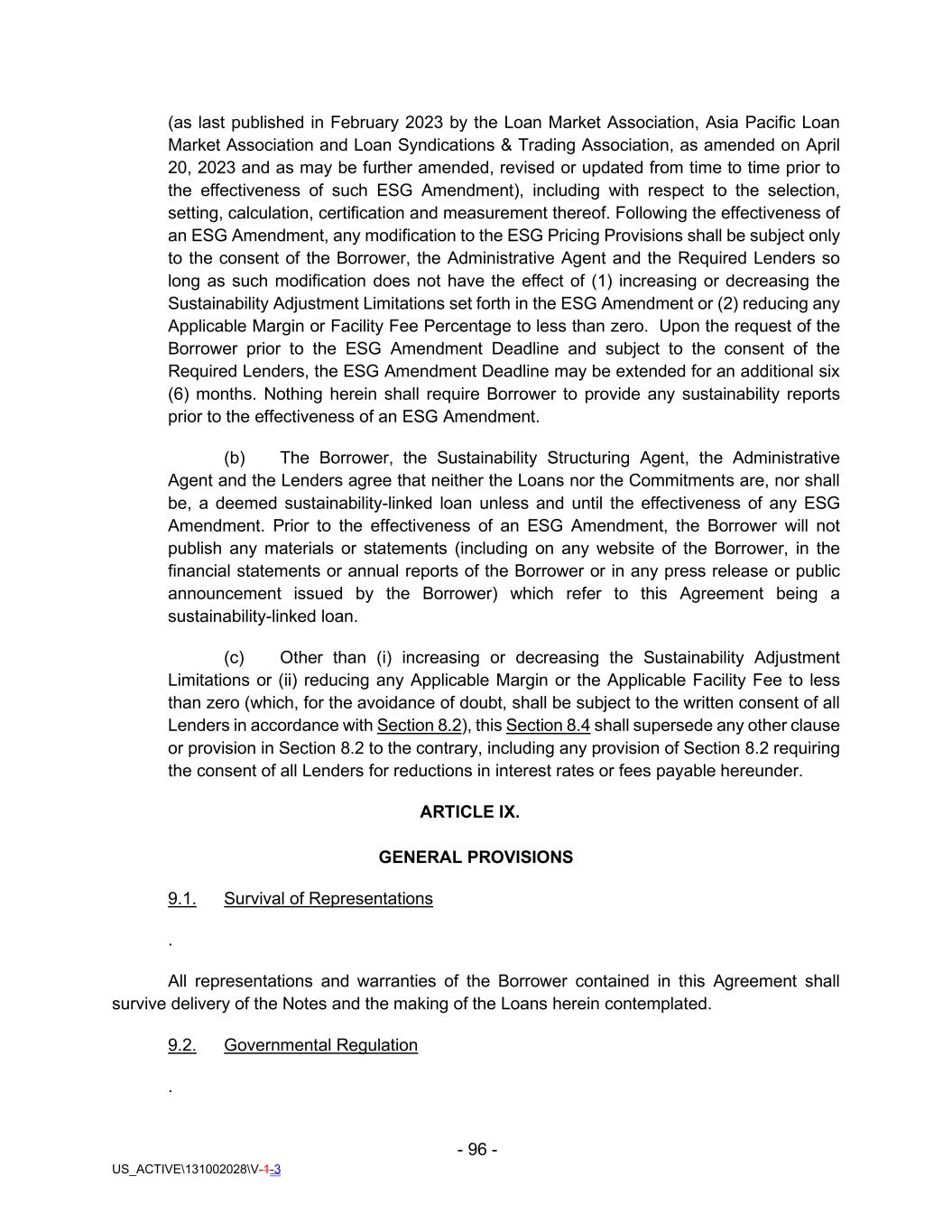 - 96 - US_ACTIVE\131002028\V-1-3 (as last published in February 2023 by the Loan Market Association, Asia Pacific Loan Market Association and Loan Syndications & Trading Association, as amended on April 20, 2023 and as may be further amended, revised or updated from time to time prior to the effectiveness of such ESG Amendment), including with respect to the selection, setting, calculation, certification and measurement thereof. Following the effectiveness of an ESG Amendment, any modification to the ESG Pricing Provisions shall be subject only to the consent of the Borrower, the Administrative Agent and the Required Lenders so long as such modification does not have the effect of (1) increasing or decreasing the Sustainability Adjustment Limitations set forth in the ESG Amendment or (2) reducing any Applicable Margin or Facility Fee Percentage to less than zero. Upon the request of the Borrower prior to the ESG Amendment Deadline and subject to the consent of the Required Lenders, the ESG Amendment Deadline may be extended for an additional six (6) months. Nothing herein shall require Borrower to provide any sustainability reports prior to the effectiveness of an ESG Amendment. (b) The Borrower, the Sustainability Structuring Agent, the Administrative Agent and the Lenders agree that neither the Loans nor the Commitments are, nor shall be, a deemed sustainability-linked loan unless and until the effectiveness of any ESG Amendment. Prior to the effectiveness of an ESG Amendment, the Borrower will not publish any materials or statements (including on any website of the Borrower, in the financial statements or annual reports of the Borrower or in any press release or public announcement issued by the Borrower) which refer to this Agreement being a sustainability-linked loan. (c) Other than (i) increasing or decreasing the Sustainability Adjustment Limitations or (ii) reducing any Applicable Margin or the Applicable Facility Fee to less than zero (which, for the avoidance of doubt, shall be subject to the written consent of all Lenders in accordance with Section 8.2), this Section 8.4 shall supersede any other clause or provision in Section 8.2 to the contrary, including any provision of Section 8.2 requiring the consent of all Lenders for reductions in interest rates or fees payable hereunder. ARTICLE IX. GENERAL PROVISIONS 9.1. Survival of Representations . All representations and warranties of the Borrower contained in this Agreement shall survive delivery of the Notes and the making of the Loans herein contemplated. 9.2. Governmental Regulation .
