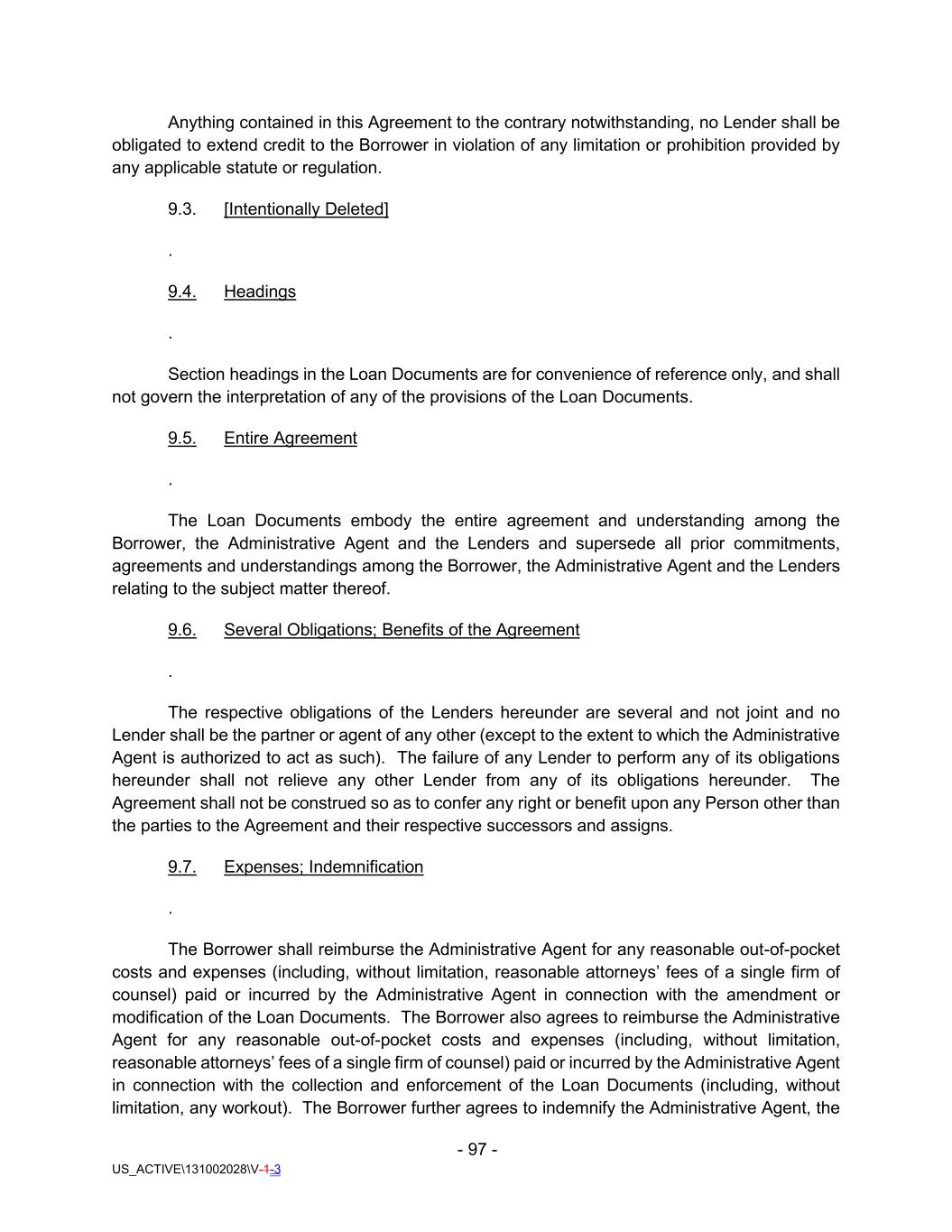 - 97 - US_ACTIVE\131002028\V-1-3 Anything contained in this Agreement to the contrary notwithstanding, no Lender shall be obligated to extend credit to the Borrower in violation of any limitation or prohibition provided by any applicable statute or regulation. 9.3. [Intentionally Deleted] . 9.4. Headings . Section headings in the Loan Documents are for convenience of reference only, and shall not govern the interpretation of any of the provisions of the Loan Documents. 9.5. Entire Agreement . The Loan Documents embody the entire agreement and understanding among the Borrower, the Administrative Agent and the Lenders and supersede all prior commitments, agreements and understandings among the Borrower, the Administrative Agent and the Lenders relating to the subject matter thereof. 9.6. Several Obligations; Benefits of the Agreement . The respective obligations of the Lenders hereunder are several and not joint and no Lender shall be the partner or agent of any other (except to the extent to which the Administrative Agent is authorized to act as such). The failure of any Lender to perform any of its obligations hereunder shall not relieve any other Lender from any of its obligations hereunder. The Agreement shall not be construed so as to confer any right or benefit upon any Person other than the parties to the Agreement and their respective successors and assigns. 9.7. Expenses; Indemnification . The Borrower shall reimburse the Administrative Agent for any reasonable out-of-pocket costs and expenses (including, without limitation, reasonable attorneys’ fees of a single firm of counsel) paid or incurred by the Administrative Agent in connection with the amendment or modification of the Loan Documents. The Borrower also agrees to reimburse the Administrative Agent for any reasonable out-of-pocket costs and expenses (including, without limitation, reasonable attorneys’ fees of a single firm of counsel) paid or incurred by the Administrative Agent in connection with the collection and enforcement of the Loan Documents (including, without limitation, any workout). The Borrower further agrees to indemnify the Administrative Agent, the