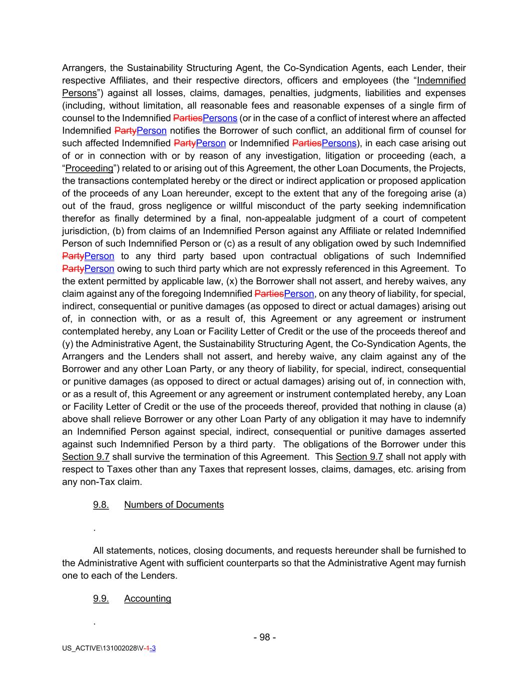 - 98 - US_ACTIVE\131002028\V-1-3 Arrangers, the Sustainability Structuring Agent, the Co-Syndication Agents, each Lender, their respective Affiliates, and their respective directors, officers and employees (the “Indemnified Persons”) against all losses, claims, damages, penalties, judgments, liabilities and expenses (including, without limitation, all reasonable fees and reasonable expenses of a single firm of counsel to the Indemnified PartiesPersons (or in the case of a conflict of interest where an affected Indemnified PartyPerson notifies the Borrower of such conflict, an additional firm of counsel for such affected Indemnified PartyPerson or Indemnified PartiesPersons), in each case arising out of or in connection with or by reason of any investigation, litigation or proceeding (each, a “Proceeding”) related to or arising out of this Agreement, the other Loan Documents, the Projects, the transactions contemplated hereby or the direct or indirect application or proposed application of the proceeds of any Loan hereunder, except to the extent that any of the foregoing arise (a) out of the fraud, gross negligence or willful misconduct of the party seeking indemnification therefor as finally determined by a final, non-appealable judgment of a court of competent jurisdiction, (b) from claims of an Indemnified Person against any Affiliate or related Indemnified Person of such Indemnified Person or (c) as a result of any obligation owed by such Indemnified PartyPerson to any third party based upon contractual obligations of such Indemnified PartyPerson owing to such third party which are not expressly referenced in this Agreement. To the extent permitted by applicable law, (x) the Borrower shall not assert, and hereby waives, any claim against any of the foregoing Indemnified PartiesPerson, on any theory of liability, for special, indirect, consequential or punitive damages (as opposed to direct or actual damages) arising out of, in connection with, or as a result of, this Agreement or any agreement or instrument contemplated hereby, any Loan or Facility Letter of Credit or the use of the proceeds thereof and (y) the Administrative Agent, the Sustainability Structuring Agent, the Co-Syndication Agents, the Arrangers and the Lenders shall not assert, and hereby waive, any claim against any of the Borrower and any other Loan Party, or any theory of liability, for special, indirect, consequential or punitive damages (as opposed to direct or actual damages) arising out of, in connection with, or as a result of, this Agreement or any agreement or instrument contemplated hereby, any Loan or Facility Letter of Credit or the use of the proceeds thereof, provided that nothing in clause (a) above shall relieve Borrower or any other Loan Party of any obligation it may have to indemnify an Indemnified Person against special, indirect, consequential or punitive damages asserted against such Indemnified Person by a third party. The obligations of the Borrower under this Section 9.7 shall survive the termination of this Agreement. This Section 9.7 shall not apply with respect to Taxes other than any Taxes that represent losses, claims, damages, etc. arising from any non-Tax claim. 9.8. Numbers of Documents . All statements, notices, closing documents, and requests hereunder shall be furnished to the Administrative Agent with sufficient counterparts so that the Administrative Agent may furnish one to each of the Lenders. 9.9. Accounting .