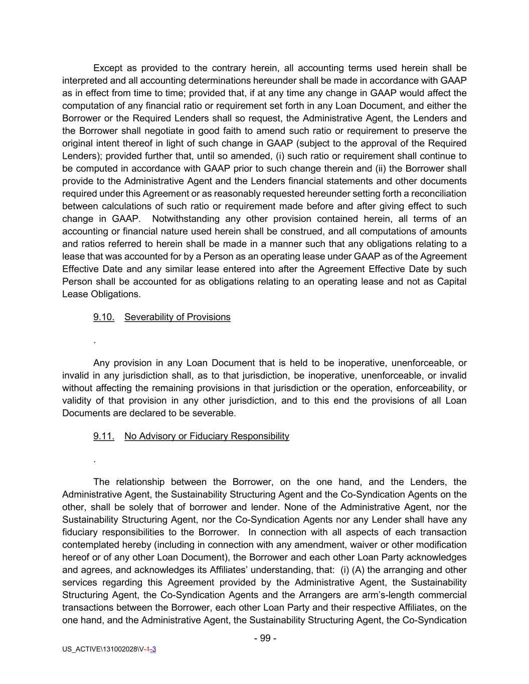 - 99 - US_ACTIVE\131002028\V-1-3 Except as provided to the contrary herein, all accounting terms used herein shall be interpreted and all accounting determinations hereunder shall be made in accordance with GAAP as in effect from time to time; provided that, if at any time any change in GAAP would affect the computation of any financial ratio or requirement set forth in any Loan Document, and either the Borrower or the Required Lenders shall so request, the Administrative Agent, the Lenders and the Borrower shall negotiate in good faith to amend such ratio or requirement to preserve the original intent thereof in light of such change in GAAP (subject to the approval of the Required Lenders); provided further that, until so amended, (i) such ratio or requirement shall continue to be computed in accordance with GAAP prior to such change therein and (ii) the Borrower shall provide to the Administrative Agent and the Lenders financial statements and other documents required under this Agreement or as reasonably requested hereunder setting forth a reconciliation between calculations of such ratio or requirement made before and after giving effect to such change in GAAP. Notwithstanding any other provision contained herein, all terms of an accounting or financial nature used herein shall be construed, and all computations of amounts and ratios referred to herein shall be made in a manner such that any obligations relating to a lease that was accounted for by a Person as an operating lease under GAAP as of the Agreement Effective Date and any similar lease entered into after the Agreement Effective Date by such Person shall be accounted for as obligations relating to an operating lease and not as Capital Lease Obligations. 9.10. Severability of Provisions . Any provision in any Loan Document that is held to be inoperative, unenforceable, or invalid in any jurisdiction shall, as to that jurisdiction, be inoperative, unenforceable, or invalid without affecting the remaining provisions in that jurisdiction or the operation, enforceability, or validity of that provision in any other jurisdiction, and to this end the provisions of all Loan Documents are declared to be severable. 9.11. No Advisory or Fiduciary Responsibility . The relationship between the Borrower, on the one hand, and the Lenders, the Administrative Agent, the Sustainability Structuring Agent and the Co-Syndication Agents on the other, shall be solely that of borrower and lender. None of the Administrative Agent, nor the Sustainability Structuring Agent, nor the Co-Syndication Agents nor any Lender shall have any fiduciary responsibilities to the Borrower. In connection with all aspects of each transaction contemplated hereby (including in connection with any amendment, waiver or other modification hereof or of any other Loan Document), the Borrower and each other Loan Party acknowledges and agrees, and acknowledges its Affiliates’ understanding, that: (i) (A) the arranging and other services regarding this Agreement provided by the Administrative Agent, the Sustainability Structuring Agent, the Co-Syndication Agents and the Arrangers are arm’s-length commercial transactions between the Borrower, each other Loan Party and their respective Affiliates, on the one hand, and the Administrative Agent, the Sustainability Structuring Agent, the Co-Syndication