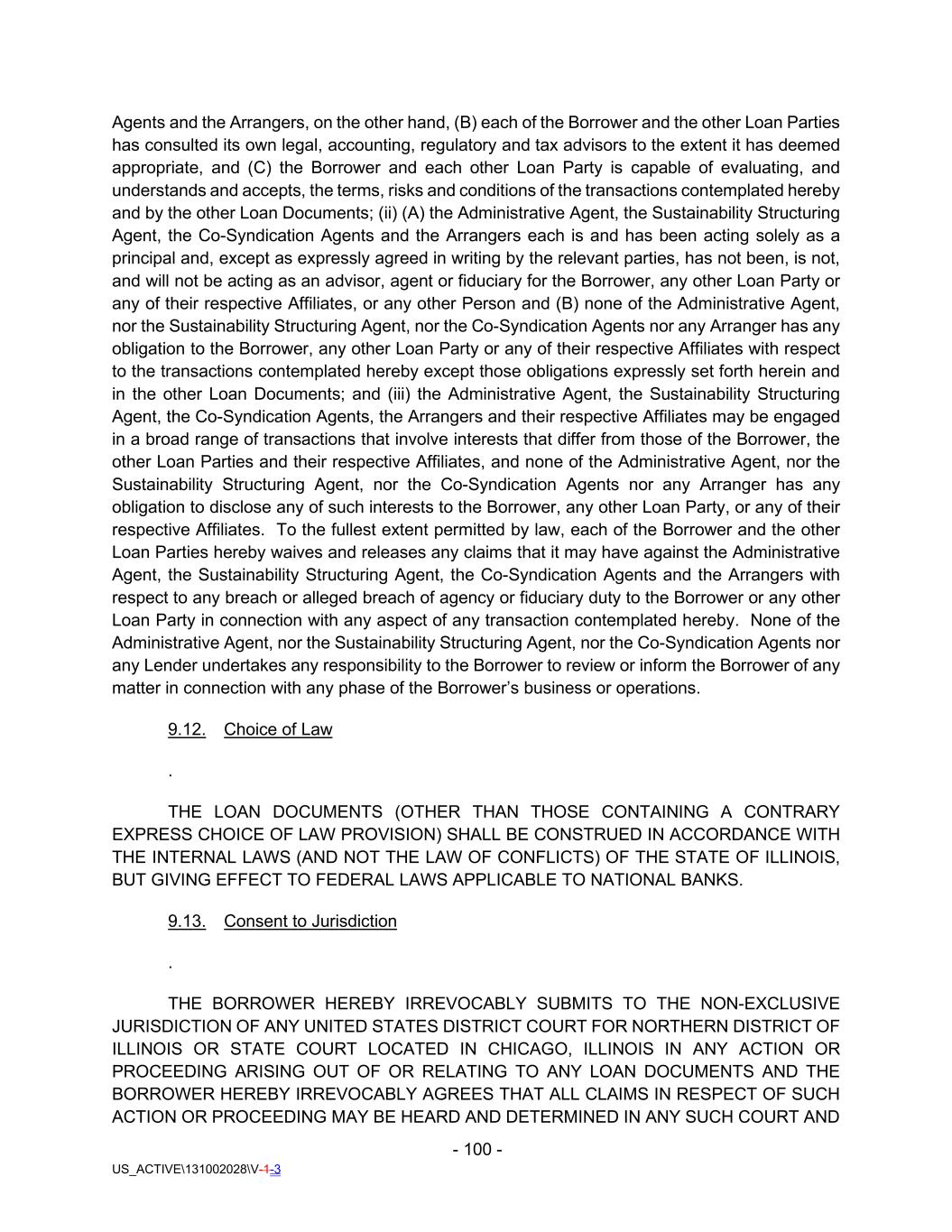 - 100 - US_ACTIVE\131002028\V-1-3 Agents and the Arrangers, on the other hand, (B) each of the Borrower and the other Loan Parties has consulted its own legal, accounting, regulatory and tax advisors to the extent it has deemed appropriate, and (C) the Borrower and each other Loan Party is capable of evaluating, and understands and accepts, the terms, risks and conditions of the transactions contemplated hereby and by the other Loan Documents; (ii) (A) the Administrative Agent, the Sustainability Structuring Agent, the Co-Syndication Agents and the Arrangers each is and has been acting solely as a principal and, except as expressly agreed in writing by the relevant parties, has not been, is not, and will not be acting as an advisor, agent or fiduciary for the Borrower, any other Loan Party or any of their respective Affiliates, or any other Person and (B) none of the Administrative Agent, nor the Sustainability Structuring Agent, nor the Co-Syndication Agents nor any Arranger has any obligation to the Borrower, any other Loan Party or any of their respective Affiliates with respect to the transactions contemplated hereby except those obligations expressly set forth herein and in the other Loan Documents; and (iii) the Administrative Agent, the Sustainability Structuring Agent, the Co-Syndication Agents, the Arrangers and their respective Affiliates may be engaged in a broad range of transactions that involve interests that differ from those of the Borrower, the other Loan Parties and their respective Affiliates, and none of the Administrative Agent, nor the Sustainability Structuring Agent, nor the Co-Syndication Agents nor any Arranger has any obligation to disclose any of such interests to the Borrower, any other Loan Party, or any of their respective Affiliates. To the fullest extent permitted by law, each of the Borrower and the other Loan Parties hereby waives and releases any claims that it may have against the Administrative Agent, the Sustainability Structuring Agent, the Co-Syndication Agents and the Arrangers with respect to any breach or alleged breach of agency or fiduciary duty to the Borrower or any other Loan Party in connection with any aspect of any transaction contemplated hereby. None of the Administrative Agent, nor the Sustainability Structuring Agent, nor the Co-Syndication Agents nor any Lender undertakes any responsibility to the Borrower to review or inform the Borrower of any matter in connection with any phase of the Borrower’s business or operations. 9.12. Choice of Law . THE LOAN DOCUMENTS (OTHER THAN THOSE CONTAINING A CONTRARY EXPRESS CHOICE OF LAW PROVISION) SHALL BE CONSTRUED IN ACCORDANCE WITH THE INTERNAL LAWS (AND NOT THE LAW OF CONFLICTS) OF THE STATE OF ILLINOIS, BUT GIVING EFFECT TO FEDERAL LAWS APPLICABLE TO NATIONAL BANKS. 9.13. Consent to Jurisdiction . THE BORROWER HEREBY IRREVOCABLY SUBMITS TO THE NON-EXCLUSIVE JURISDICTION OF ANY UNITED STATES DISTRICT COURT FOR NORTHERN DISTRICT OF ILLINOIS OR STATE COURT LOCATED IN CHICAGO, ILLINOIS IN ANY ACTION OR PROCEEDING ARISING OUT OF OR RELATING TO ANY LOAN DOCUMENTS AND THE BORROWER HEREBY IRREVOCABLY AGREES THAT ALL CLAIMS IN RESPECT OF SUCH ACTION OR PROCEEDING MAY BE HEARD AND DETERMINED IN ANY SUCH COURT AND