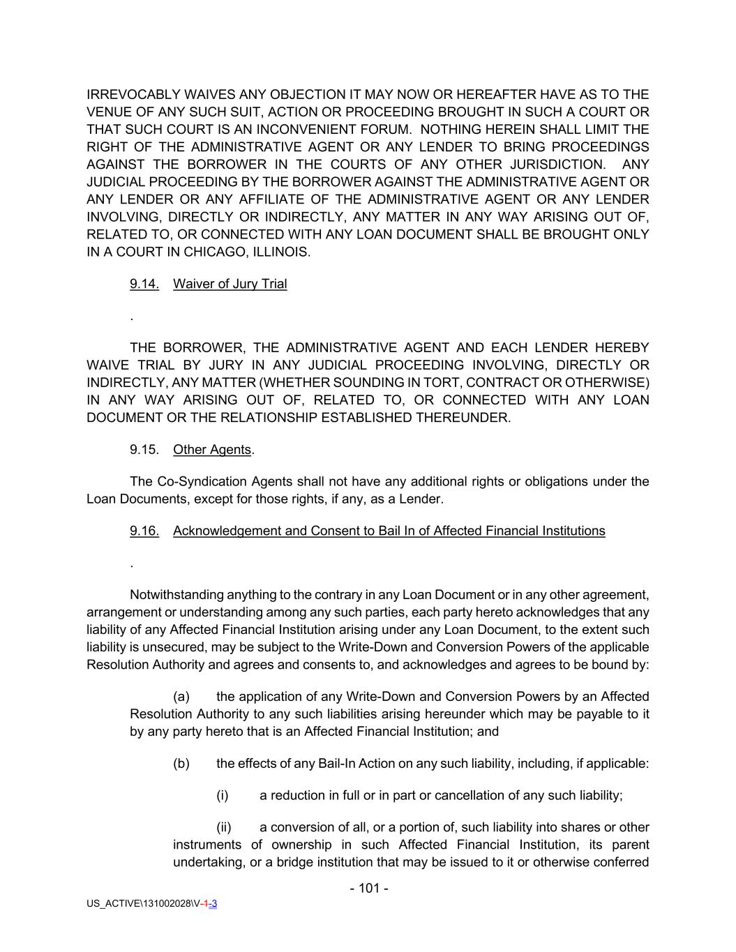 - 101 - US_ACTIVE\131002028\V-1-3 IRREVOCABLY WAIVES ANY OBJECTION IT MAY NOW OR HEREAFTER HAVE AS TO THE VENUE OF ANY SUCH SUIT, ACTION OR PROCEEDING BROUGHT IN SUCH A COURT OR THAT SUCH COURT IS AN INCONVENIENT FORUM. NOTHING HEREIN SHALL LIMIT THE RIGHT OF THE ADMINISTRATIVE AGENT OR ANY LENDER TO BRING PROCEEDINGS AGAINST THE BORROWER IN THE COURTS OF ANY OTHER JURISDICTION. ANY JUDICIAL PROCEEDING BY THE BORROWER AGAINST THE ADMINISTRATIVE AGENT OR ANY LENDER OR ANY AFFILIATE OF THE ADMINISTRATIVE AGENT OR ANY LENDER INVOLVING, DIRECTLY OR INDIRECTLY, ANY MATTER IN ANY WAY ARISING OUT OF, RELATED TO, OR CONNECTED WITH ANY LOAN DOCUMENT SHALL BE BROUGHT ONLY IN A COURT IN CHICAGO, ILLINOIS. 9.14. Waiver of Jury Trial . THE BORROWER, THE ADMINISTRATIVE AGENT AND EACH LENDER HEREBY WAIVE TRIAL BY JURY IN ANY JUDICIAL PROCEEDING INVOLVING, DIRECTLY OR INDIRECTLY, ANY MATTER (WHETHER SOUNDING IN TORT, CONTRACT OR OTHERWISE) IN ANY WAY ARISING OUT OF, RELATED TO, OR CONNECTED WITH ANY LOAN DOCUMENT OR THE RELATIONSHIP ESTABLISHED THEREUNDER. 9.15. Other Agents. The Co-Syndication Agents shall not have any additional rights or obligations under the Loan Documents, except for those rights, if any, as a Lender. 9.16. Acknowledgement and Consent to Bail In of Affected Financial Institutions . Notwithstanding anything to the contrary in any Loan Document or in any other agreement, arrangement or understanding among any such parties, each party hereto acknowledges that any liability of any Affected Financial Institution arising under any Loan Document, to the extent such liability is unsecured, may be subject to the Write-Down and Conversion Powers of the applicable Resolution Authority and agrees and consents to, and acknowledges and agrees to be bound by: (a) the application of any Write-Down and Conversion Powers by an Affected Resolution Authority to any such liabilities arising hereunder which may be payable to it by any party hereto that is an Affected Financial Institution; and (b) the effects of any Bail-In Action on any such liability, including, if applicable: (i) a reduction in full or in part or cancellation of any such liability; (ii) a conversion of all, or a portion of, such liability into shares or other instruments of ownership in such Affected Financial Institution, its parent undertaking, or a bridge institution that may be issued to it or otherwise conferred