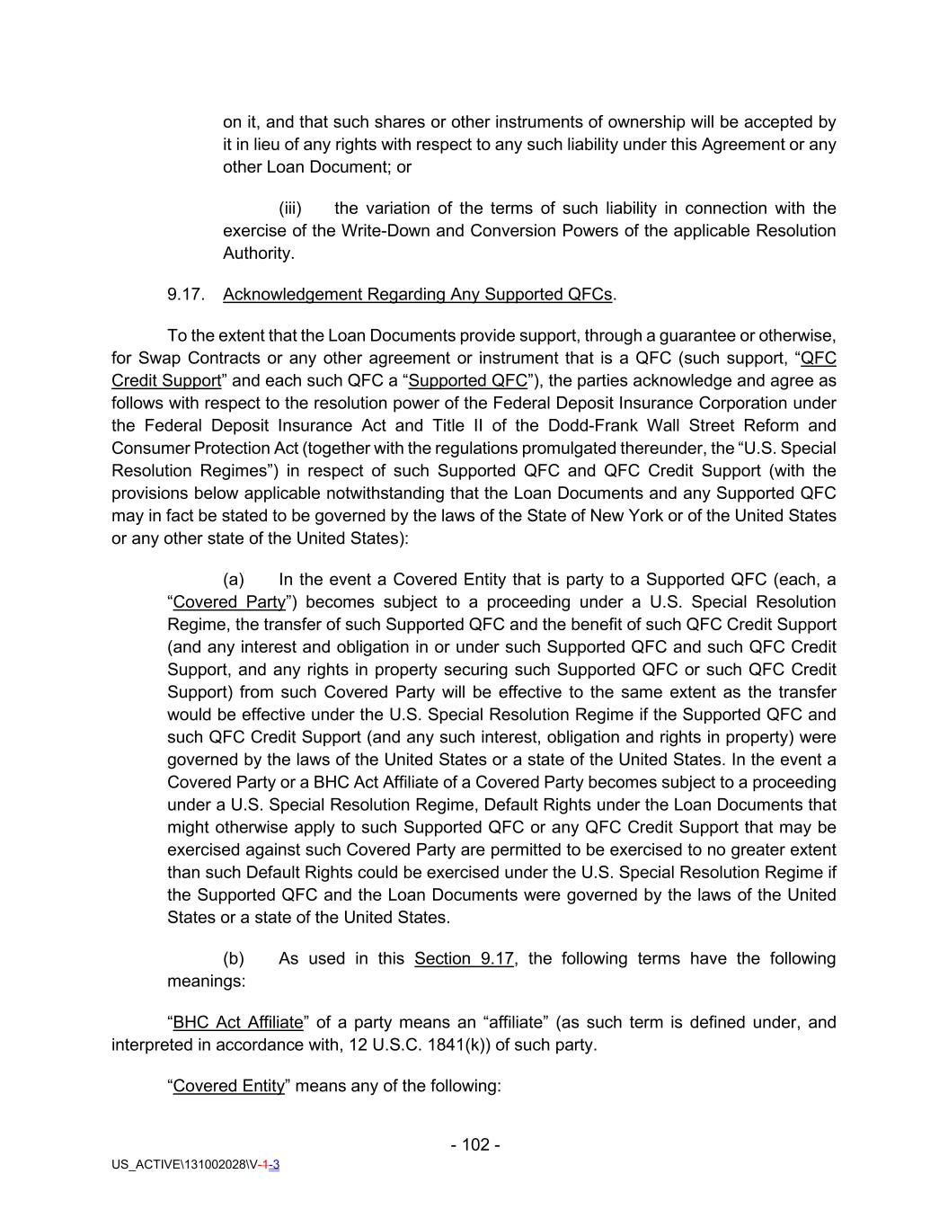 - 102 - US_ACTIVE\131002028\V-1-3 on it, and that such shares or other instruments of ownership will be accepted by it in lieu of any rights with respect to any such liability under this Agreement or any other Loan Document; or (iii) the variation of the terms of such liability in connection with the exercise of the Write-Down and Conversion Powers of the applicable Resolution Authority. 9.17. Acknowledgement Regarding Any Supported QFCs. To the extent that the Loan Documents provide support, through a guarantee or otherwise, for Swap Contracts or any other agreement or instrument that is a QFC (such support, “QFC Credit Support” and each such QFC a “Supported QFC”), the parties acknowledge and agree as follows with respect to the resolution power of the Federal Deposit Insurance Corporation under the Federal Deposit Insurance Act and Title II of the Dodd-Frank Wall Street Reform and Consumer Protection Act (together with the regulations promulgated thereunder, the “U.S. Special Resolution Regimes”) in respect of such Supported QFC and QFC Credit Support (with the provisions below applicable notwithstanding that the Loan Documents and any Supported QFC may in fact be stated to be governed by the laws of the State of New York or of the United States or any other state of the United States): (a) In the event a Covered Entity that is party to a Supported QFC (each, a “Covered Party”) becomes subject to a proceeding under a U.S. Special Resolution Regime, the transfer of such Supported QFC and the benefit of such QFC Credit Support (and any interest and obligation in or under such Supported QFC and such QFC Credit Support, and any rights in property securing such Supported QFC or such QFC Credit Support) from such Covered Party will be effective to the same extent as the transfer would be effective under the U.S. Special Resolution Regime if the Supported QFC and such QFC Credit Support (and any such interest, obligation and rights in property) were governed by the laws of the United States or a state of the United States. In the event a Covered Party or a BHC Act Affiliate of a Covered Party becomes subject to a proceeding under a U.S. Special Resolution Regime, Default Rights under the Loan Documents that might otherwise apply to such Supported QFC or any QFC Credit Support that may be exercised against such Covered Party are permitted to be exercised to no greater extent than such Default Rights could be exercised under the U.S. Special Resolution Regime if the Supported QFC and the Loan Documents were governed by the laws of the United States or a state of the United States. (b) As used in this Section 9.17, the following terms have the following meanings: “BHC Act Affiliate” of a party means an “affiliate” (as such term is defined under, and interpreted in accordance with, 12 U.S.C. 1841(k)) of such party. “Covered Entity” means any of the following: