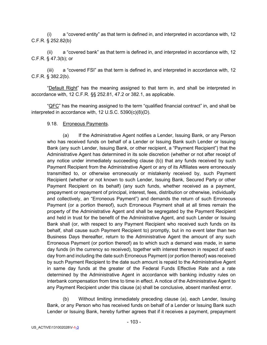 - 103 - US_ACTIVE\131002028\V-1-3 (i) a “covered entity” as that term is defined in, and interpreted in accordance with, 12 C.F.R. § 252.82(b) (ii) a “covered bank” as that term is defined in, and interpreted in accordance with, 12 C.F.R. § 47.3(b); or (iii) a “covered FSI” as that term is defined in, and interpreted in accordance with, 12 C.F.R. § 382.2(b). “Default Right” has the meaning assigned to that term in, and shall be interpreted in accordance with, 12 C.F.R. §§ 252.81, 47.2 or 382.1, as applicable. “QFC” has the meaning assigned to the term “qualified financial contract” in, and shall be interpreted in accordance with, 12 U.S.C. 5390(c)(8)(D). 9.18. Erroneous Payments. (a) If the Administrative Agent notifies a Lender, Issuing Bank, or any Person who has received funds on behalf of a Lender or Issuing Bank such Lender or Issuing Bank (any such Lender, Issuing Bank, or other recipient, a “Payment Recipient”) that the Administrative Agent has determined in its sole discretion (whether or not after receipt of any notice under immediately succeeding clause (b)) that any funds received by such Payment Recipient from the Administrative Agent or any of its Affiliates were erroneously transmitted to, or otherwise erroneously or mistakenly received by, such Payment Recipient (whether or not known to such Lender, Issuing Bank, Secured Party or other Payment Recipient on its behalf) (any such funds, whether received as a payment, prepayment or repayment of principal, interest, fees, distribution or otherwise, individually and collectively, an “Erroneous Payment”) and demands the return of such Erroneous Payment (or a portion thereof), such Erroneous Payment shall at all times remain the property of the Administrative Agent and shall be segregated by the Payment Recipient and held in trust for the benefit of the Administrative Agent, and such Lender or Issuing Bank shall (or, with respect to any Payment Recipient who received such funds on its behalf, shall cause such Payment Recipient to) promptly, but in no event later than two Business Days thereafter, return to the Administrative Agent the amount of any such Erroneous Payment (or portion thereof) as to which such a demand was made, in same day funds (in the currency so received), together with interest thereon in respect of each day from and including the date such Erroneous Payment (or portion thereof) was received by such Payment Recipient to the date such amount is repaid to the Administrative Agent in same day funds at the greater of the Federal Funds Effective Rate and a rate determined by the Administrative Agent in accordance with banking industry rules on interbank compensation from time to time in effect. A notice of the Administrative Agent to any Payment Recipient under this clause (a) shall be conclusive, absent manifest error. (b) Without limiting immediately preceding clause (a), each Lender, Issuing Bank, or any Person who has received funds on behalf of a Lender or Issuing Bank such Lender or Issuing Bank, hereby further agrees that if it receives a payment, prepayment