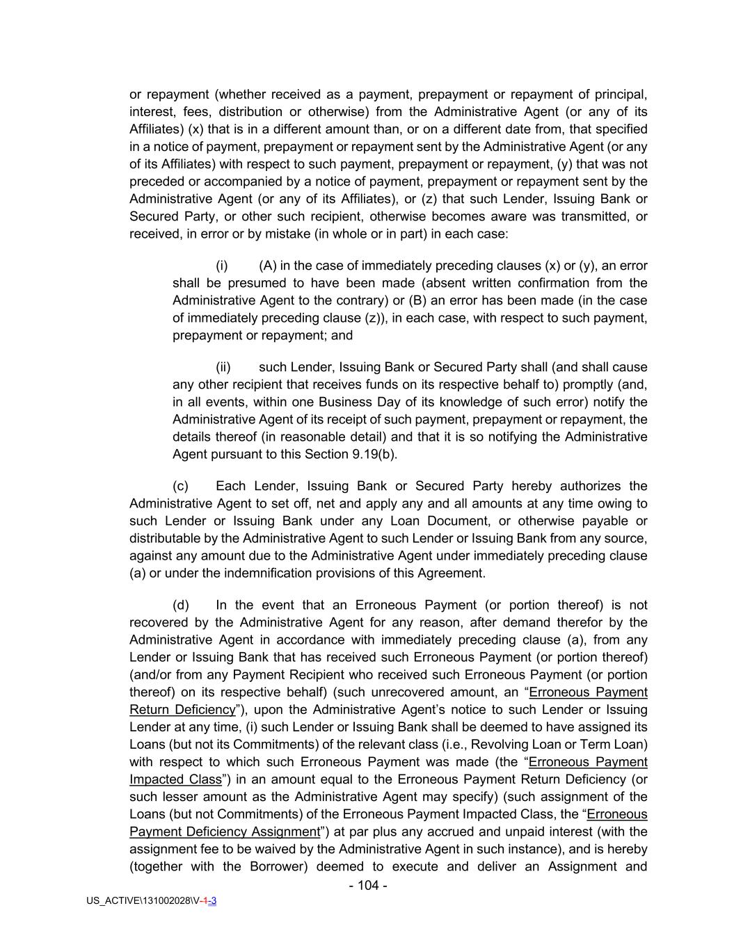 - 104 - US_ACTIVE\131002028\V-1-3 or repayment (whether received as a payment, prepayment or repayment of principal, interest, fees, distribution or otherwise) from the Administrative Agent (or any of its Affiliates) (x) that is in a different amount than, or on a different date from, that specified in a notice of payment, prepayment or repayment sent by the Administrative Agent (or any of its Affiliates) with respect to such payment, prepayment or repayment, (y) that was not preceded or accompanied by a notice of payment, prepayment or repayment sent by the Administrative Agent (or any of its Affiliates), or (z) that such Lender, Issuing Bank or Secured Party, or other such recipient, otherwise becomes aware was transmitted, or received, in error or by mistake (in whole or in part) in each case: (i) (A) in the case of immediately preceding clauses (x) or (y), an error shall be presumed to have been made (absent written confirmation from the Administrative Agent to the contrary) or (B) an error has been made (in the case of immediately preceding clause (z)), in each case, with respect to such payment, prepayment or repayment; and (ii) such Lender, Issuing Bank or Secured Party shall (and shall cause any other recipient that receives funds on its respective behalf to) promptly (and, in all events, within one Business Day of its knowledge of such error) notify the Administrative Agent of its receipt of such payment, prepayment or repayment, the details thereof (in reasonable detail) and that it is so notifying the Administrative Agent pursuant to this Section 9.19(b). (c) Each Lender, Issuing Bank or Secured Party hereby authorizes the Administrative Agent to set off, net and apply any and all amounts at any time owing to such Lender or Issuing Bank under any Loan Document, or otherwise payable or distributable by the Administrative Agent to such Lender or Issuing Bank from any source, against any amount due to the Administrative Agent under immediately preceding clause (a) or under the indemnification provisions of this Agreement. (d) In the event that an Erroneous Payment (or portion thereof) is not recovered by the Administrative Agent for any reason, after demand therefor by the Administrative Agent in accordance with immediately preceding clause (a), from any Lender or Issuing Bank that has received such Erroneous Payment (or portion thereof) (and/or from any Payment Recipient who received such Erroneous Payment (or portion thereof) on its respective behalf) (such unrecovered amount, an “Erroneous Payment Return Deficiency”), upon the Administrative Agent’s notice to such Lender or Issuing Lender at any time, (i) such Lender or Issuing Bank shall be deemed to have assigned its Loans (but not its Commitments) of the relevant class (i.e., Revolving Loan or Term Loan) with respect to which such Erroneous Payment was made (the “Erroneous Payment Impacted Class”) in an amount equal to the Erroneous Payment Return Deficiency (or such lesser amount as the Administrative Agent may specify) (such assignment of the Loans (but not Commitments) of the Erroneous Payment Impacted Class, the “Erroneous Payment Deficiency Assignment”) at par plus any accrued and unpaid interest (with the assignment fee to be waived by the Administrative Agent in such instance), and is hereby (together with the Borrower) deemed to execute and deliver an Assignment and