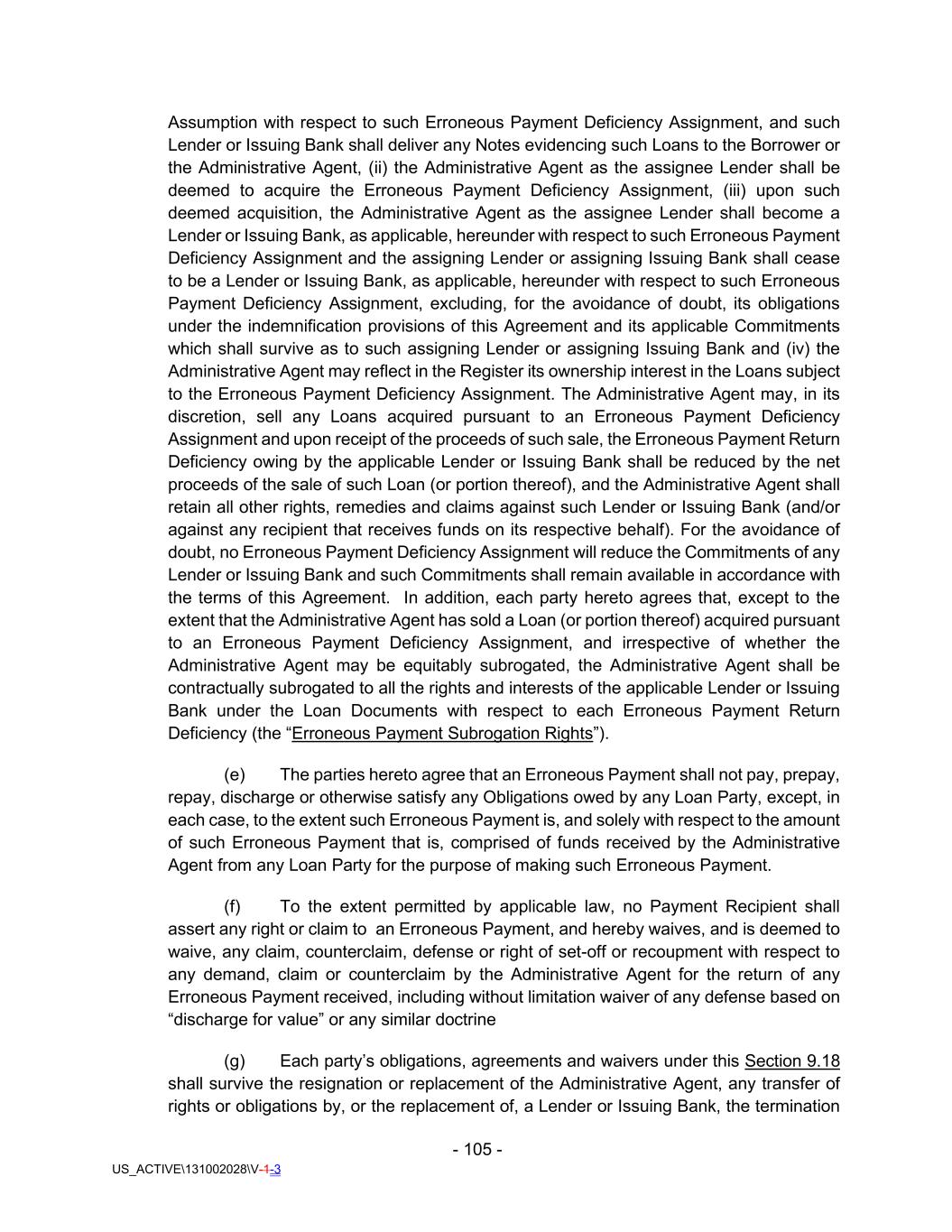 - 105 - US_ACTIVE\131002028\V-1-3 Assumption with respect to such Erroneous Payment Deficiency Assignment, and such Lender or Issuing Bank shall deliver any Notes evidencing such Loans to the Borrower or the Administrative Agent, (ii) the Administrative Agent as the assignee Lender shall be deemed to acquire the Erroneous Payment Deficiency Assignment, (iii) upon such deemed acquisition, the Administrative Agent as the assignee Lender shall become a Lender or Issuing Bank, as applicable, hereunder with respect to such Erroneous Payment Deficiency Assignment and the assigning Lender or assigning Issuing Bank shall cease to be a Lender or Issuing Bank, as applicable, hereunder with respect to such Erroneous Payment Deficiency Assignment, excluding, for the avoidance of doubt, its obligations under the indemnification provisions of this Agreement and its applicable Commitments which shall survive as to such assigning Lender or assigning Issuing Bank and (iv) the Administrative Agent may reflect in the Register its ownership interest in the Loans subject to the Erroneous Payment Deficiency Assignment. The Administrative Agent may, in its discretion, sell any Loans acquired pursuant to an Erroneous Payment Deficiency Assignment and upon receipt of the proceeds of such sale, the Erroneous Payment Return Deficiency owing by the applicable Lender or Issuing Bank shall be reduced by the net proceeds of the sale of such Loan (or portion thereof), and the Administrative Agent shall retain all other rights, remedies and claims against such Lender or Issuing Bank (and/or against any recipient that receives funds on its respective behalf). For the avoidance of doubt, no Erroneous Payment Deficiency Assignment will reduce the Commitments of any Lender or Issuing Bank and such Commitments shall remain available in accordance with the terms of this Agreement. In addition, each party hereto agrees that, except to the extent that the Administrative Agent has sold a Loan (or portion thereof) acquired pursuant to an Erroneous Payment Deficiency Assignment, and irrespective of whether the Administrative Agent may be equitably subrogated, the Administrative Agent shall be contractually subrogated to all the rights and interests of the applicable Lender or Issuing Bank under the Loan Documents with respect to each Erroneous Payment Return Deficiency (the “Erroneous Payment Subrogation Rights”). (e) The parties hereto agree that an Erroneous Payment shall not pay, prepay, repay, discharge or otherwise satisfy any Obligations owed by any Loan Party, except, in each case, to the extent such Erroneous Payment is, and solely with respect to the amount of such Erroneous Payment that is, comprised of funds received by the Administrative Agent from any Loan Party for the purpose of making such Erroneous Payment. (f) To the extent permitted by applicable law, no Payment Recipient shall assert any right or claim to an Erroneous Payment, and hereby waives, and is deemed to waive, any claim, counterclaim, defense or right of set-off or recoupment with respect to any demand, claim or counterclaim by the Administrative Agent for the return of any Erroneous Payment received, including without limitation waiver of any defense based on “discharge for value” or any similar doctrine (g) Each party’s obligations, agreements and waivers under this Section 9.18 shall survive the resignation or replacement of the Administrative Agent, any transfer of rights or obligations by, or the replacement of, a Lender or Issuing Bank, the termination