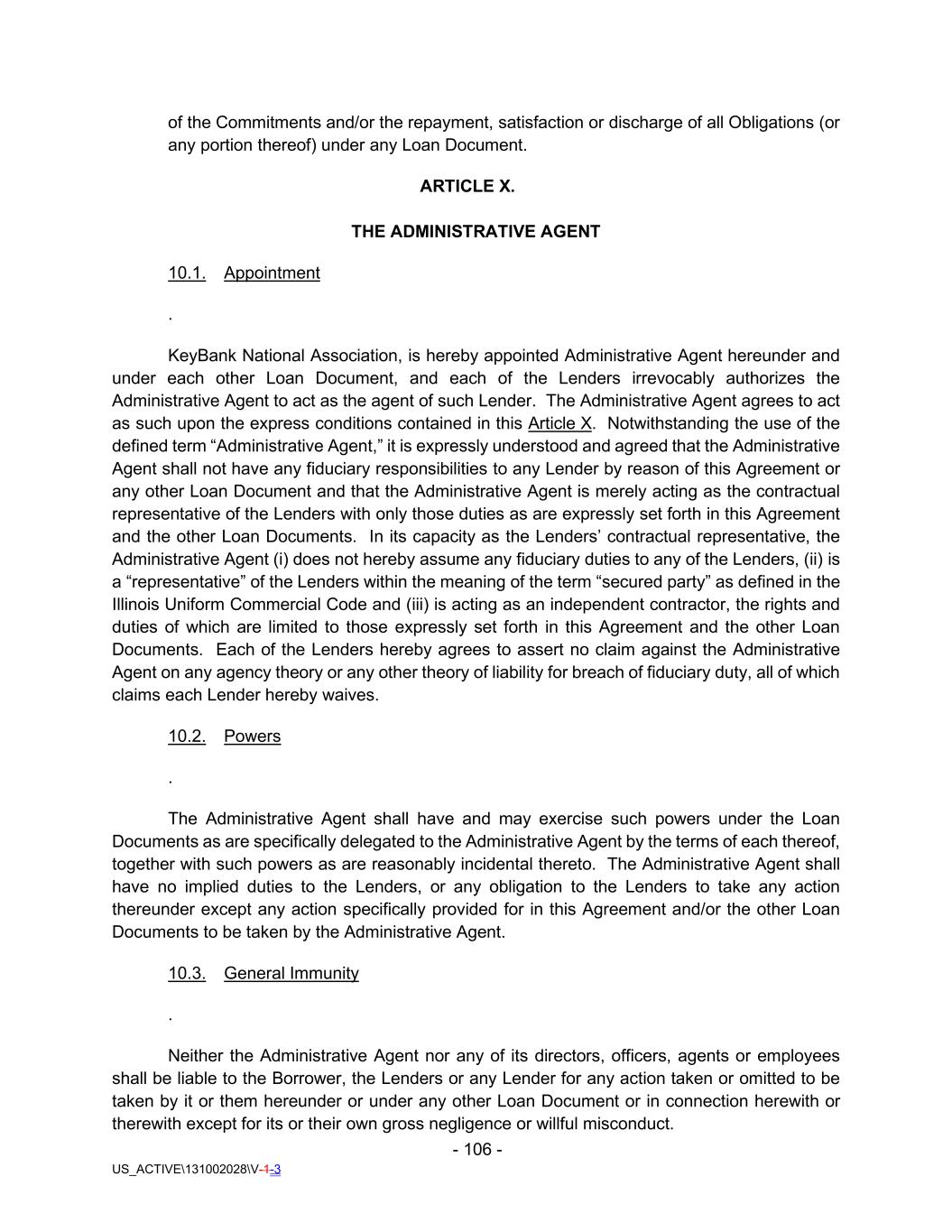 - 106 - US_ACTIVE\131002028\V-1-3 of the Commitments and/or the repayment, satisfaction or discharge of all Obligations (or any portion thereof) under any Loan Document. ARTICLE X. THE ADMINISTRATIVE AGENT 10.1. Appointment . KeyBank National Association, is hereby appointed Administrative Agent hereunder and under each other Loan Document, and each of the Lenders irrevocably authorizes the Administrative Agent to act as the agent of such Lender. The Administrative Agent agrees to act as such upon the express conditions contained in this Article X. Notwithstanding the use of the defined term “Administrative Agent,” it is expressly understood and agreed that the Administrative Agent shall not have any fiduciary responsibilities to any Lender by reason of this Agreement or any other Loan Document and that the Administrative Agent is merely acting as the contractual representative of the Lenders with only those duties as are expressly set forth in this Agreement and the other Loan Documents. In its capacity as the Lenders’ contractual representative, the Administrative Agent (i) does not hereby assume any fiduciary duties to any of the Lenders, (ii) is a “representative” of the Lenders within the meaning of the term “secured party” as defined in the Illinois Uniform Commercial Code and (iii) is acting as an independent contractor, the rights and duties of which are limited to those expressly set forth in this Agreement and the other Loan Documents. Each of the Lenders hereby agrees to assert no claim against the Administrative Agent on any agency theory or any other theory of liability for breach of fiduciary duty, all of which claims each Lender hereby waives. 10.2. Powers . The Administrative Agent shall have and may exercise such powers under the Loan Documents as are specifically delegated to the Administrative Agent by the terms of each thereof, together with such powers as are reasonably incidental thereto. The Administrative Agent shall have no implied duties to the Lenders, or any obligation to the Lenders to take any action thereunder except any action specifically provided for in this Agreement and/or the other Loan Documents to be taken by the Administrative Agent. 10.3. General Immunity . Neither the Administrative Agent nor any of its directors, officers, agents or employees shall be liable to the Borrower, the Lenders or any Lender for any action taken or omitted to be taken by it or them hereunder or under any other Loan Document or in connection herewith or therewith except for its or their own gross negligence or willful misconduct.