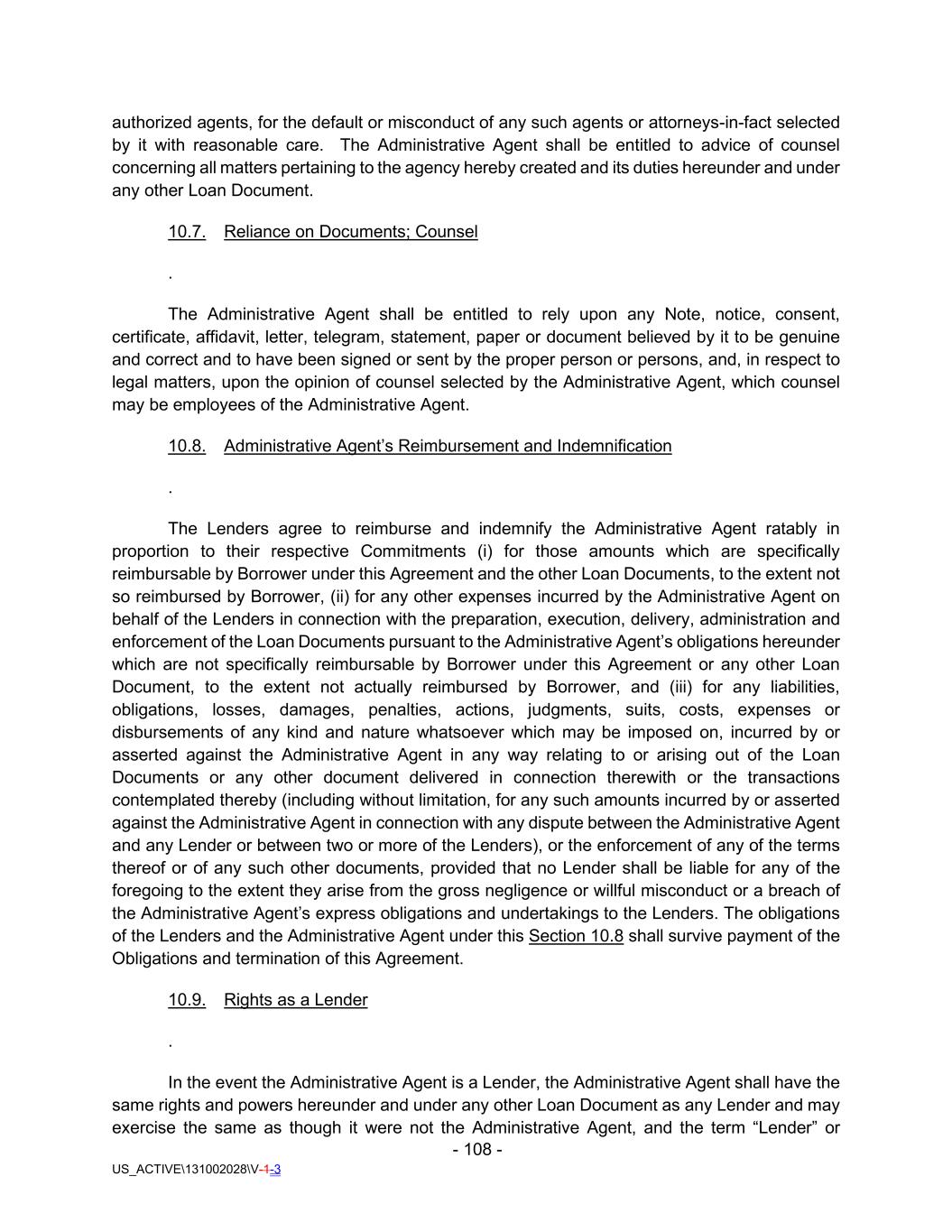 - 108 - US_ACTIVE\131002028\V-1-3 authorized agents, for the default or misconduct of any such agents or attorneys-in-fact selected by it with reasonable care. The Administrative Agent shall be entitled to advice of counsel concerning all matters pertaining to the agency hereby created and its duties hereunder and under any other Loan Document. 10.7. Reliance on Documents; Counsel . The Administrative Agent shall be entitled to rely upon any Note, notice, consent, certificate, affidavit, letter, telegram, statement, paper or document believed by it to be genuine and correct and to have been signed or sent by the proper person or persons, and, in respect to legal matters, upon the opinion of counsel selected by the Administrative Agent, which counsel may be employees of the Administrative Agent. 10.8. Administrative Agent’s Reimbursement and Indemnification . The Lenders agree to reimburse and indemnify the Administrative Agent ratably in proportion to their respective Commitments (i) for those amounts which are specifically reimbursable by Borrower under this Agreement and the other Loan Documents, to the extent not so reimbursed by Borrower, (ii) for any other expenses incurred by the Administrative Agent on behalf of the Lenders in connection with the preparation, execution, delivery, administration and enforcement of the Loan Documents pursuant to the Administrative Agent’s obligations hereunder which are not specifically reimbursable by Borrower under this Agreement or any other Loan Document, to the extent not actually reimbursed by Borrower, and (iii) for any liabilities, obligations, losses, damages, penalties, actions, judgments, suits, costs, expenses or disbursements of any kind and nature whatsoever which may be imposed on, incurred by or asserted against the Administrative Agent in any way relating to or arising out of the Loan Documents or any other document delivered in connection therewith or the transactions contemplated thereby (including without limitation, for any such amounts incurred by or asserted against the Administrative Agent in connection with any dispute between the Administrative Agent and any Lender or between two or more of the Lenders), or the enforcement of any of the terms thereof or of any such other documents, provided that no Lender shall be liable for any of the foregoing to the extent they arise from the gross negligence or willful misconduct or a breach of the Administrative Agent’s express obligations and undertakings to the Lenders. The obligations of the Lenders and the Administrative Agent under this Section 10.8 shall survive payment of the Obligations and termination of this Agreement. 10.9. Rights as a Lender . In the event the Administrative Agent is a Lender, the Administrative Agent shall have the same rights and powers hereunder and under any other Loan Document as any Lender and may exercise the same as though it were not the Administrative Agent, and the term “Lender” or