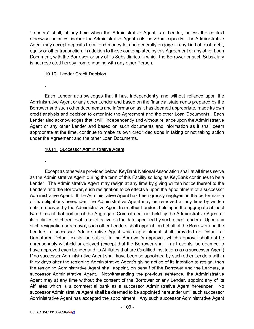 - 109 - US_ACTIVE\131002028\V-1-3 “Lenders” shall, at any time when the Administrative Agent is a Lender, unless the context otherwise indicates, include the Administrative Agent in its individual capacity. The Administrative Agent may accept deposits from, lend money to, and generally engage in any kind of trust, debt, equity or other transaction, in addition to those contemplated by this Agreement or any other Loan Document, with the Borrower or any of its Subsidiaries in which the Borrower or such Subsidiary is not restricted hereby from engaging with any other Person. 10.10. Lender Credit Decision . Each Lender acknowledges that it has, independently and without reliance upon the Administrative Agent or any other Lender and based on the financial statements prepared by the Borrower and such other documents and information as it has deemed appropriate, made its own credit analysis and decision to enter into the Agreement and the other Loan Documents. Each Lender also acknowledges that it will, independently and without reliance upon the Administrative Agent or any other Lender and based on such documents and information as it shall deem appropriate at the time, continue to make its own credit decisions in taking or not taking action under the Agreement and the other Loan Documents. 10.11. Successor Administrative Agent . Except as otherwise provided below, KeyBank National Association shall at all times serve as the Administrative Agent during the term of this Facility so long as KeyBank continues to be a Lender. The Administrative Agent may resign at any time by giving written notice thereof to the Lenders and the Borrower, such resignation to be effective upon the appointment of a successor Administrative Agent. If the Administrative Agent has been grossly negligent in the performance of its obligations hereunder, the Administrative Agent may be removed at any time by written notice received by the Administrative Agent from other Lenders holding in the aggregate at least two-thirds of that portion of the Aggregate Commitment not held by the Administrative Agent or its affiliates, such removal to be effective on the date specified by such other Lenders. Upon any such resignation or removal, such other Lenders shall appoint, on behalf of the Borrower and the Lenders, a successor Administrative Agent which appointment shall, provided no Default or Unmatured Default exists, be subject to the Borrower’s approval, which approval shall not be unreasonably withheld or delayed (except that the Borrower shall, in all events, be deemed to have approved each Lender and its Affiliates that are Qualified Institutions as a successor Agent) If no successor Administrative Agent shall have been so appointed by such other Lenders within thirty days after the resigning Administrative Agent’s giving notice of its intention to resign, then the resigning Administrative Agent shall appoint, on behalf of the Borrower and the Lenders, a successor Administrative Agent. Notwithstanding the previous sentence, the Administrative Agent may at any time without the consent of the Borrower or any Lender, appoint any of its Affiliates which is a commercial bank as a successor Administrative Agent hereunder. No successor Administrative Agent shall be deemed to be appointed hereunder until such successor Administrative Agent has accepted the appointment. Any such successor Administrative Agent